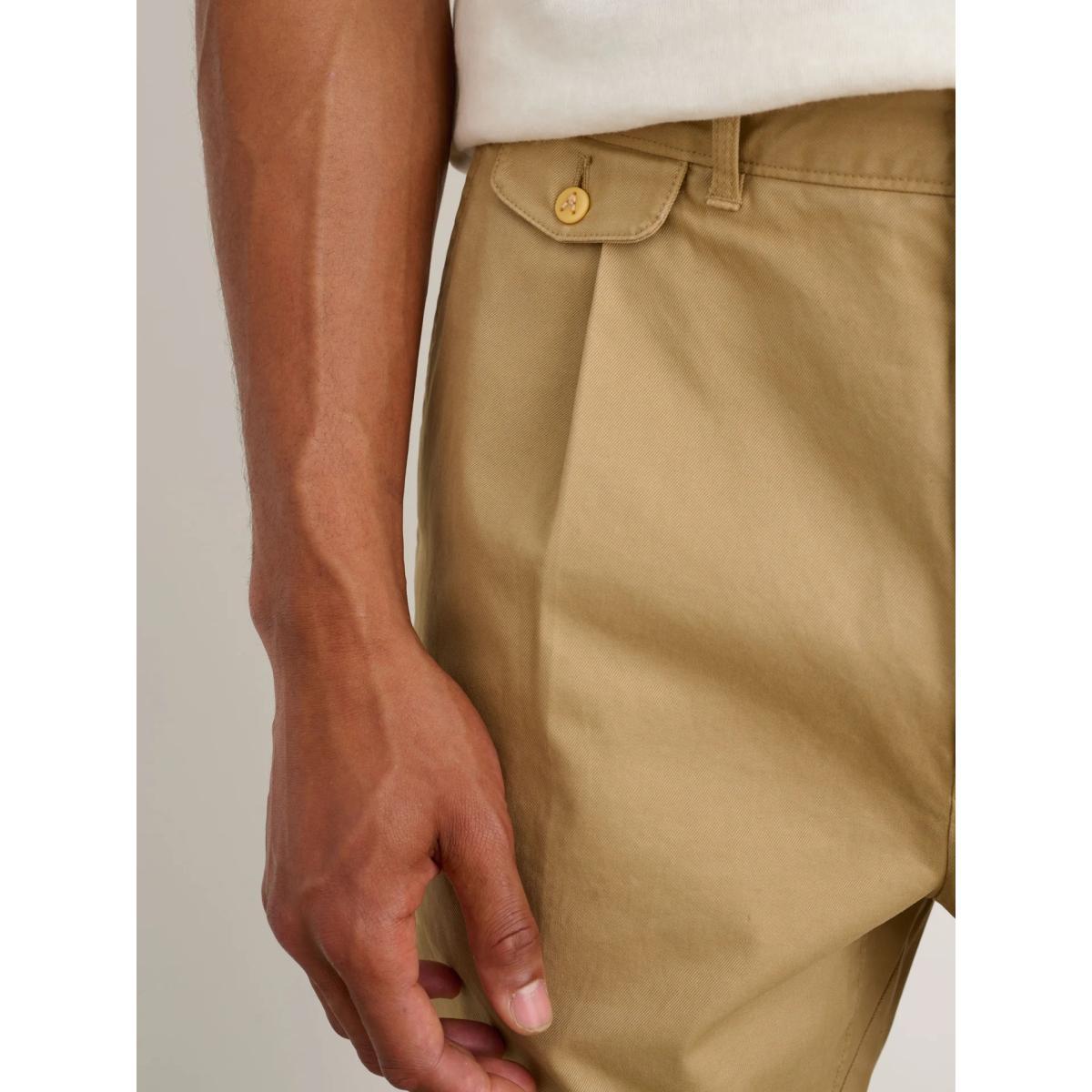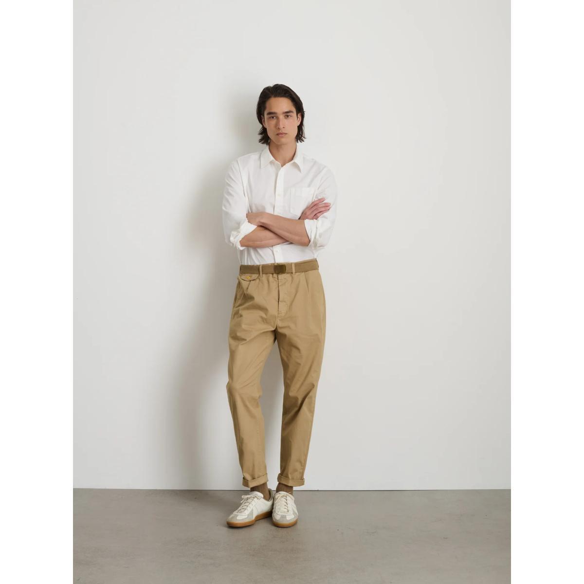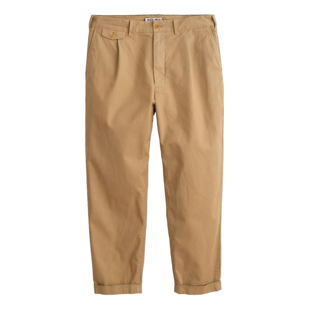 Alex Mill's signature pleated chino is made from a mid-weight cotton twill. 28" Inseam Garment-dyed for rich, nuanced color. Two front pleats. Zip-fly closure, coin pocket, and "X" belt loop at the back. Designed with a longer rise, relaxed through the thigh and tapered with a cuffed hem. Relaxed fit throughout. Sits below natural waist Due to the nature of the garment-dyeing process, slight variations in color should be expected. 98% cotton, 2% elastane