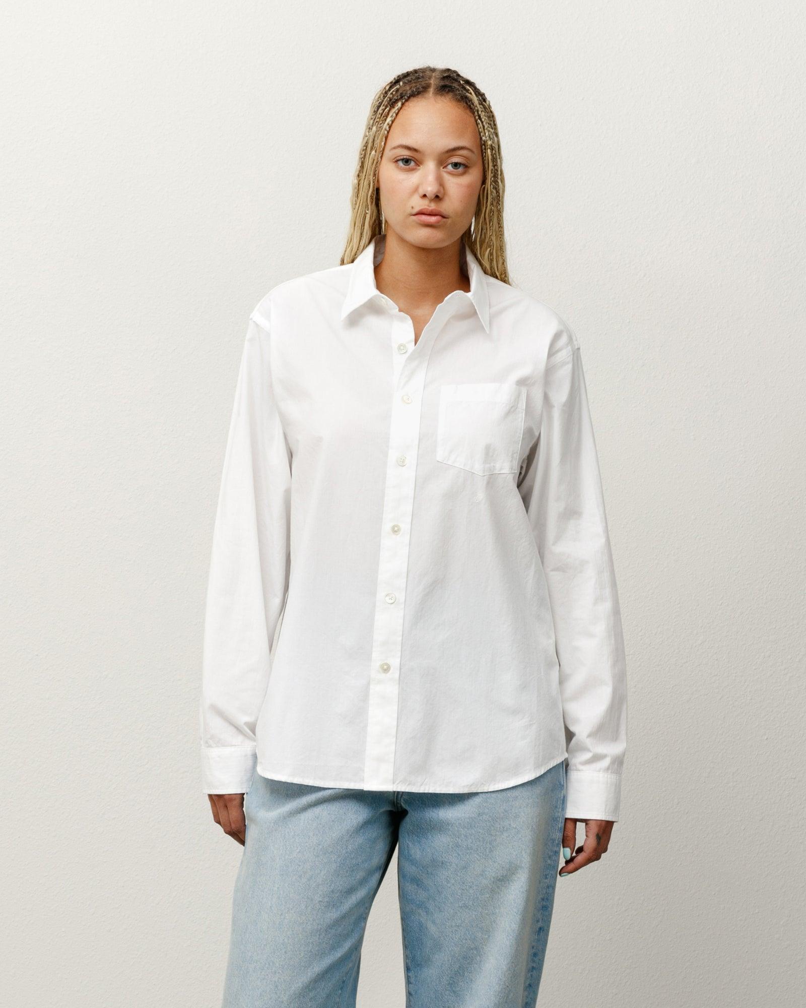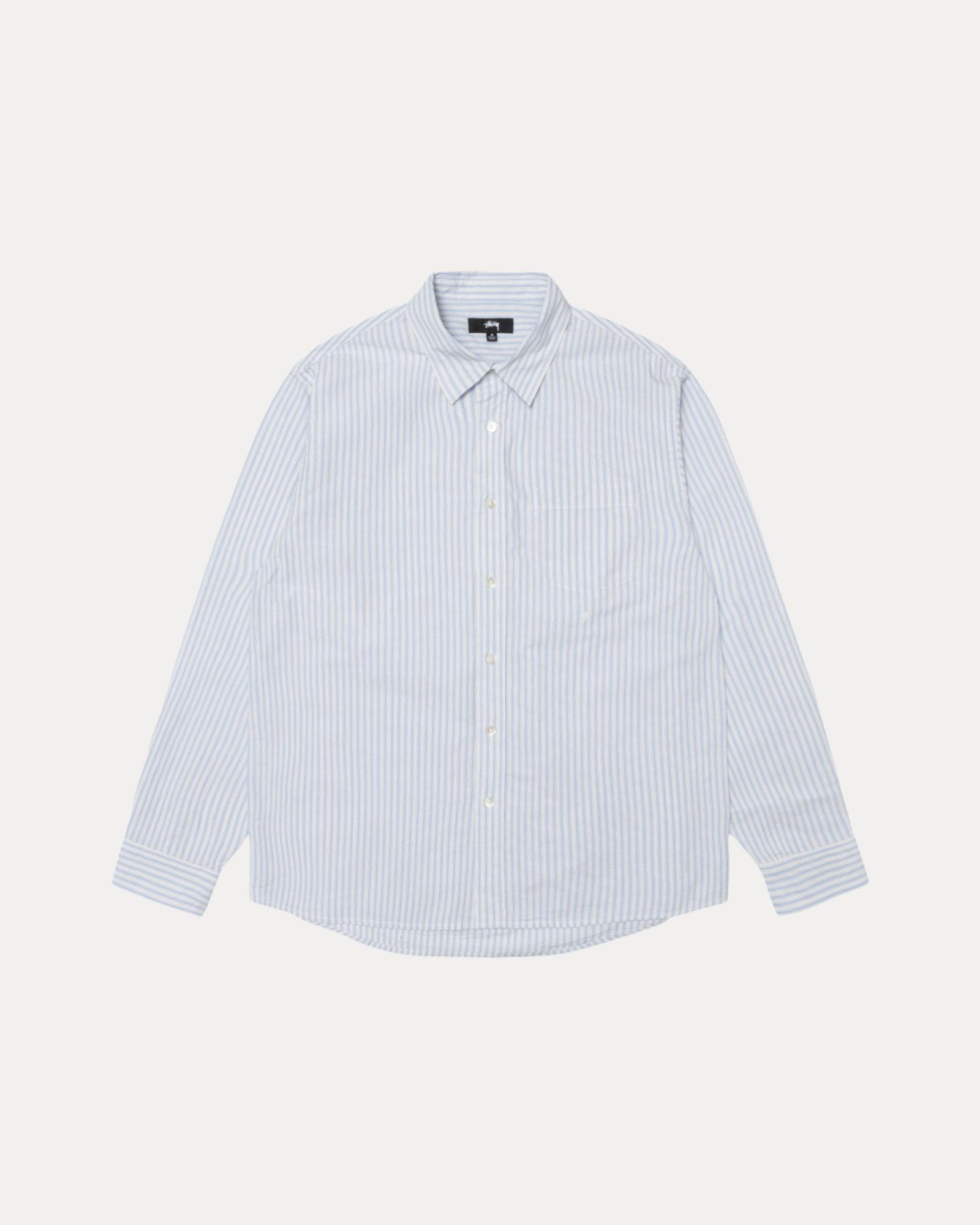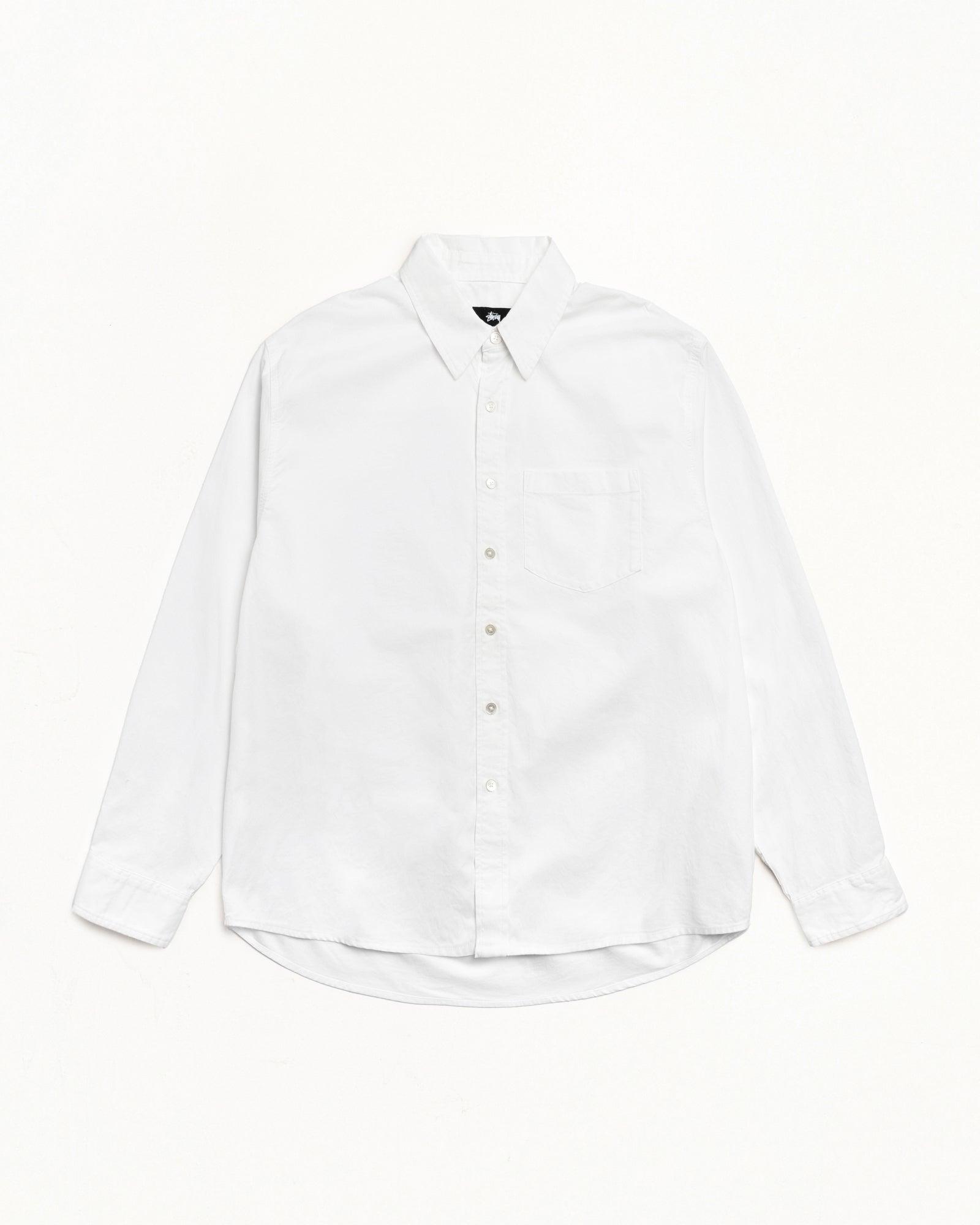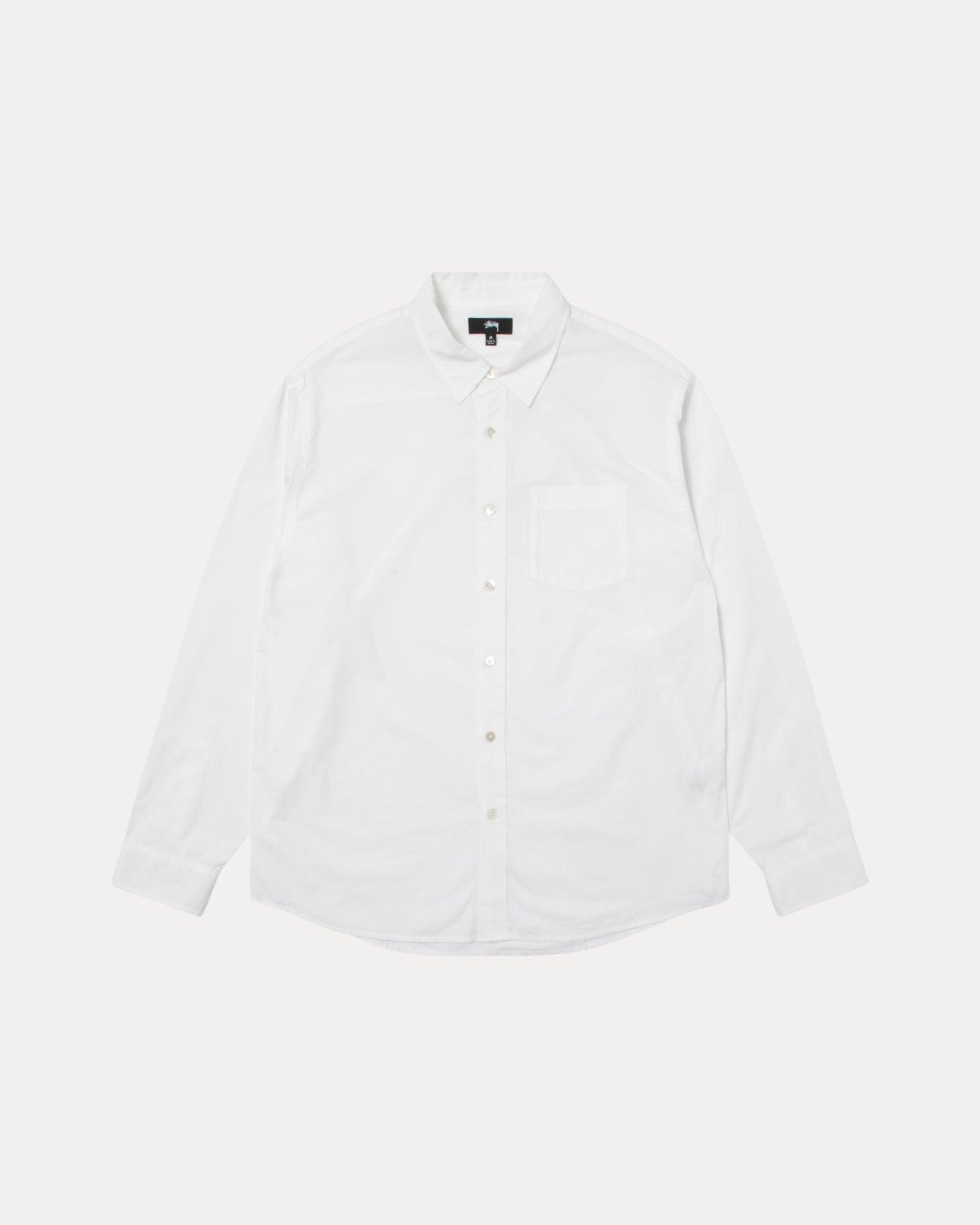 Boxy fit longsleeve shirt in lightweight washed organic cotton. Features a single patch pocket with Stüssy swirly "S" embroidery below. - Mother of pearl button closure - Buttoned pleated cuffs - Back yoke with hanger loop - Curved hem - Boxy fit - Unisex - Material: 100% organic cotton - Imported