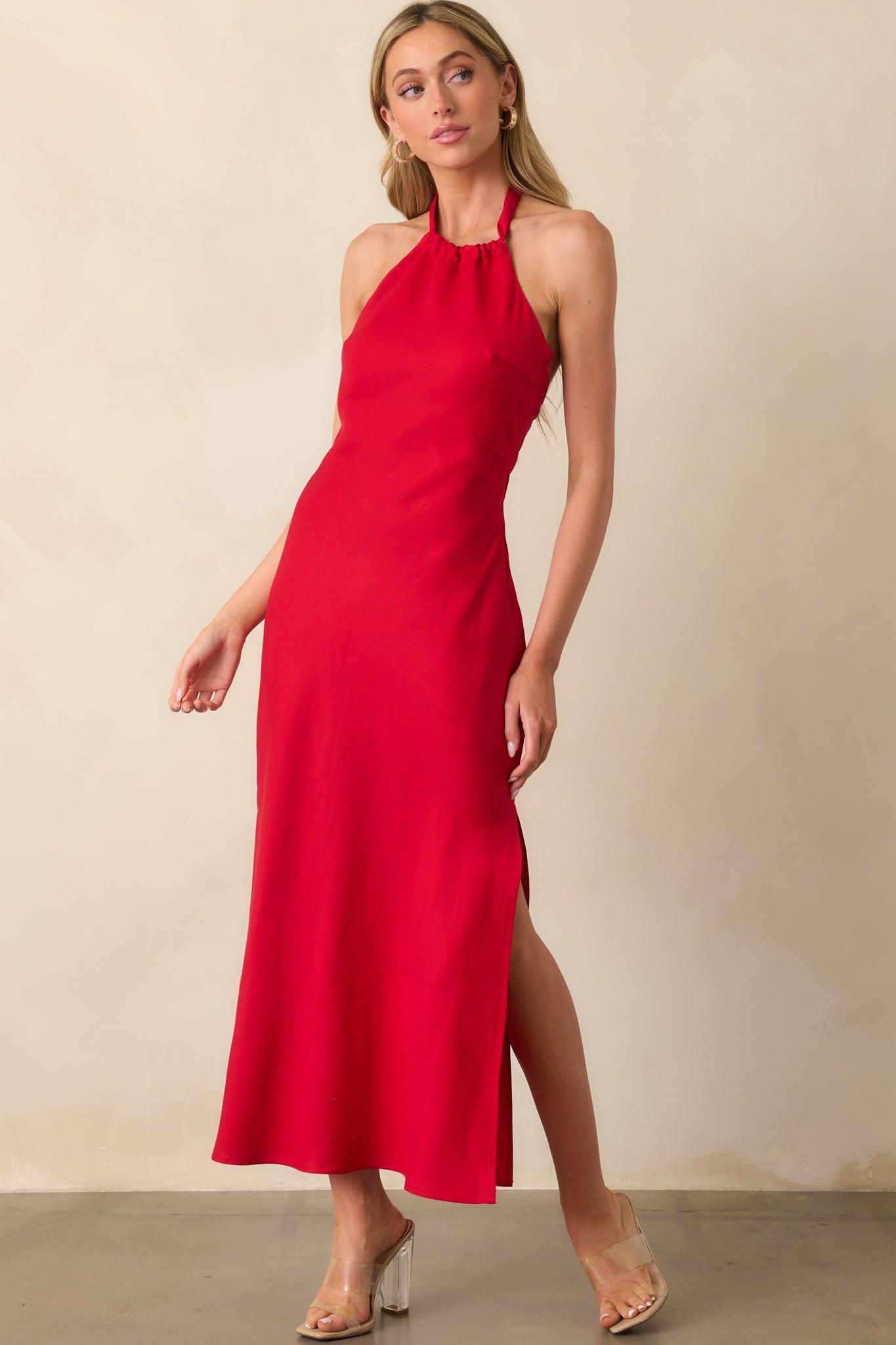 Staple The Label Red Linen Blend Amana Halter Bias Maxi Dress is made for moments that feel effortlessly special. With its bold spirit and timeless ease, it’s the kind of piece that turns a simple outing into something worth remembering. This red maxi dress features a self-tie halter neckline, open back design, side leg slits, fitted bodice, and a hidden side zipper.
