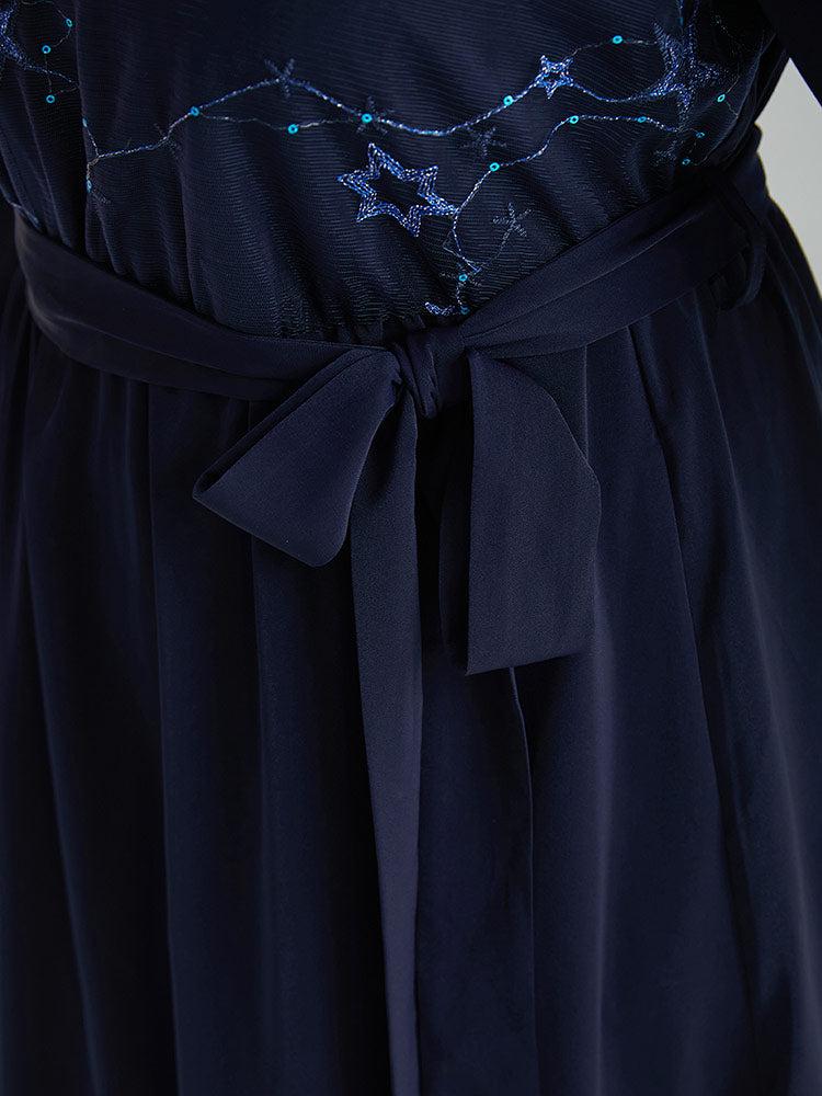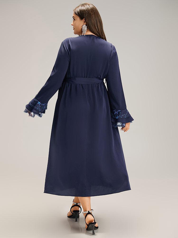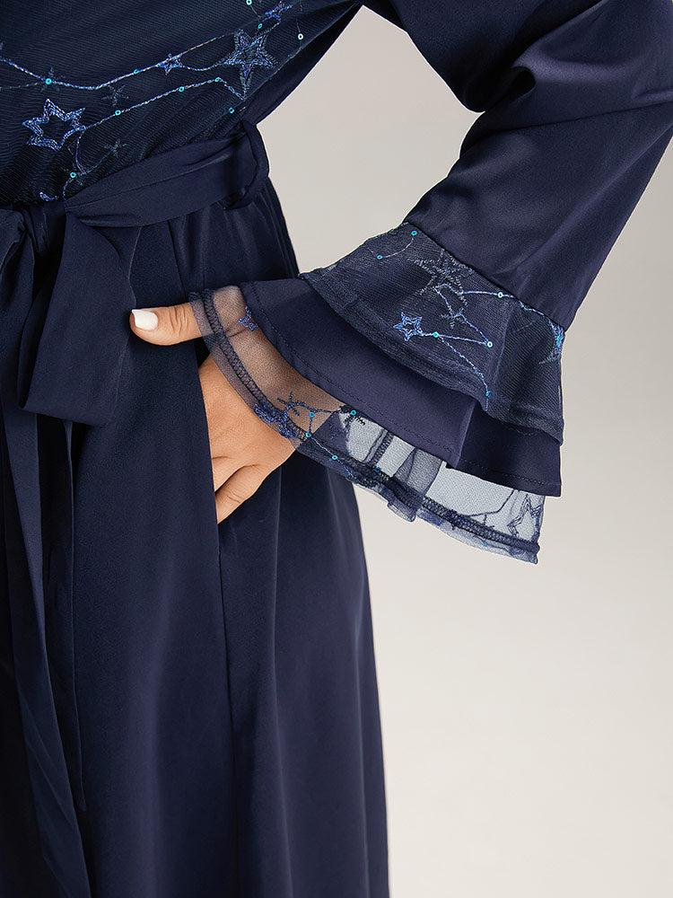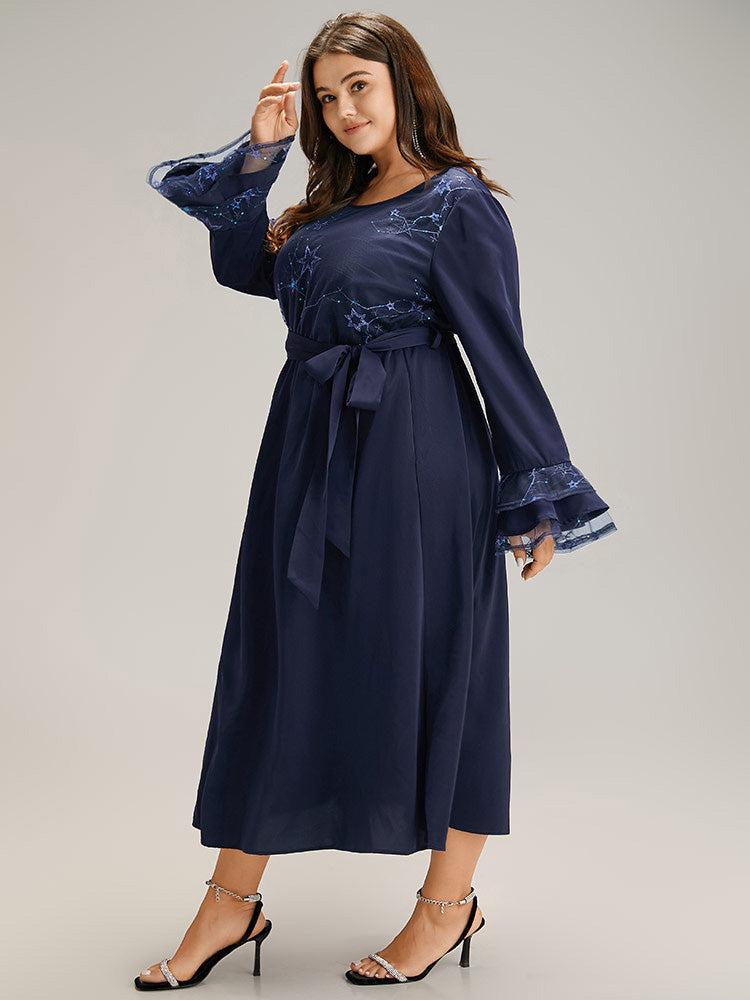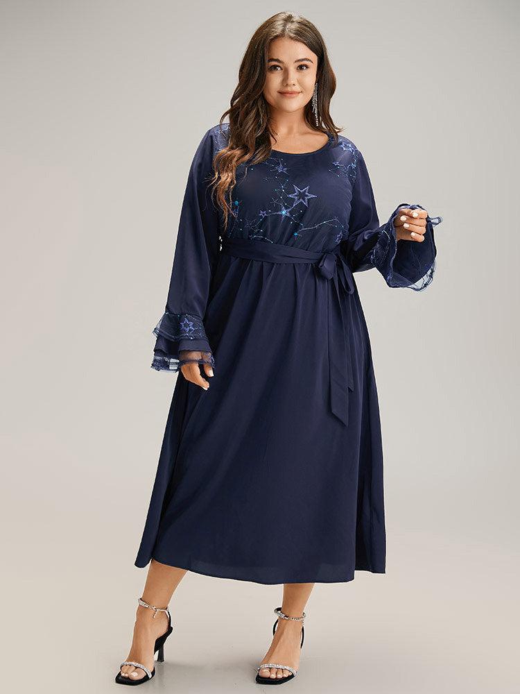 Shop Star Sequin Mesh Layered Sleeve Dress now and redefine your style with confidence at BloomChic. Tailored for mid and plus-size women. This trendy Dress, sizes 10-30. You can never go wrong with BloomChic Dresses. Season:Winter;Color:DarkBlue;Style:Party;Neckline:Round Neck;Sleeve Type:Bell Sleeve;Pattern Type:Star and moon;Details:Pocket, Elastic Waist, Patchwork, Printed, Belted;Pocket:It is perfectly sized to carry a phone.;Belt:Belt