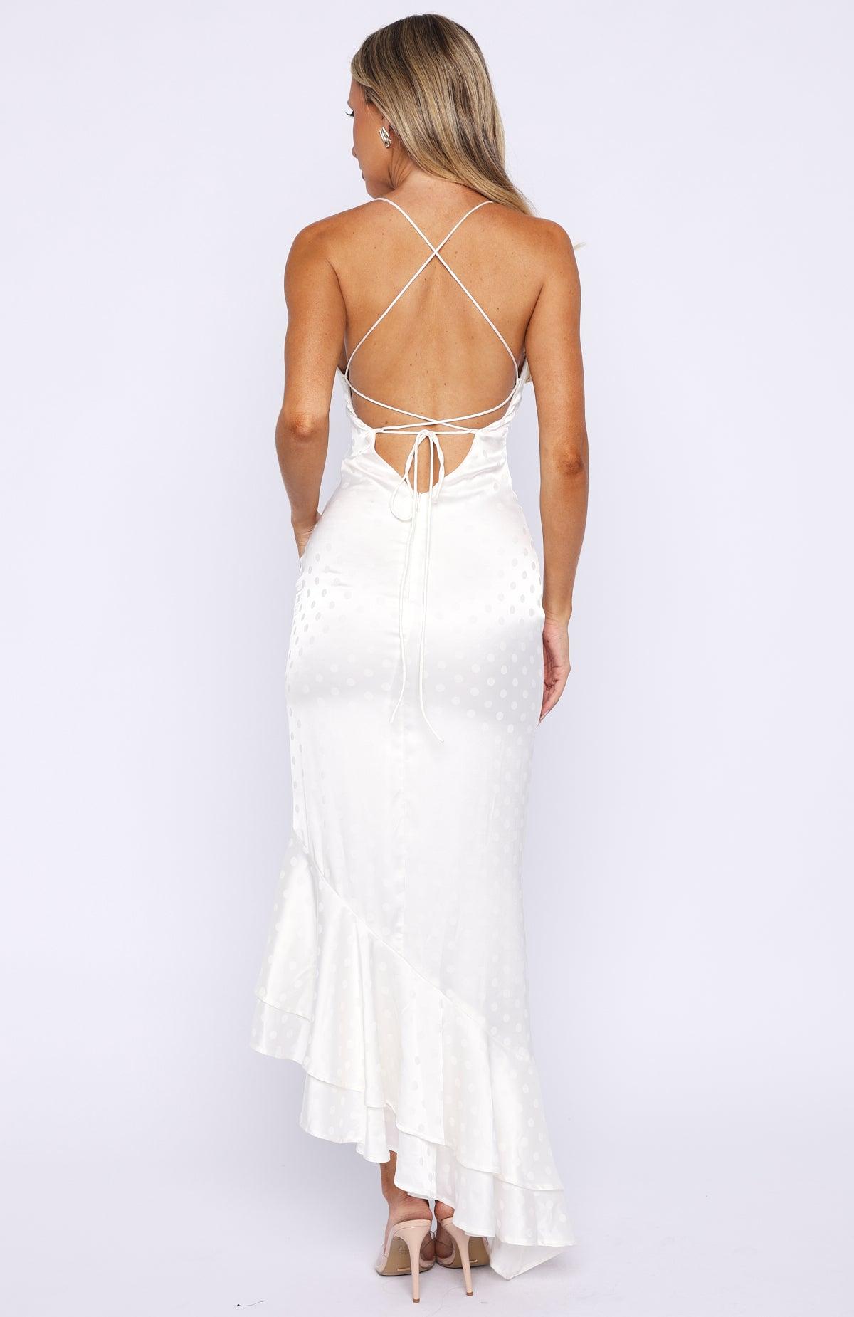 Look your best at your wedding rehearsal in the Starlit Skies Maxi Dress in Off White. Features thin adjustable shoulder straps that criss-cross at the back, a flattering scoop neckline, and a asymmetrical hem with frill detail accented by a playful polka-dot pattern. Finished with a open back, invisible zipper with hook-and-eye closure, and silk-feel fabric with full lining. Style with simple heels and delicate gold jewellery for a timeless, occasion-ready look.