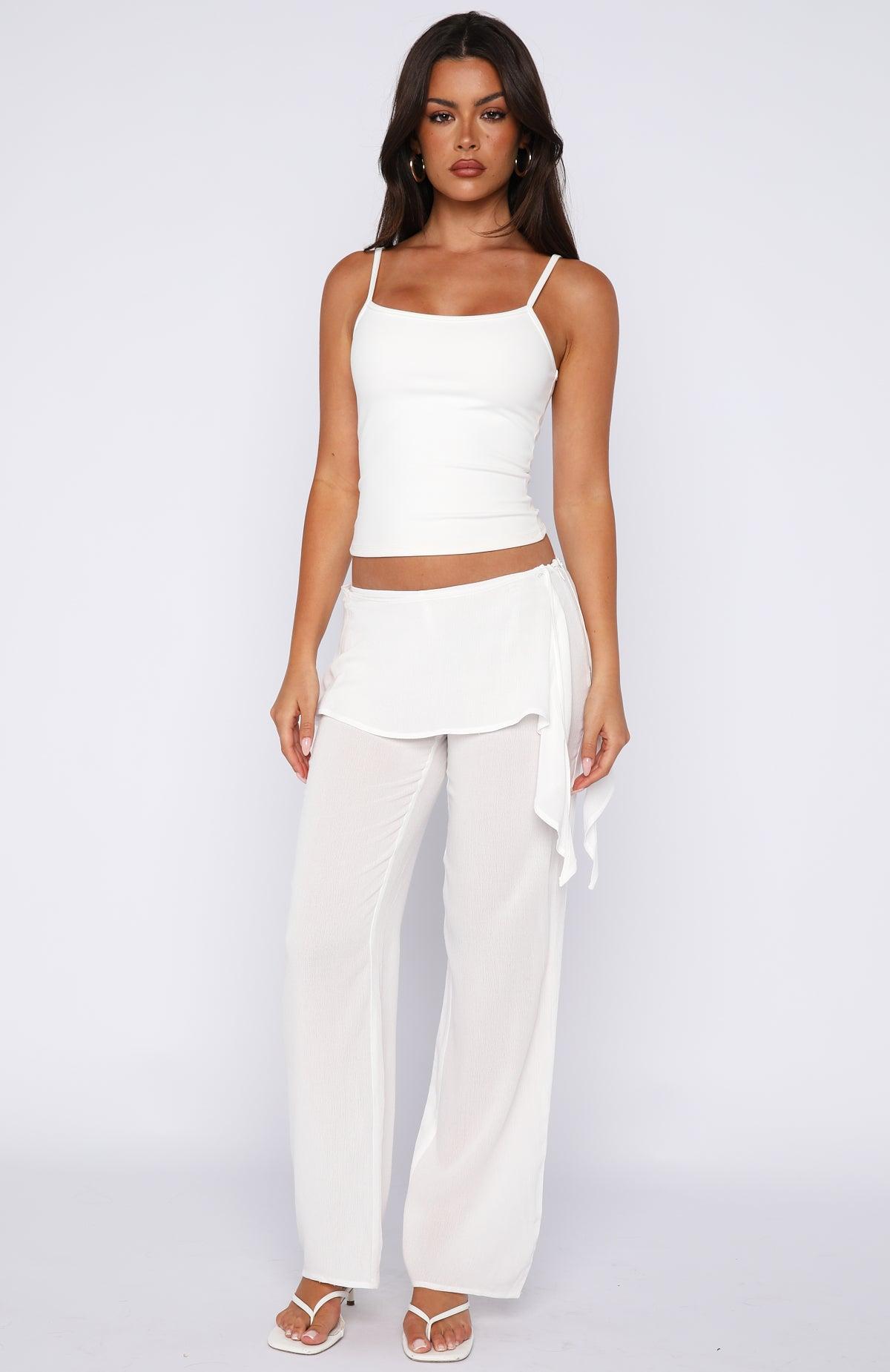 Slow mornings like these call for the Start Me Up Pants in White. These effortless pants feature a fixed waistband with wrapped-around fabric that drapes into a tassel and secures at the side with a button, a relaxed wide-leg silhouette, and a subtle side zipper with hook-and-eye closure. Unlined for breezy comfort. They pair perfectly with a basic tank, sandals, and sunnies for a laid-back market stroll.
