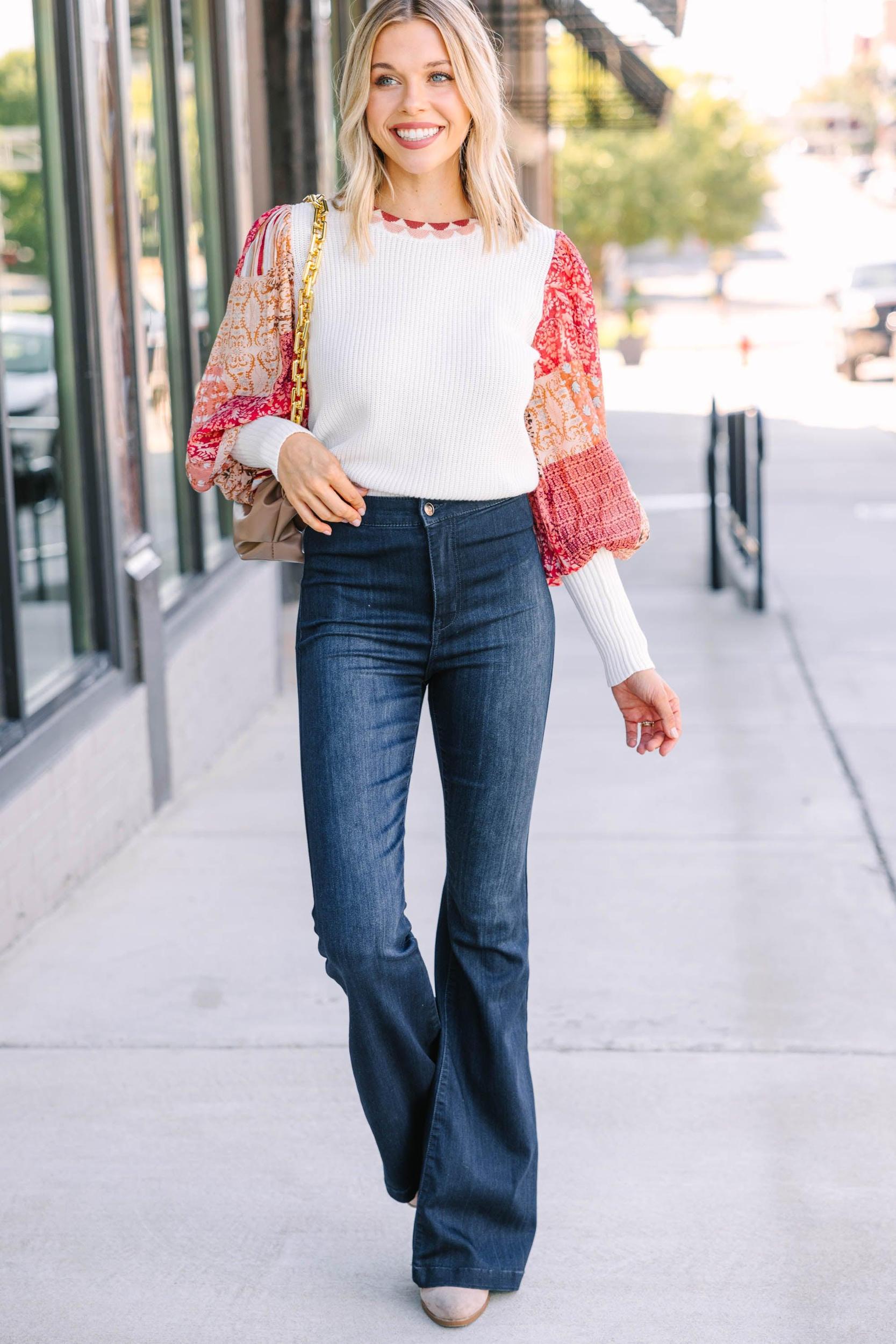 This sweater is going to be the start of so many memories! Those dramatic printed bubble sleeves absolutely fabulous! The really take this sweater to the next level! Plus, the sleeves are fully lined so they aren't sheer and they will still keep you cozy and warm! This sweater is going to look amazing with dark or light wash jeans this fall! This sweater features long bubble sleeves with a fun abstract print and long ribbed cuffs, a round neckline with scalloped detail, and knit fabric. Material has a fair amount of stretch.Cam is wearing the small.