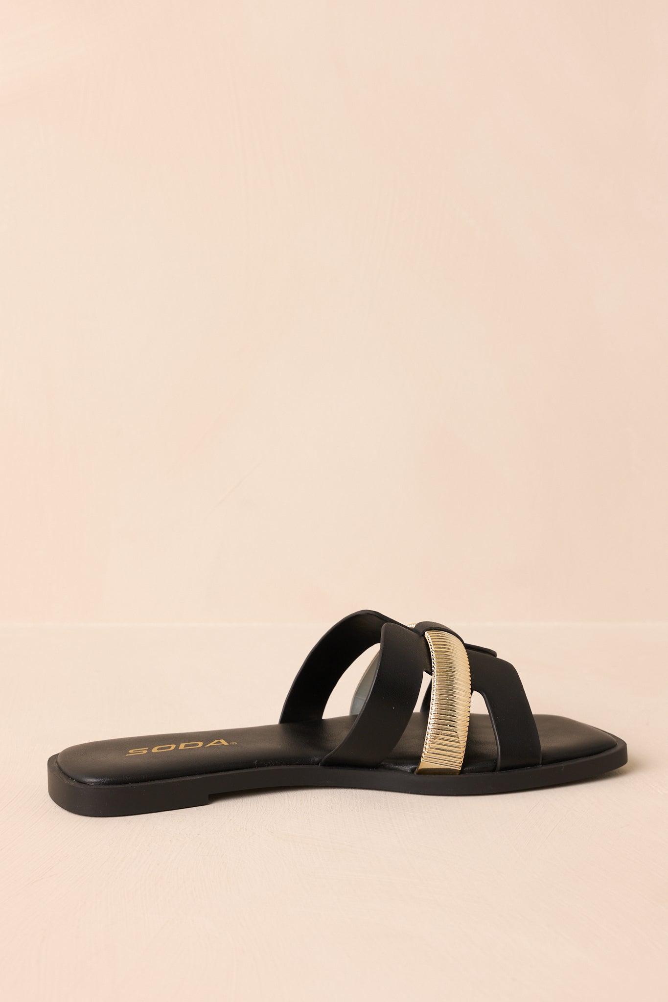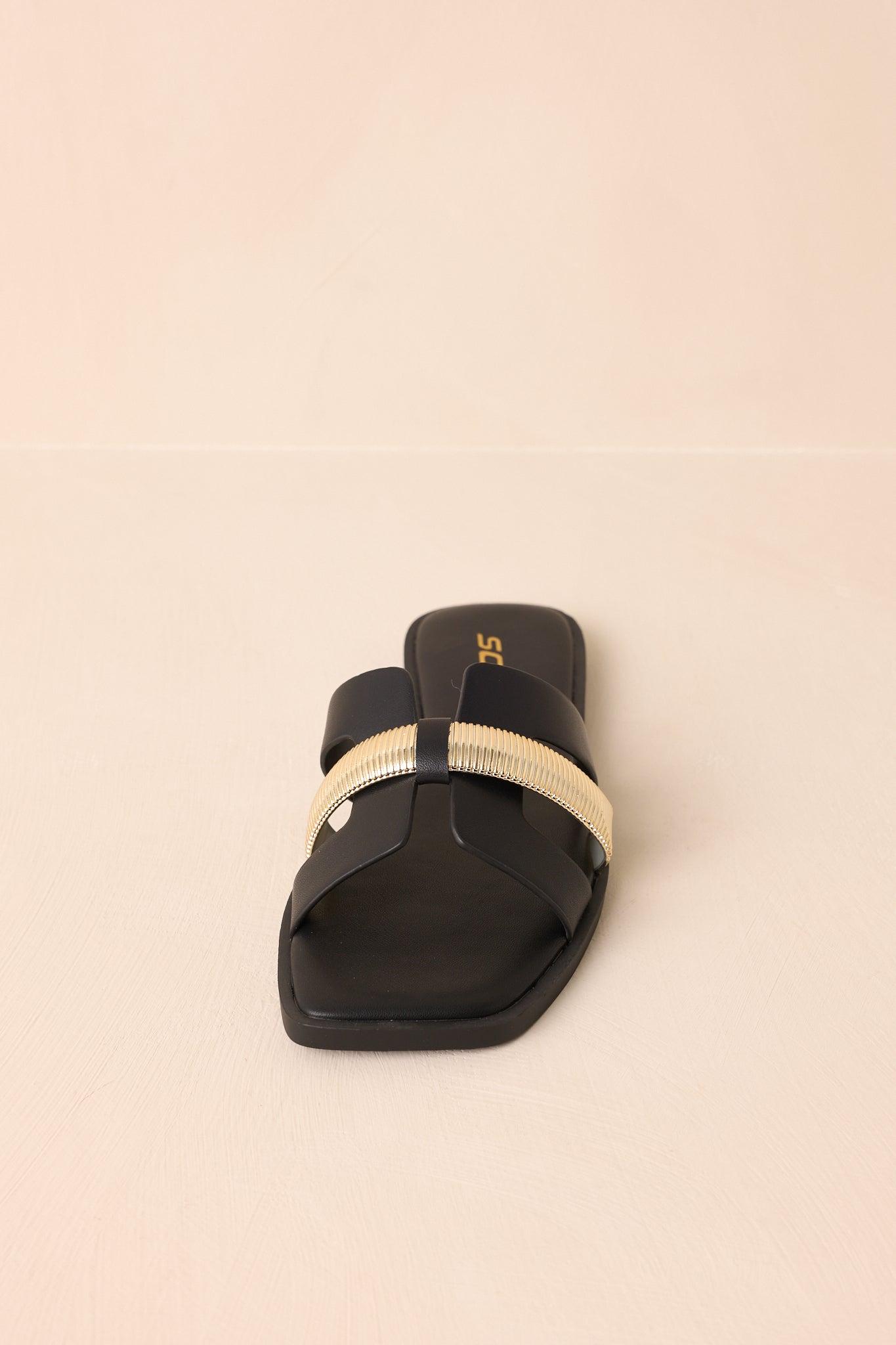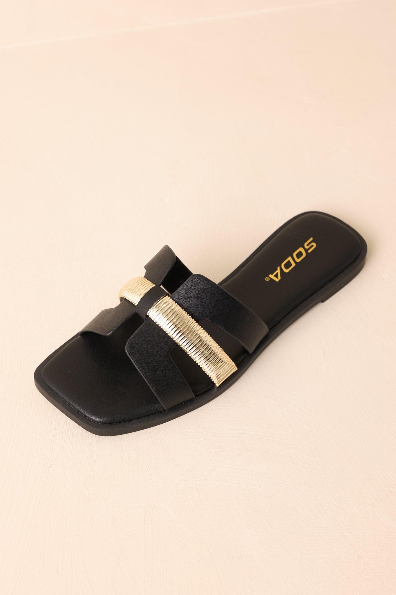 The Starting The Day Black Cut-Out Flat Slide Sandals are a chic choice for adding a touch of effortless style to your morning routine. Their sleek design makes them perfect for those moments when you want to feel put-together yet relaxed, whether you're heading out or just starting your day at home. These black sandals feature a slide-on design, a black faux leather material, gold accent across the vamp, an open square-toe, and cutout details. All Man Made Materials Non-Skid Sole Imported True To Size