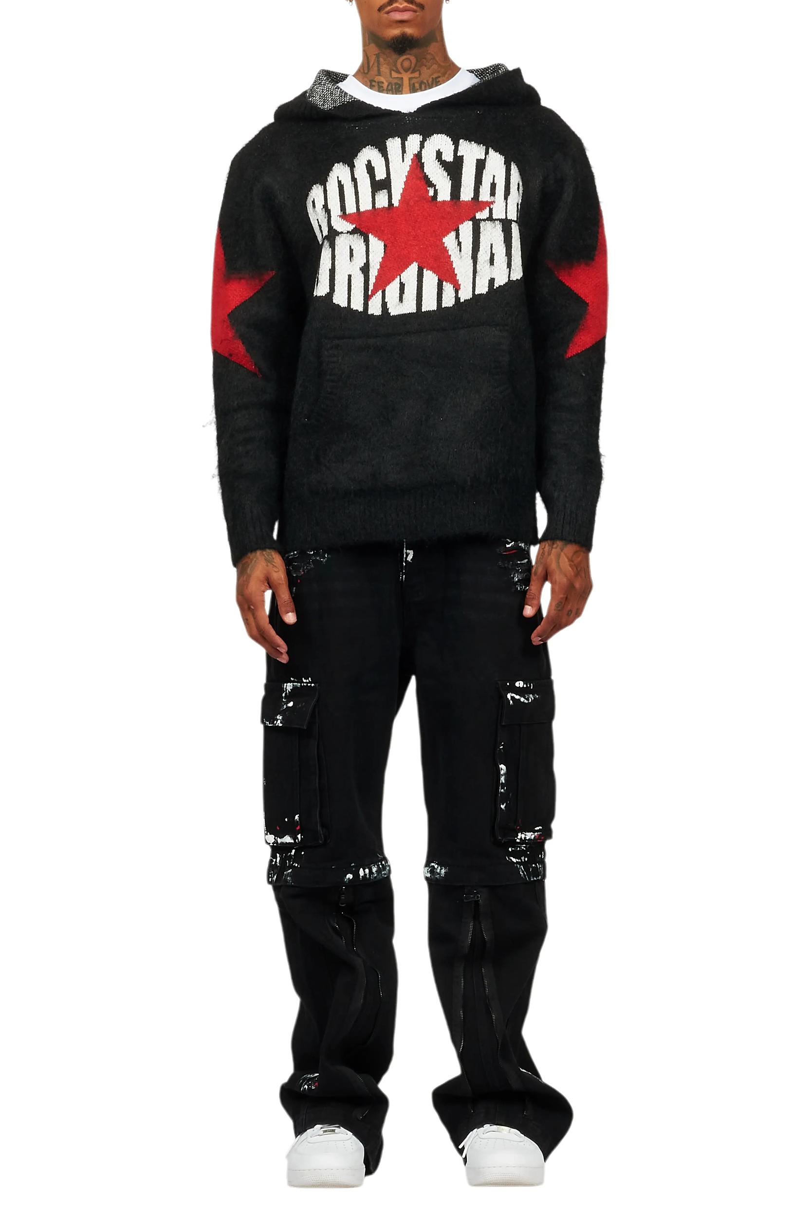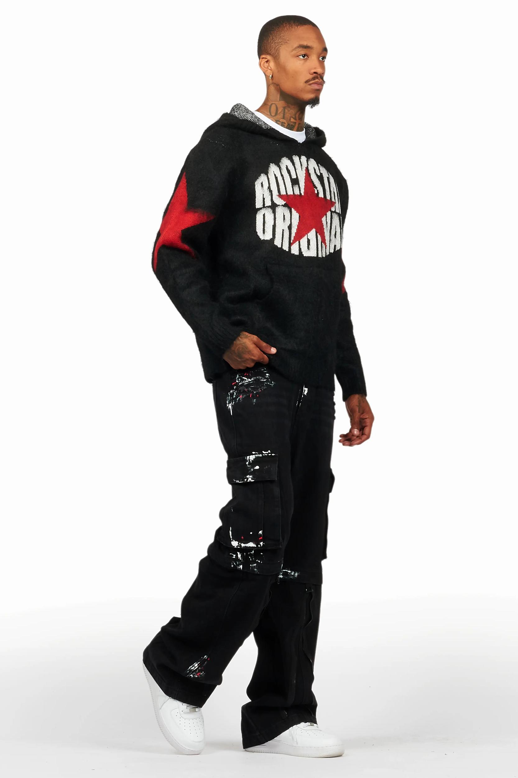An urban two-piece graphic knit hoodie and baggy cargo jean set for men. Designed with organic cotton and extra long legs for a dope streetwear outfit set. Hooded neckline Long sleeves Fuzzy knit Mohair fabric Regular-fit Printed RSO logo Zip fly with button closure 7-pocket build Baggy construction 35.75" seams *NOTE: These jeans are purposefully designed with extra long legs so the fabric properly bunches at the hem, creating the stacked flare style.