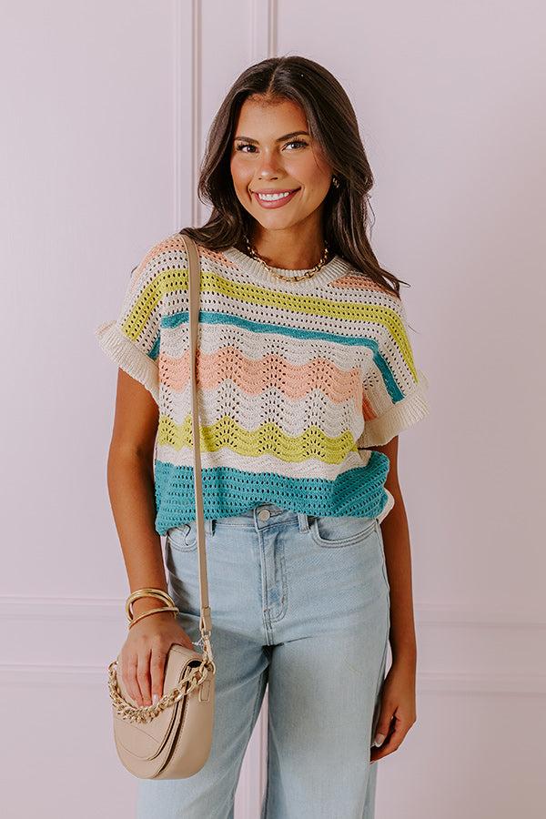 - Colorful and cute, this trendy top is a perfect addition to your stylish wardrobe! - Unlined knit material with an orange, green, and blue hued striped and scalloped pattern - A crew cut neckline - Short sleeves - A relaxed silhouette that ends in a ribbed hemline