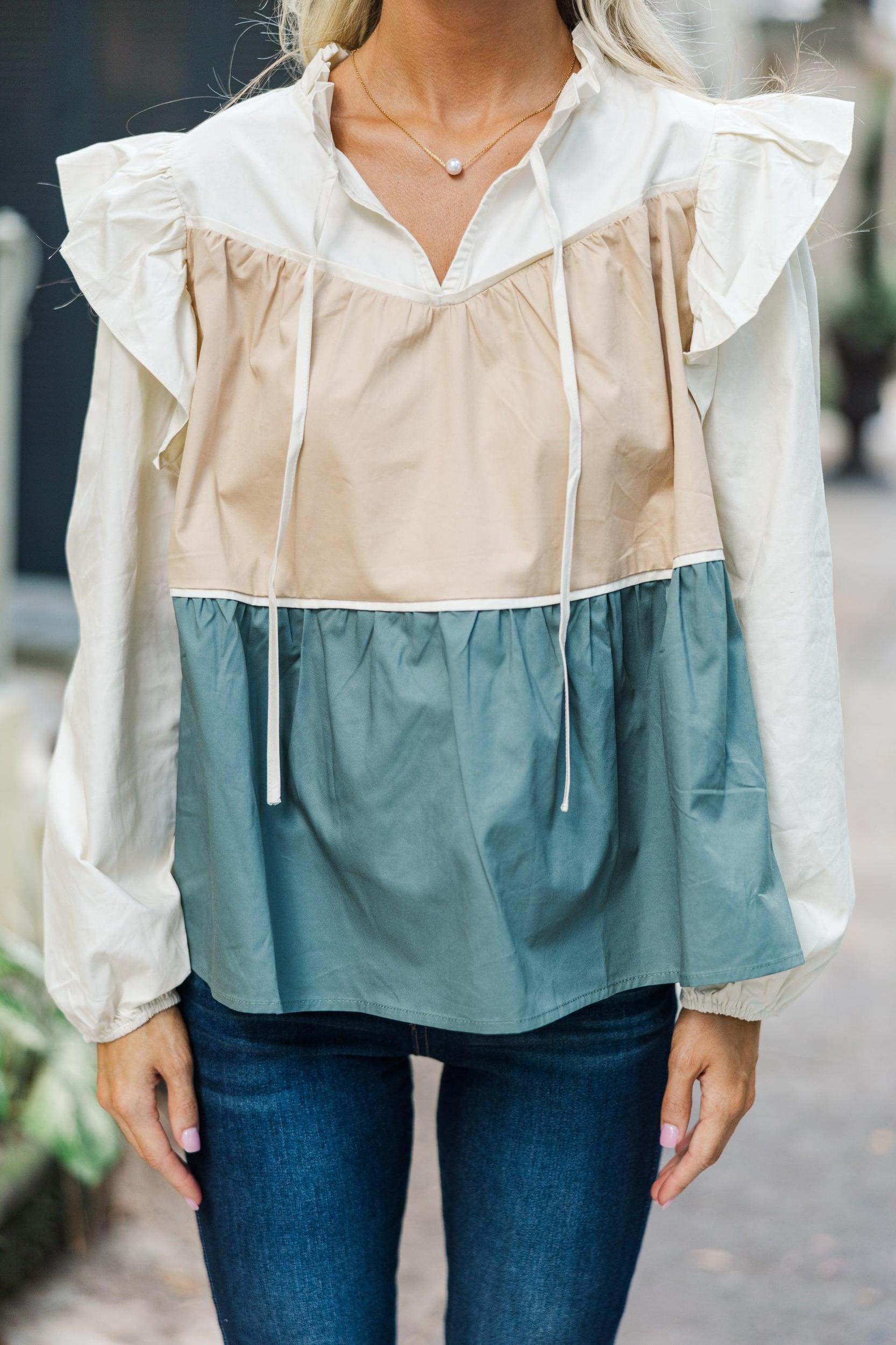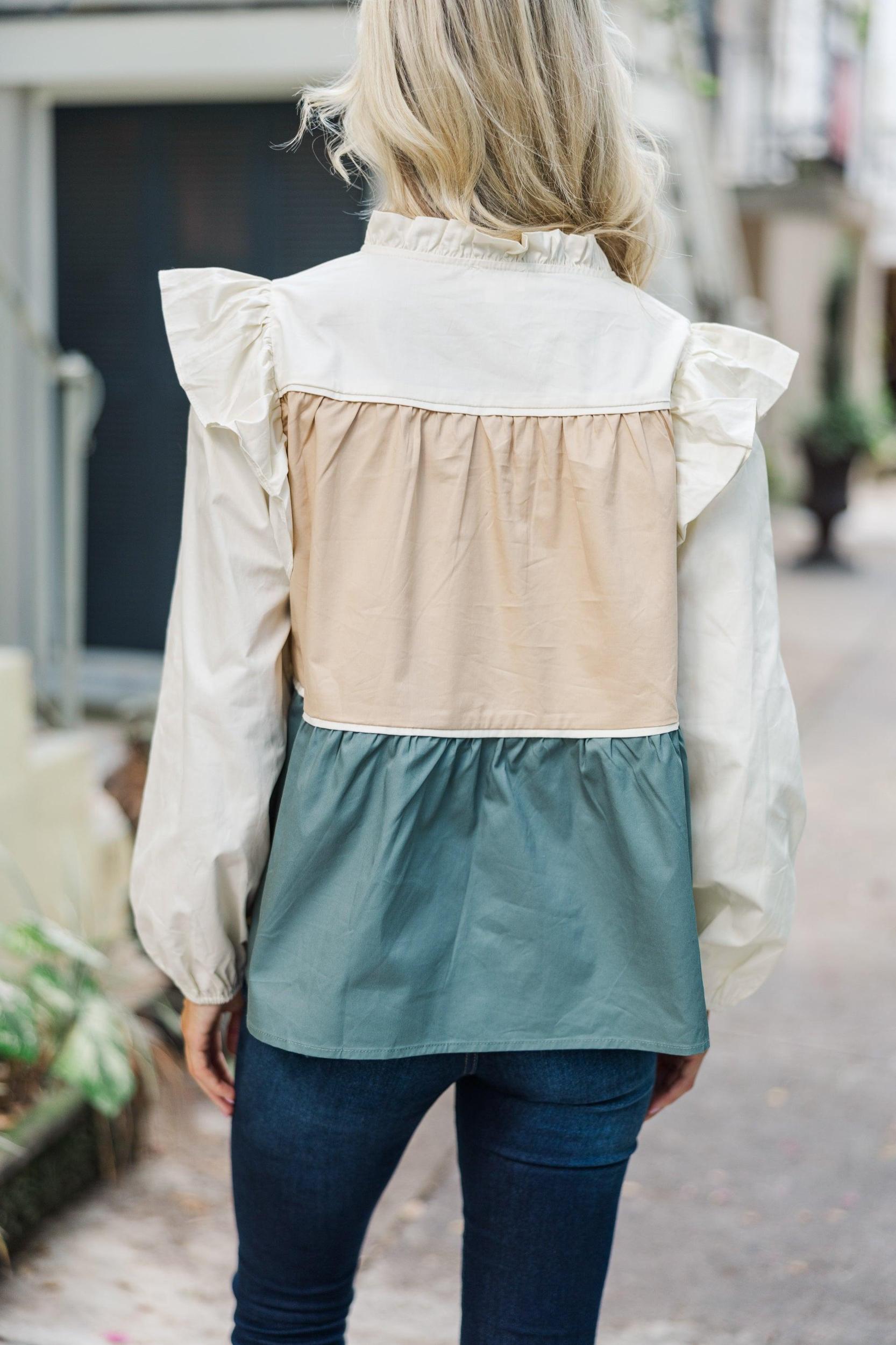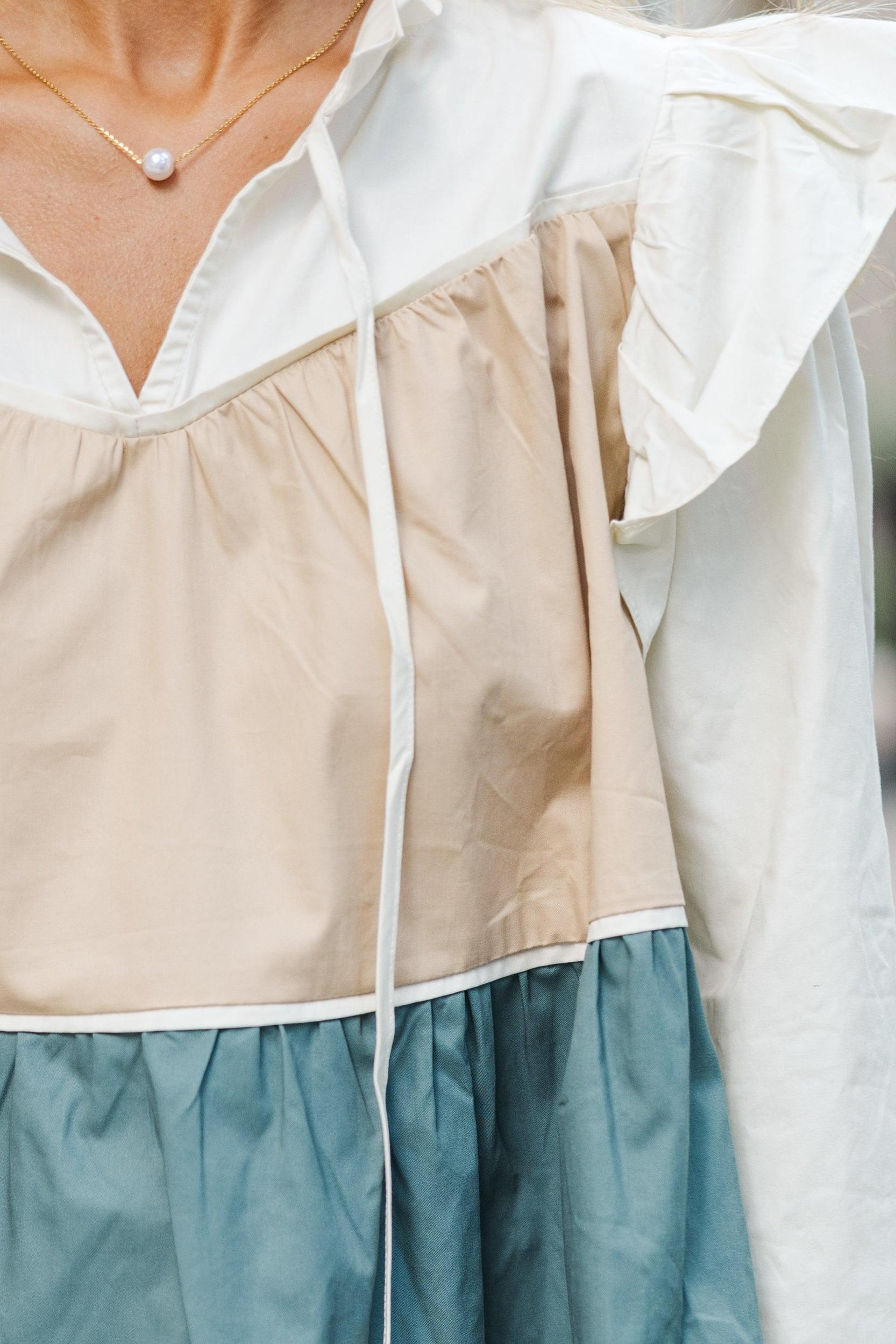 This adorable babydoll blouse is going to stay on your mind for sure! It's just so cute! We love that colorblocking and those colors look amazing together! The flowy fit also makes it very comfy! V-neckline Long sleeves Ruffled shoulder detail Colorblock print No stretch Baileigh is wearing the small.