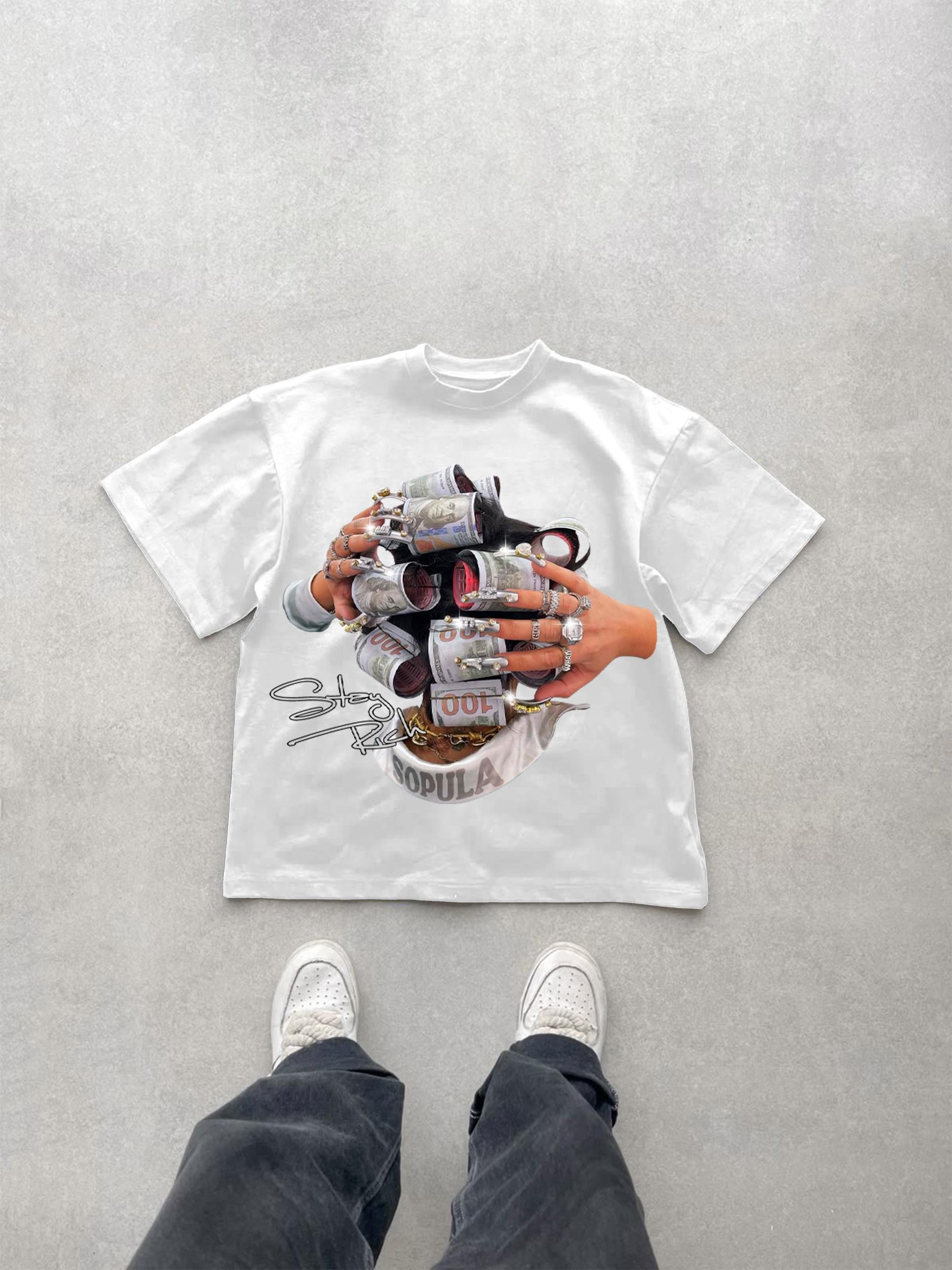 Stay Rich In Street Culture Portrait Graphic Cotton T-shirt. SPU: CP-229586-WJY Fabric: 100% Cotton Fabric Weight: 180g Pattern: Culture Portrait Graphic Process: Printed Gender: Women,Men Season: Summer Size Range: S-3XL Color: Black,Coffee,White,Pink Print Position: Front