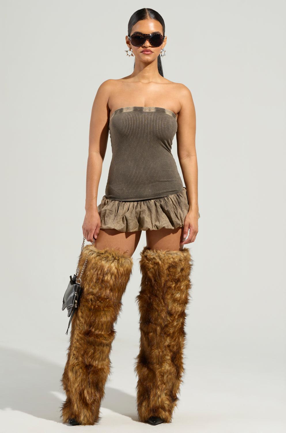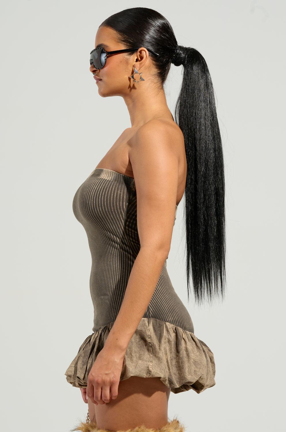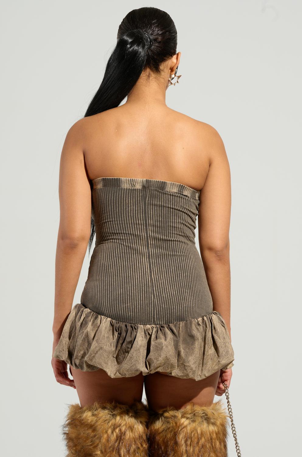 The AKIRA Label Stay With Me Mini Dress is a sweet style that is crafted from a stretchy, cotton knit base and features a subtle washed colorway, a strapless elasticized neckline, a ribbed knit bodice, and a structured, ruched bubble mini skirt. Complete with a bodycon fit, a mini length, and an easy, pull-on design. Pair with platform pumps, a bold lip, and a shoulder bag for a finished look. - Self: 94% Cotton 6% Spandex, Contrast: 95% Cotton 5% Spandex- Hand Wash Cold- Stretchy- Imported (all measurements approximate from size small)- 21” Chest to Hem (unstretched) Product ID: 470167