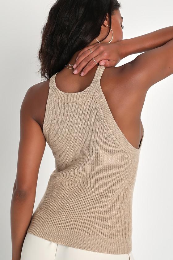 Even if you're not traveling far, you'll still be looking like getaway goals in the Lulus Staycation Sweetie Taupe Knit High Neck Tank Top! Cozy sweater knit shapes this cute tank top that has a high neckline and a relaxed, sleeveless bodice. Contrasting ribbed knit accents the neckline, armholes, and hem. Pair with your favorite gold jewelry for a luxe look!