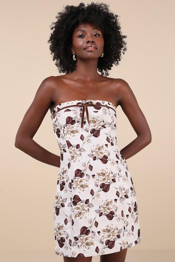 The Glamorous Staying Charming Light Grey Floral Jacquard Strapless Mini Dress is an exceptional option for any occasion that deserves a simply sweet look! A chic floral jacquard design adorns sleek woven fabric as it shapes this darling dress that features a strapless bodice (with hidden no-slip strips) and a straight neckline accented with brown velvet ribbon trim and a dainty bow detail. The sultry bodycon silhouette will effortlessly flatter your figure as it falls to a cute mini hem. The same velvet ribbon creates a decorative lace-up-style design at the back for an ultra-trendy finish! Hidden side zipper.