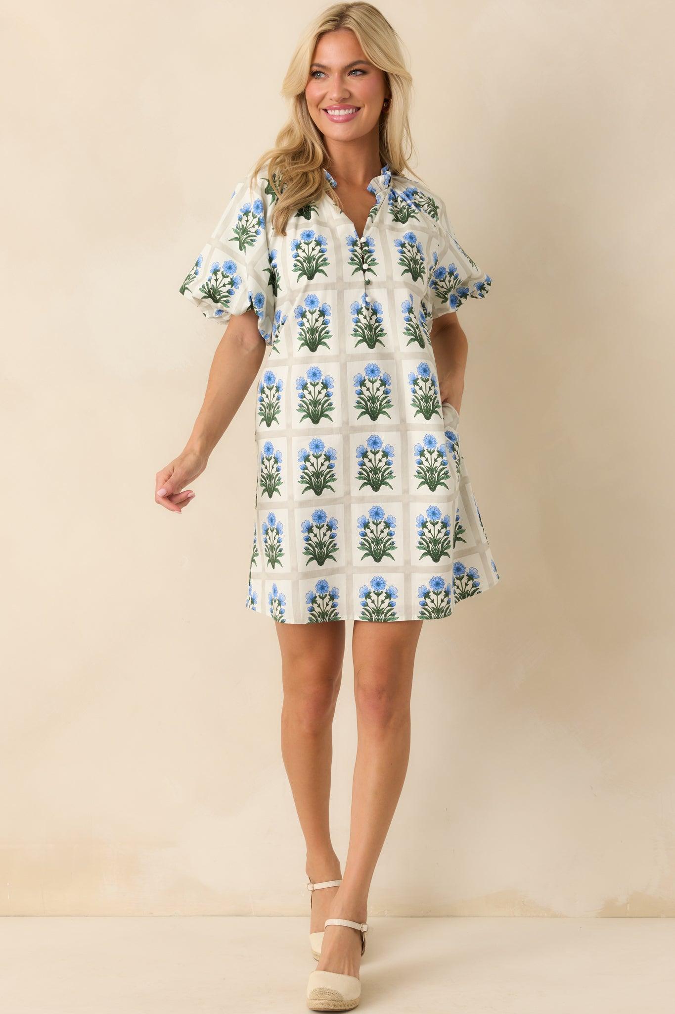 The Staying Hopeful Blue Geometric Floral Print Cotton Mini Dress will be the sweetest new addition to your wardrobe. Bright, breezy, and easy to wear for sunny days ahead. This mini dress features a geometric grid print, blue floral motifs in each square, ruffle trim notch v-neckline, functional button front bust, short puff sleeves, elastic cuffs, ivory lining, and functional pockets.