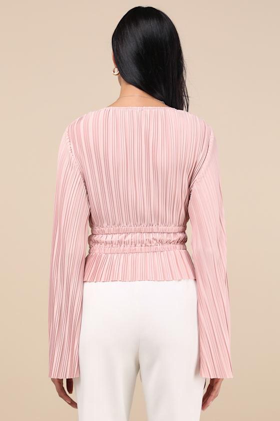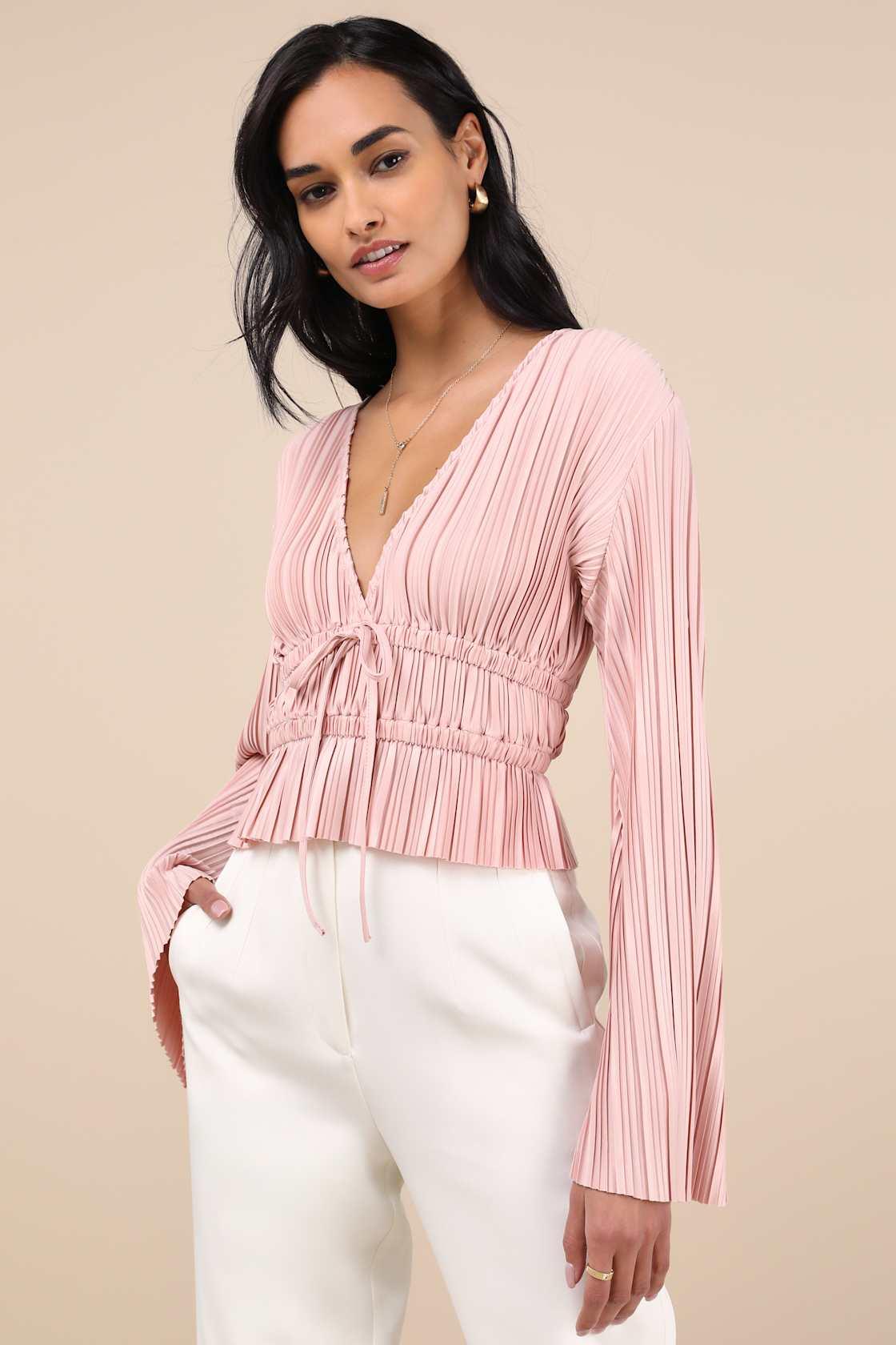 Start the day off on a positive note with the Lulus Staying Optimistic Light Pink Pleated Bell Sleeve Top! Pleated satiny woven fabric shapes this top that has a plunging V-neckline and long bell sleeves. The fitted bodice is accented with tiers of elastic and a decorative tie at the front.