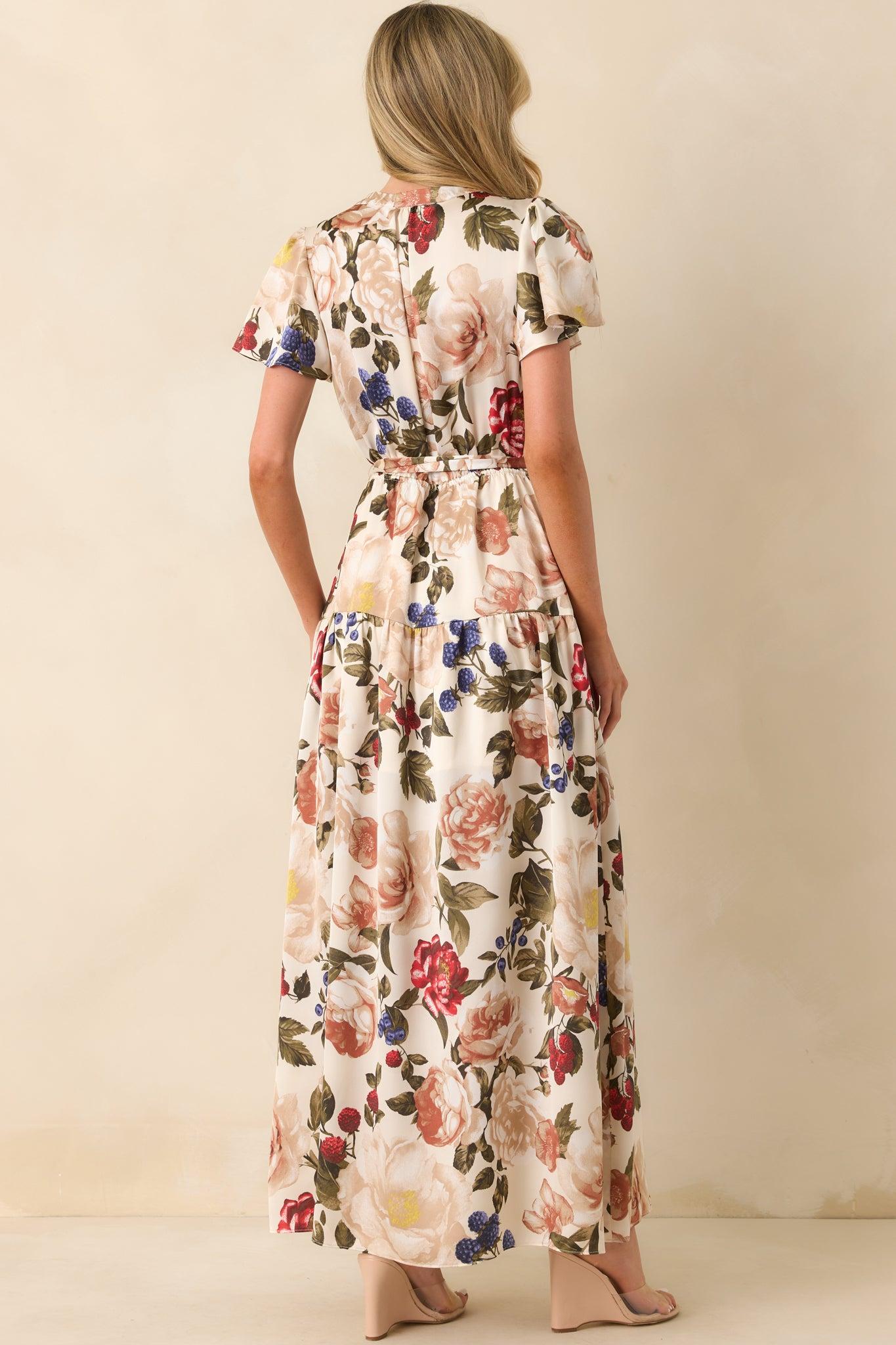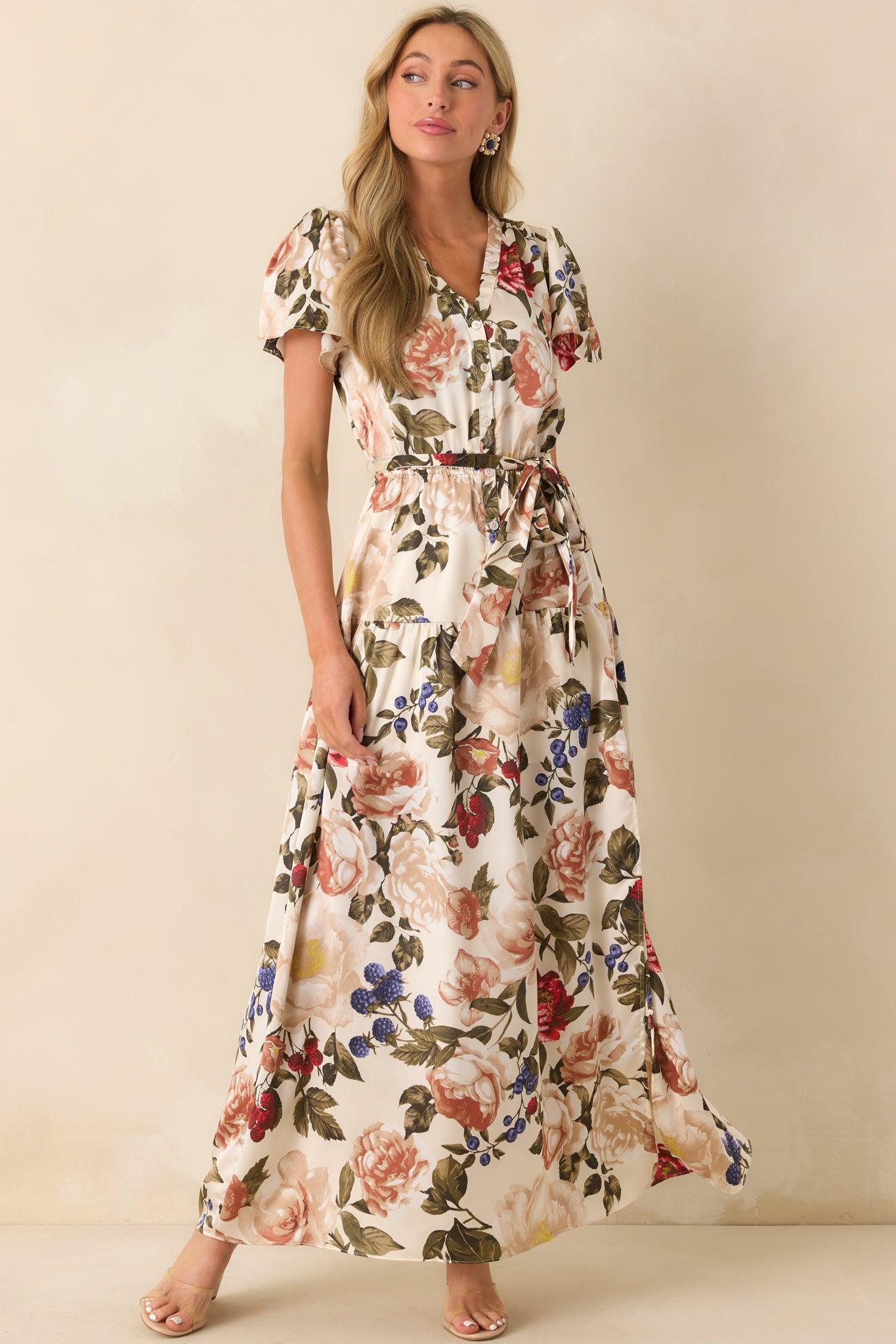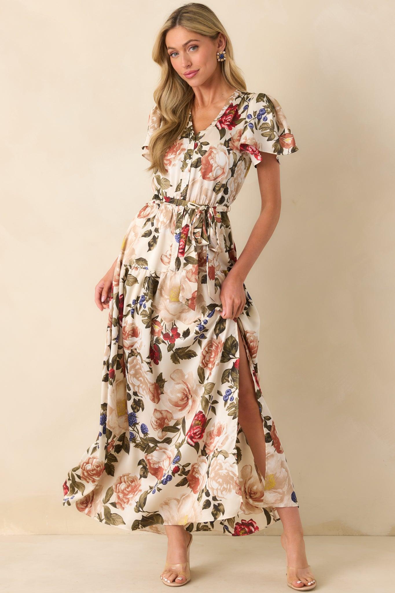 The Staying True Ivory Multi Floral Print Satin Maxi Dress captures the beauty of staying grounded in your own style. With its elegant flow and expressive print, it’s made for moments that call for confidence, softness, and something a little extra. This maxi dress features an ivory base color, and multicolor florals throughout, a v-neckline, short butterfly sleeves, functional button front bodice, elastic waistband, optional self-tie belt, and a leg slit.