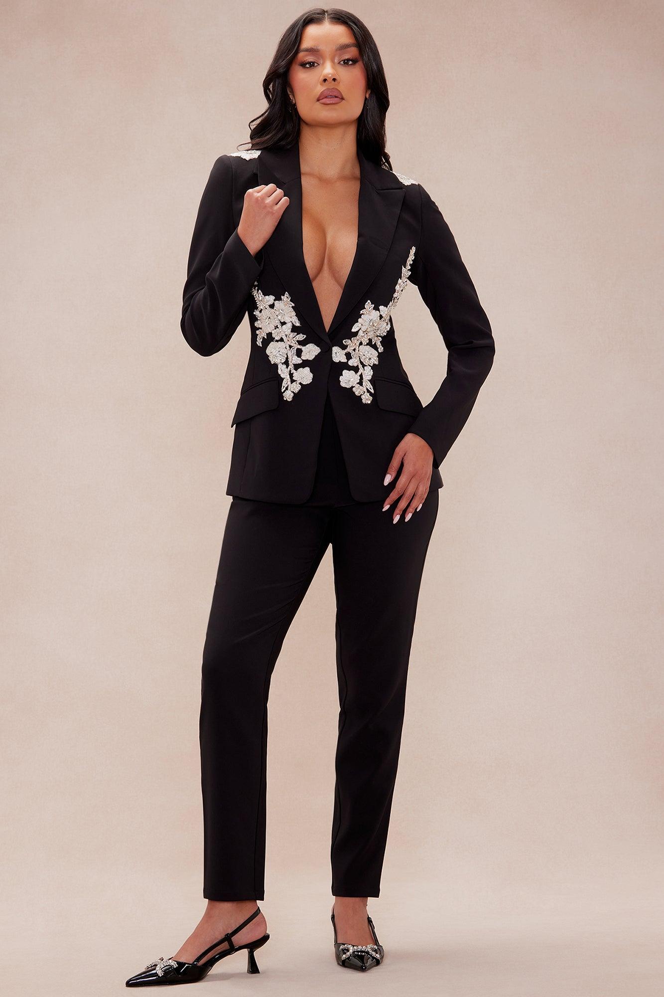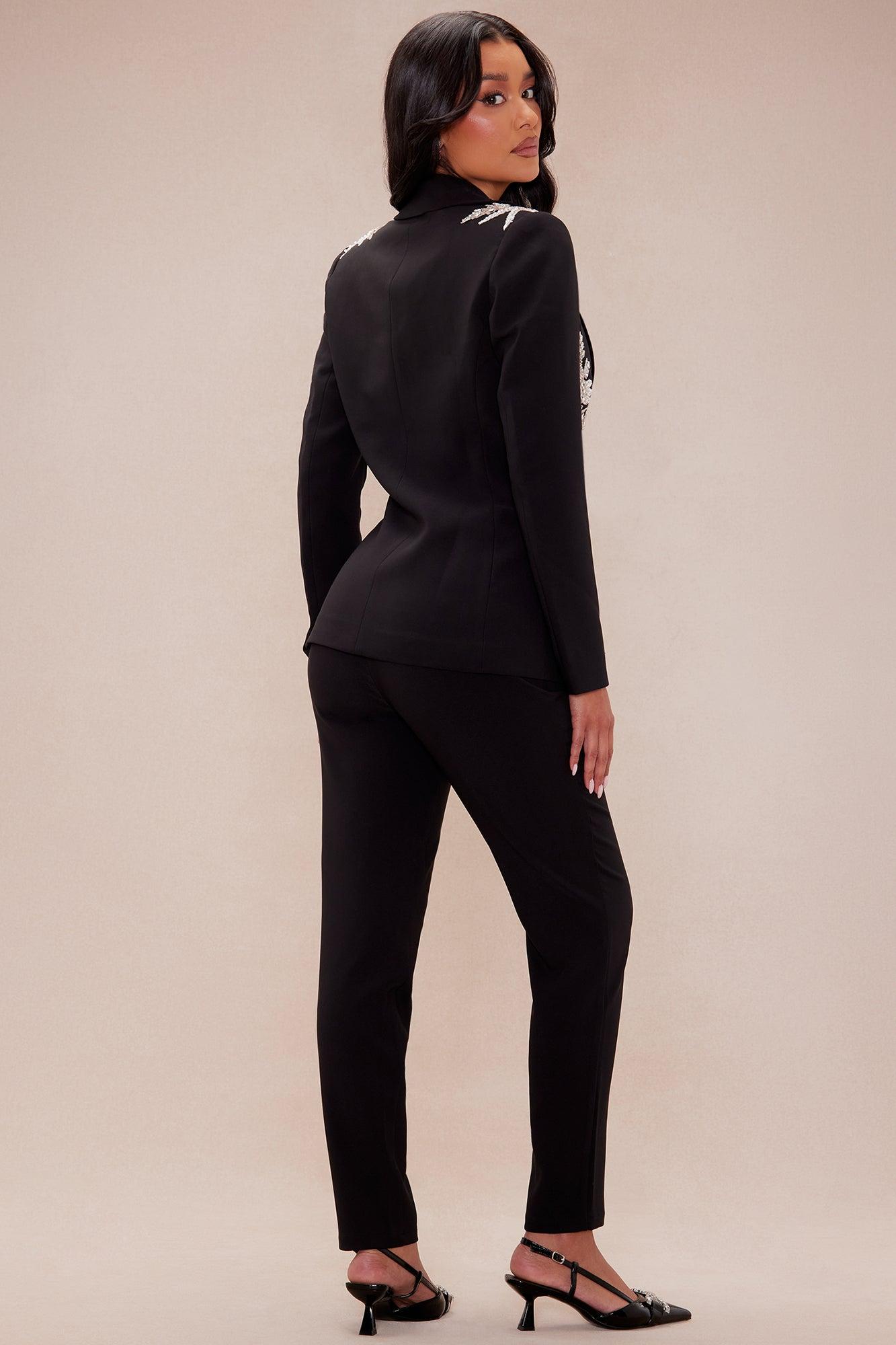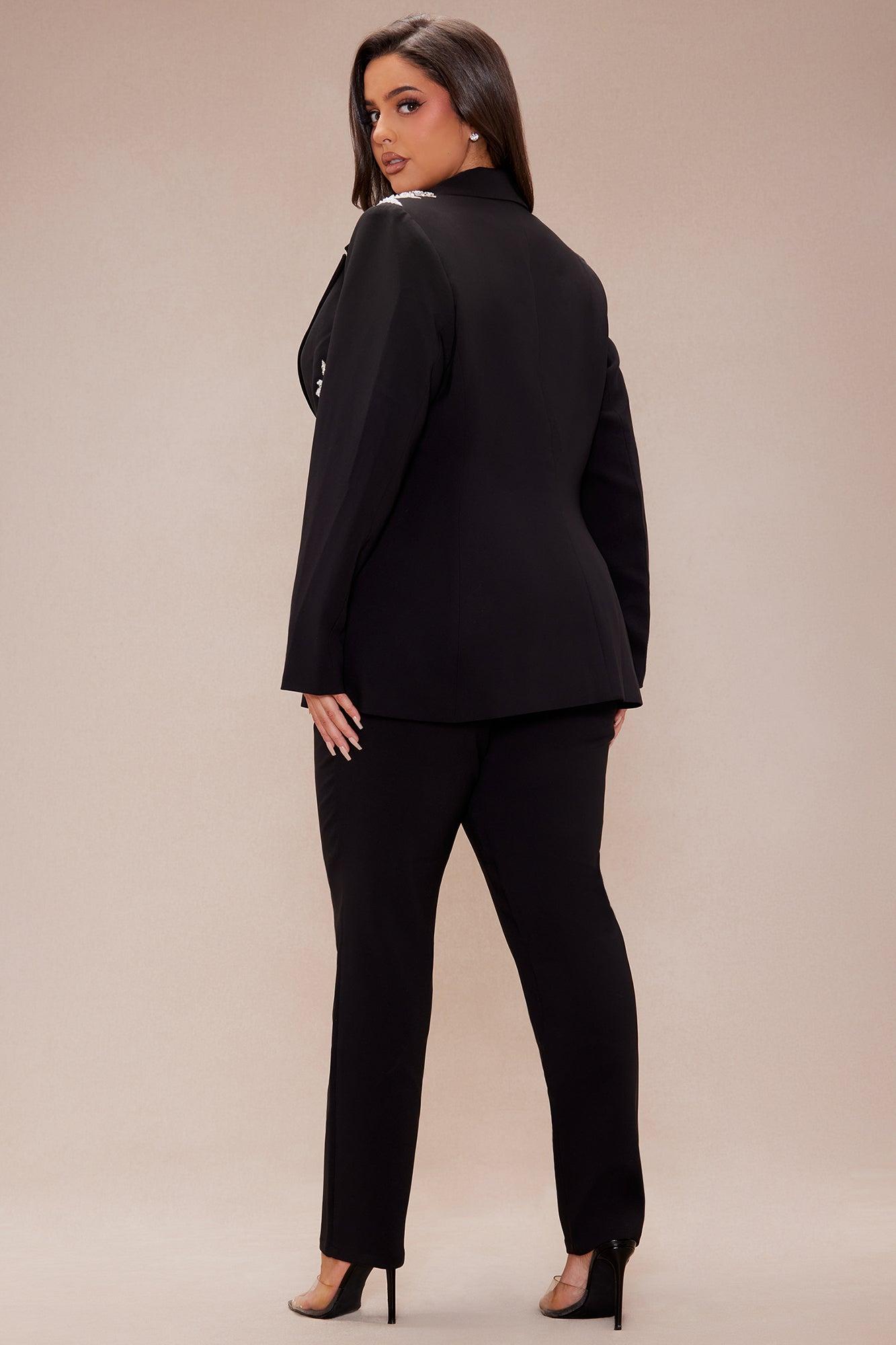 Available In Black. Blazer Collar Shoulder Pads Long Sleeve Embellished Faux Pockets Front Button Closure Skinny Pant Front Zipper Closure Non Stretch Blazer/ Shell: 95% Polyester 5% Spandex Lining: 95% Polyester 5% Spandex Pants: 95% Polyester 5% Spandex