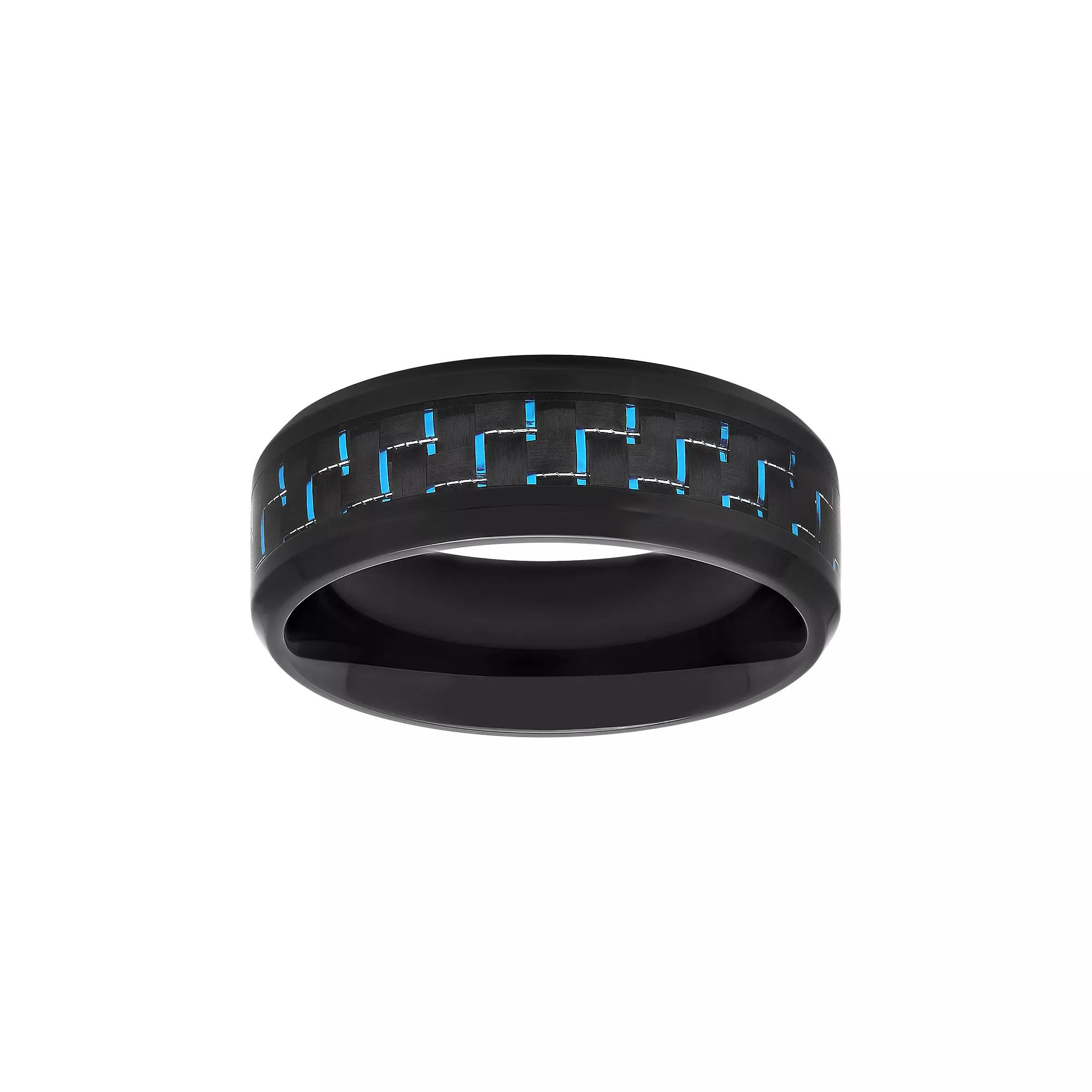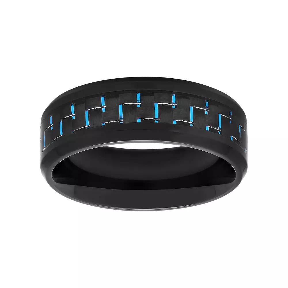 Featuring a woven design with blue carbon fiber accents, this men's stainless steel wedding band makes a uniquely handsome choice.RING DETAILS Width: 8 mm Metal: stainless steel Plating: black ion Finish: polished Size: 11. Gender: male. Age Group:...