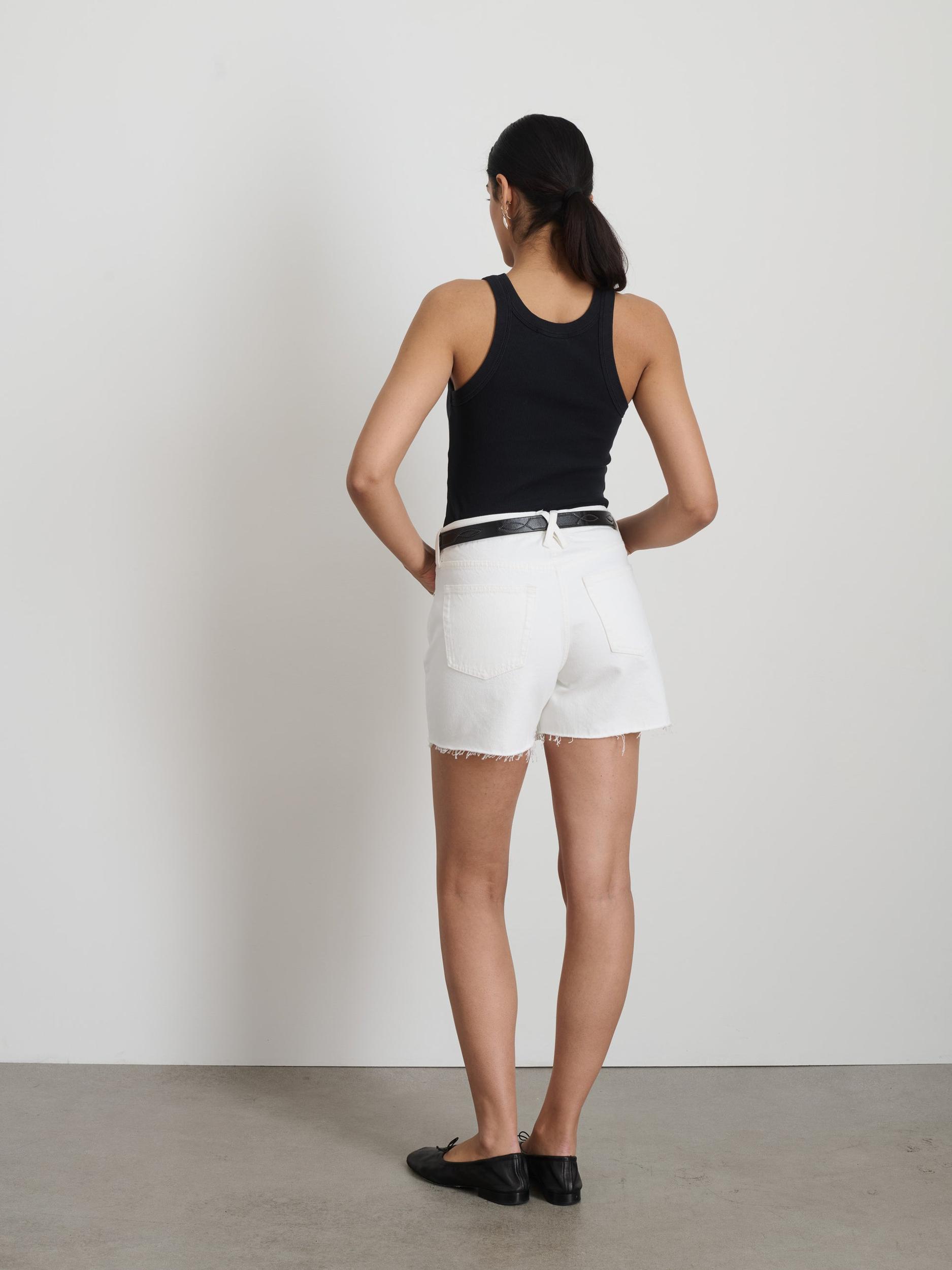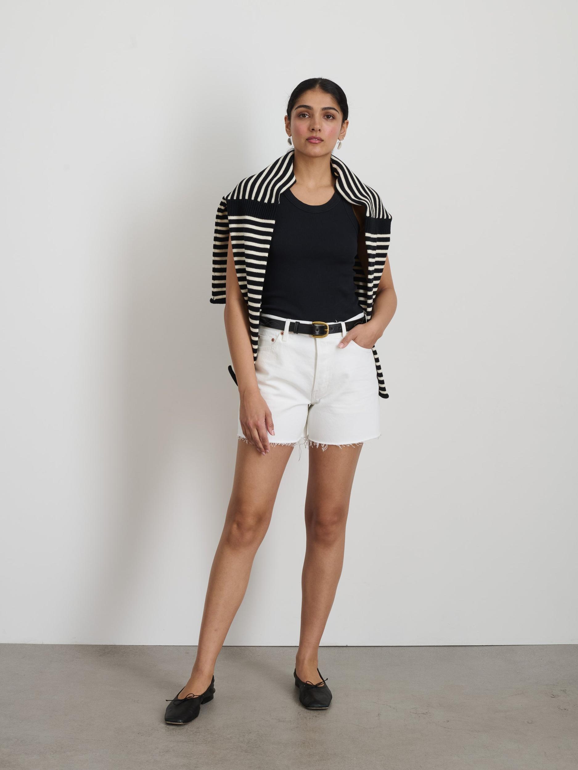 Great denim shorts are notoriously hard to find. Our version combines the perfect wash and fit. Relaxed through the leg with a slight '90s vibe. 100% non-stretch cotton denim. Fits true to size. Size 27 measures 31.5" around the waist and 40" around the hip. Front rise measures 10.75", inseam measures 4.5". Kiran is 5'