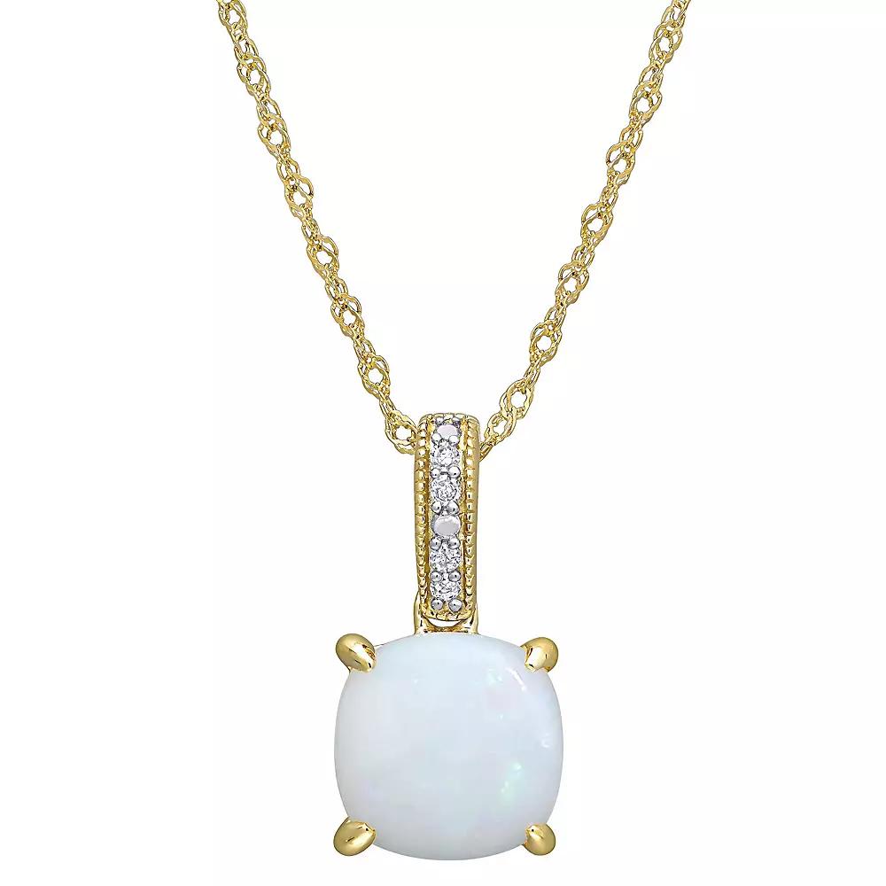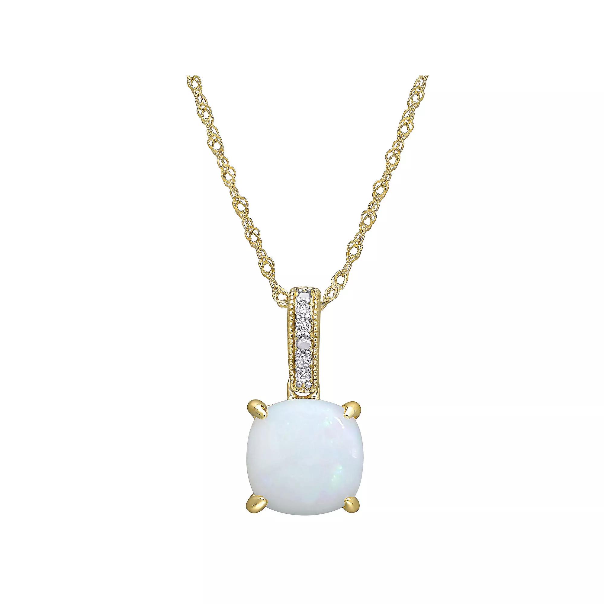 Add an enchanting touch to your wardrobe with this beautiful Stella Grace white opal pendant. Add an enchanting touch to your wardrobe with this beautiful Stella Grace white opal pendant. Pendant size: 0.61"L x 0.31"W Chain length: 17 in. Chain type: rope Metal: 10k gold Finish: textured Packaging: boxedSTONE DETAILS Stone type: opal Total weight: 1 1/3 ct. Center stone size: 8 mm x 8 mm Shape: cushion cut Setting: prongDIAMOND DETAILS Total weight: less than 1/10 ct. Shape: round Setting: pave Gemstones may have been treated to enhance their appearance. Special care may be required. Please visit our Gemstone Treatment & Special Care Guide for more information. Diamond weights are approximate. Diamond total weights may vary between .01 and .08 ct. Some diamonds have fewer than 17 facets. Image(s) may be enlarged to show detail. Please note, due to the high value of this item, a signature may be required upon delivery. Size: 17". Gender: female. Age Group: adult.