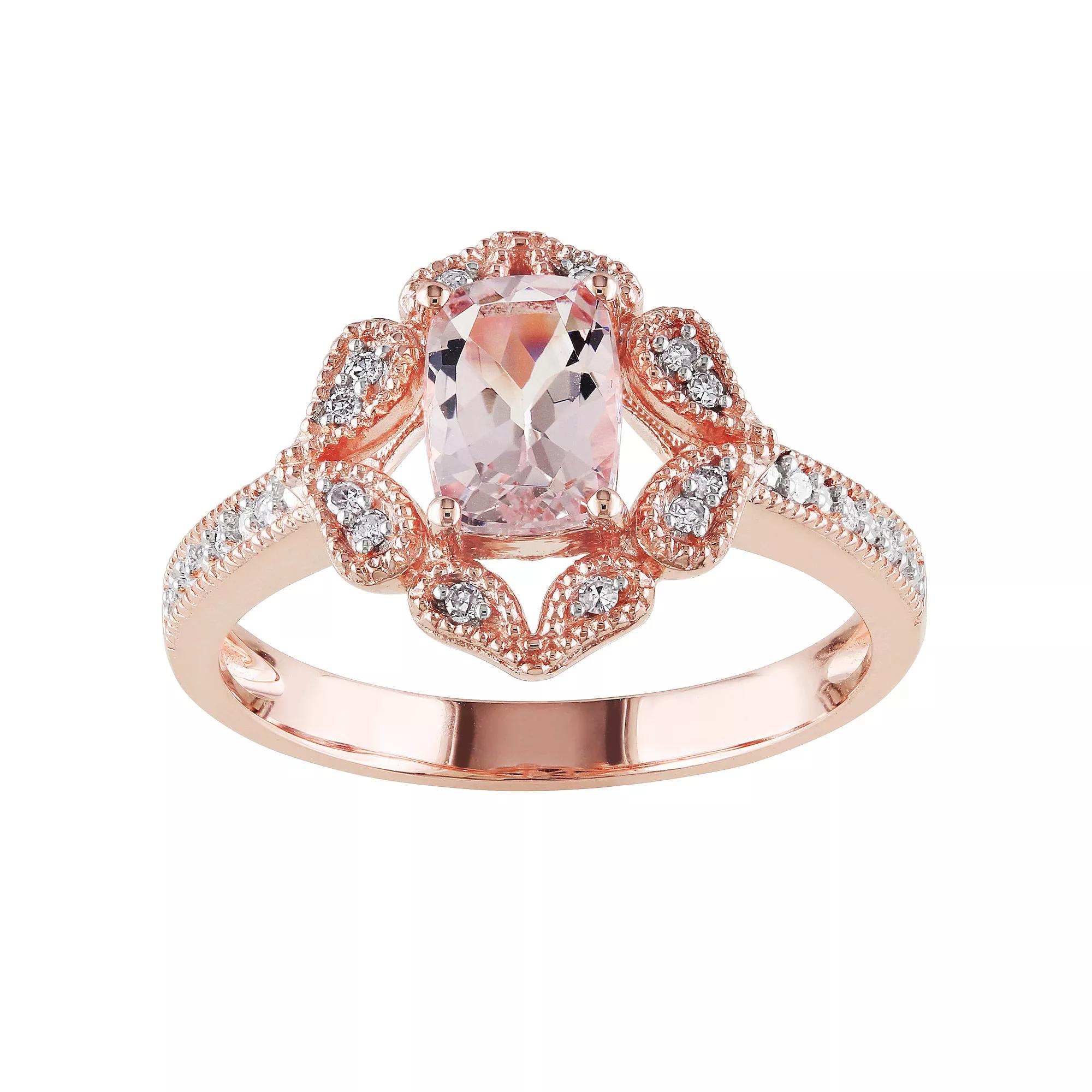 Adorned with sparkling morganite and diamond accents, this Stella Grace 10k rose gold floral halo ring is a beautiful accessory you'll love. Adorned with sparkling morganite and diamond accents, this Stella Grace 10k rose gold floral halo ring is a beautiful accessory you'll love. Metal: 10k rose gold Packaging: boxed Width: 12.6 mm Finish: milgrainSTONE DETAILS Stone type: morganite Total weight: 4/5 ct. Stone size: 7 mm x 5 mm Shape: cushion cut Setting: prong Nickel freeDIAMOND DETAILS Total weight: 1/10 ct. Color grade: G-I Clarity: 12-13 Shape: round Setting: pave Diamond weights are approximate. Diamond Total Weights may vary between .01 and .13 ct. Some diamonds consist of fewer than 17 facets. Gemstones may have been treated to enhance their appearance. Special care may be required. Please visit our Gemstone Treatment & Special Care Guide for more information. Image(s) may be enlarged to show detail. Please note, due to the high value of this item, a signature may be required upon delivery. Color: Pink. Gender: female. Age Group: adult.