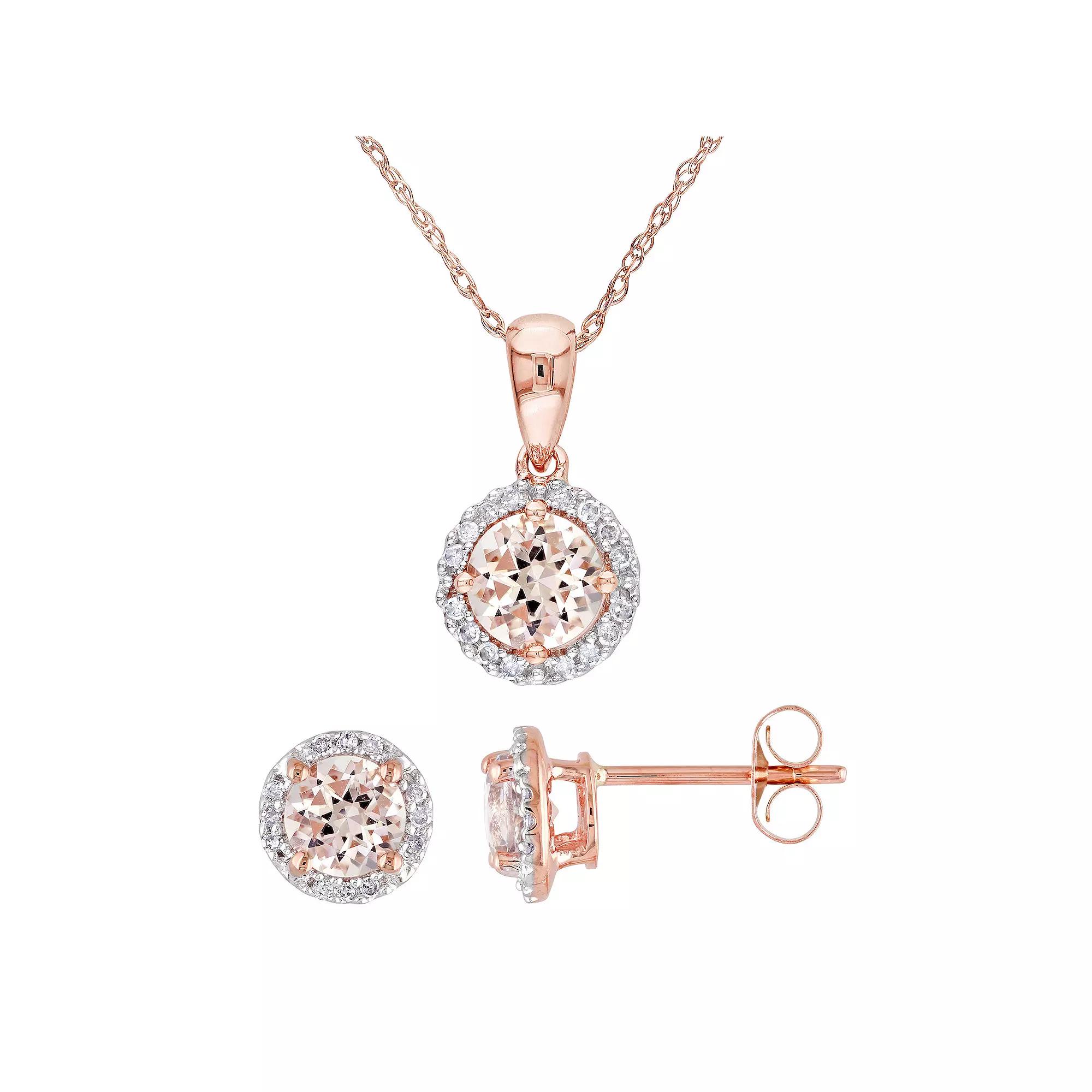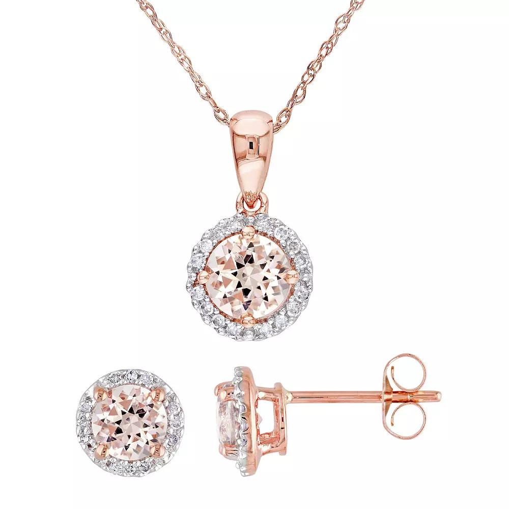 Complement your elegant style with this Stella Grace 10k Rose Gold Morganite & 1/6 Carat T.W. Diamond Halo Stud Earrings & Necklace Set. Complement your elegant style with this Stella Grace 10k Rose Gold Morganite & 1/6 Carat T.W. Diamond Halo Stud Earrings & Necklace Set. FEATURES Chain type: rope Nickel free Metal: 10k rose gold Plating: 10k rose gold Finish: polished Chain Length: 17" Packaging: boxedSTONE DETAILS Total weight: 1 4/5 ct. Stone type: morganite Shape: round Setting: prongDIAMOND DETAILS Total weight: 1/6 ct. Shape: round Setting: pave Gemstones may have been treated to enhance their appearance. Special care may be required. Please visit our Gemstone Treatment & Special Care Guide for more information. Image(s) may be enlarged to show detail. Diamond weights are approximate. Diamond Total Weights may vary between .01 and .13 ct. Some diamonds consist of fewer than 17 facets. Color: Pink. Gender: female. Age Group: adult.