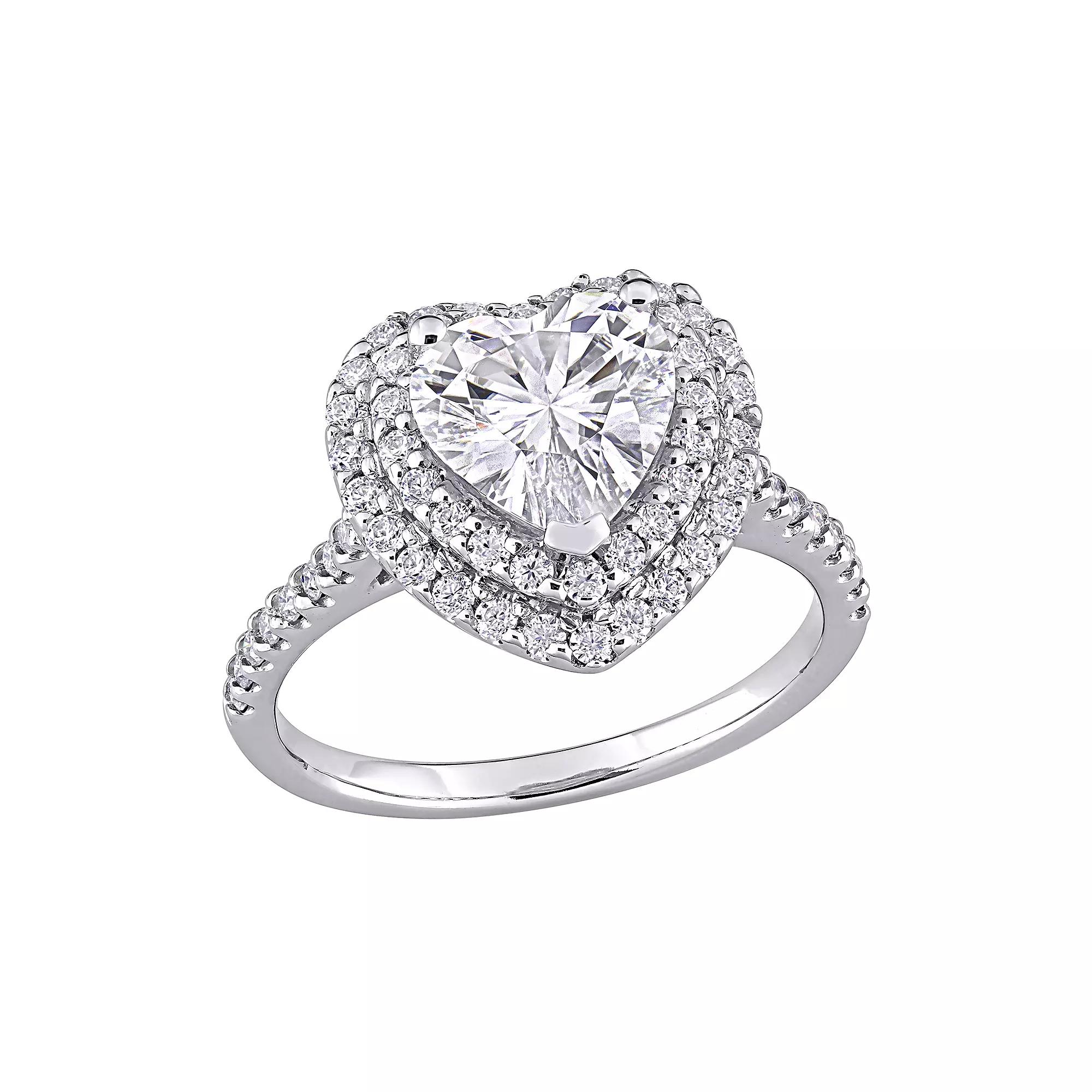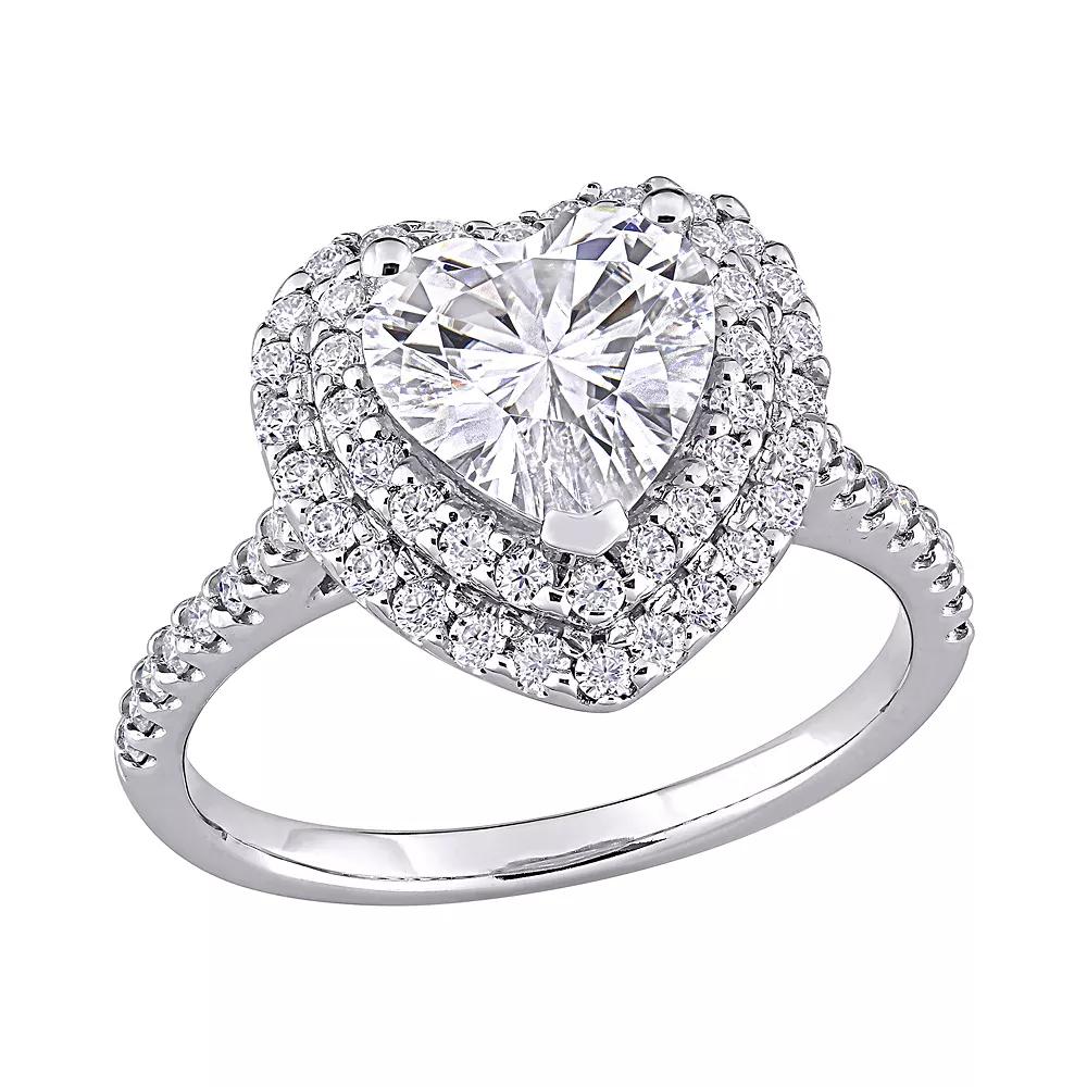 Make memories for a lifetime when you propose with this Stella Grace lab-created moissanite heart engagement ring. Make memories for a lifetime when you propose with this Stella Grace lab-created moissanite heart engagement ring. Metal: 10k white gold Plating: rhodium Packaging: boxed Width: 13.2 mm Finish: polishedSTONE DETAILS Stone type: lab-created moissanite Total weight: 2 5/8 ct. Center stone weight: 2 ct. Center stone size: 8 mm x 8 mm Shape: heart, round Setting: prong Gemstones may have been treated to enhance their appearance. Special care may be required. Please visit our Gemstone Treatment & Special Care Guide for more information. Please note, due to the high value of this item, a signature may be required upon delivery. Size: 11. Gender: female. Age Group: adult.