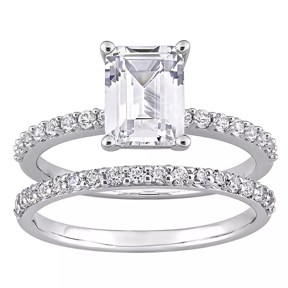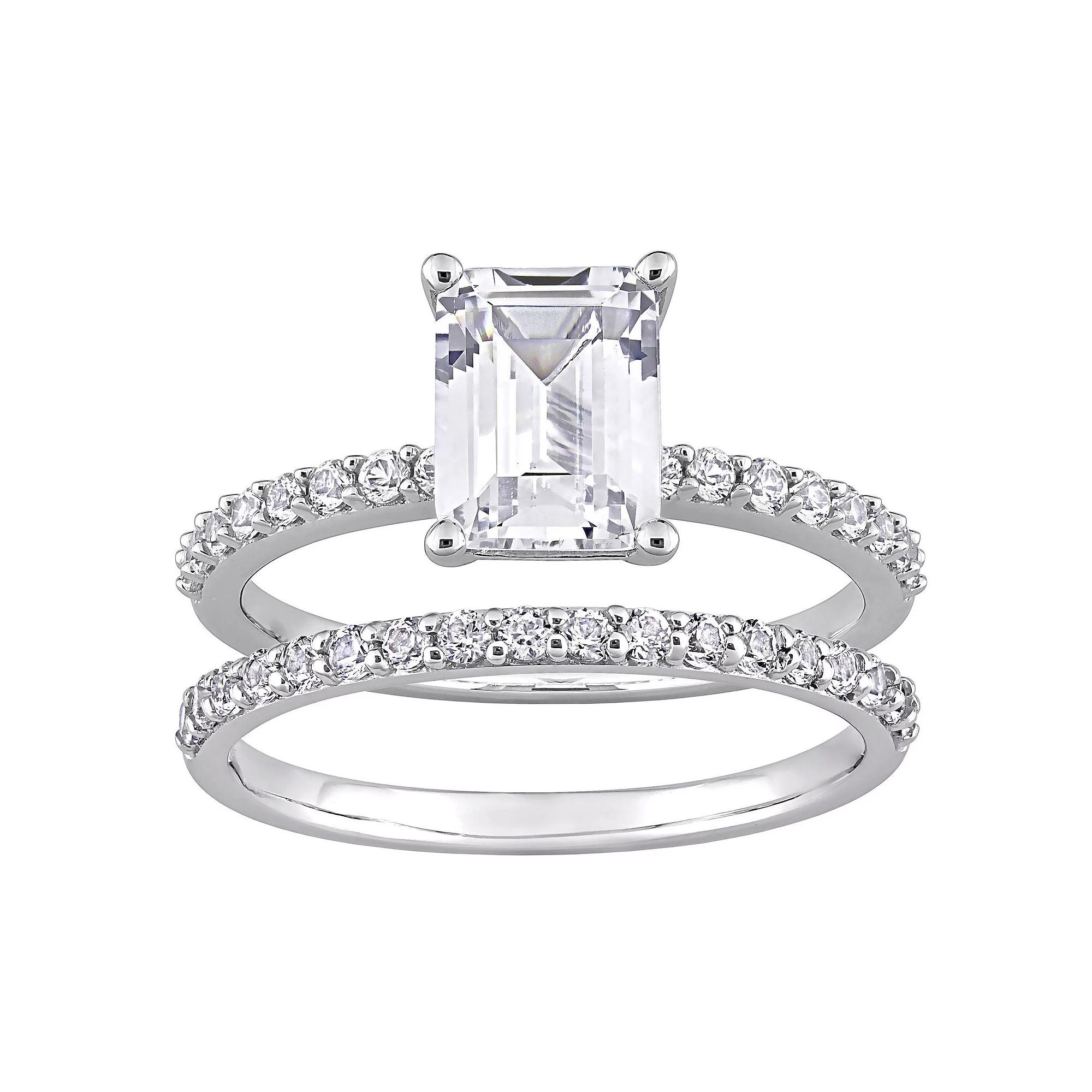 Showcase your love in a beautiful way with this Stella Grace 10k White Gold Emerald-Cut Lab-Created White Sapphire Bridal Ring Set. Click on this JEWELRY & WATCHES GUIDE to learn about fit, styles, materials and more! Showcase your love in a beautiful way with this Stella Grace 10k White Gold Emerald-Cut Lab-Created White Sapphire Bridal Ring Set. Click on this JEWELRY & WATCHES GUIDE to learn about fit, styles, materials and more! FEATURES Width: 10.4 mm Shank style: anniversary, solitaire Band fit: comfort fit Nickel free Metal: 10k white gold Plating: rhodium Finish: polished Packaging: boxed Includes: 2 ringsSTONE DETAILS Stone type: lab-created white sapphire Total weight: 2 3/4 ct. Center stone weight: 2 ct. Center stone size: 8 mm x 6 mm Shape: octagon, round Setting: prong, shared prong Gemstones may have been treated to enhance their appearance. Special care may be required. Please visit our Gemstone Treatment & Special Care Guide for more information. Size: 5. Gender: female. Age Group: adult.