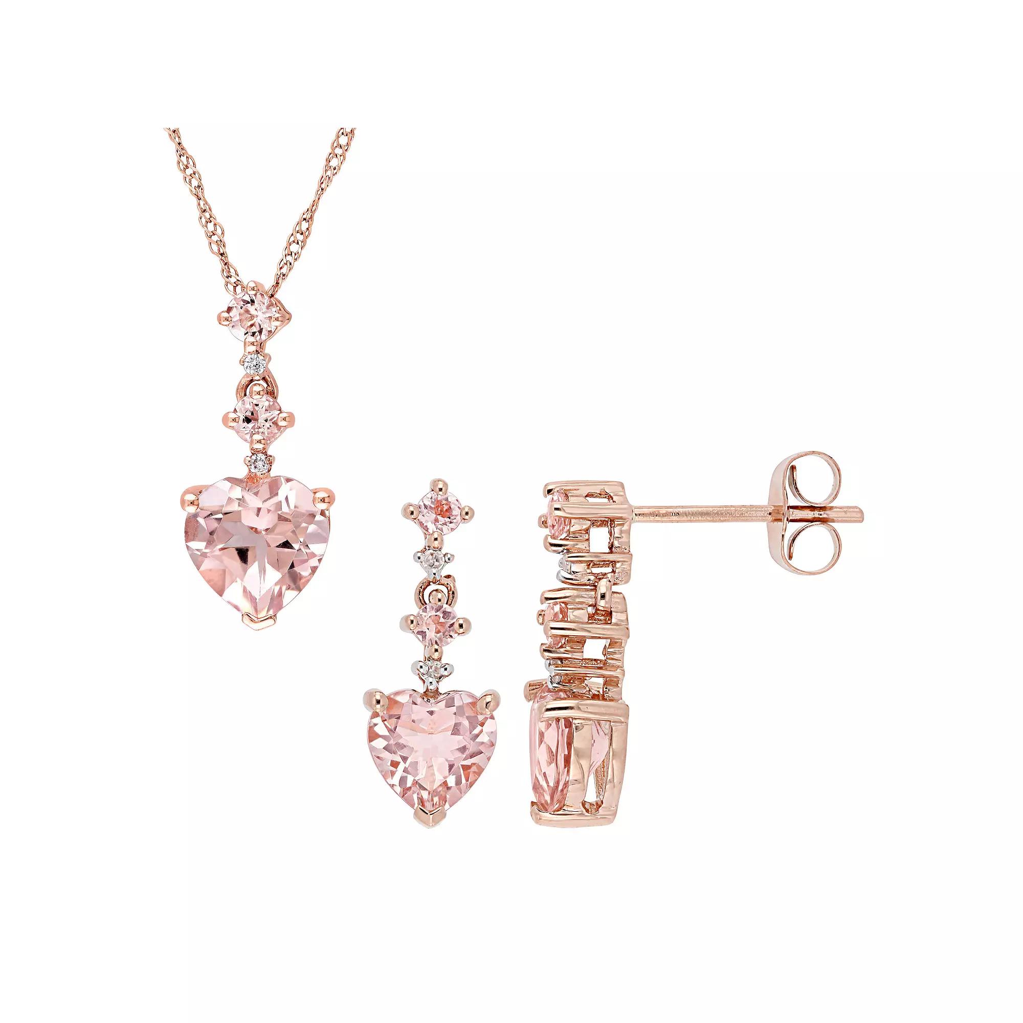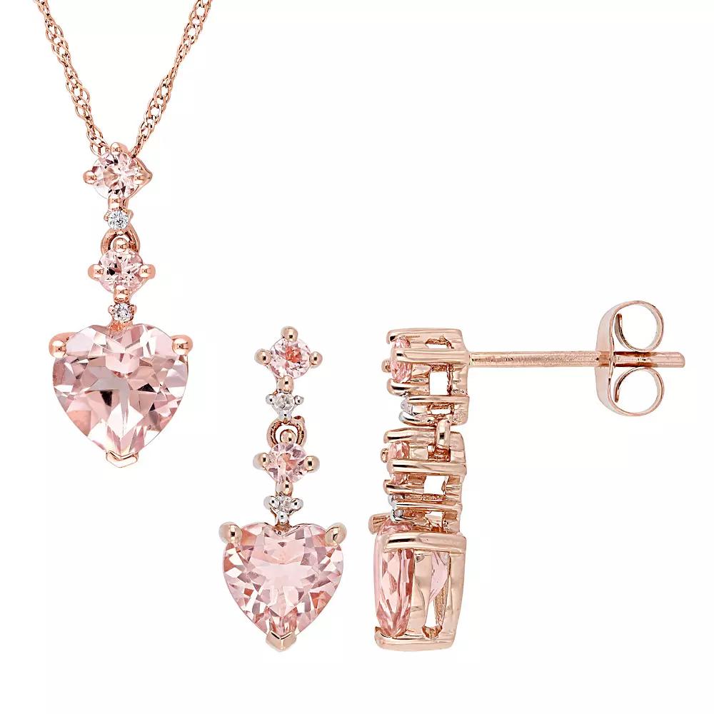 Adorned with sparkling morganite and diamond accents, this Stella Grace 14k rose gold heart pendant necklace and earring set is a beautiful addition to your wardrobe. Adorned with sparkling morganite and diamond accents, this Stella Grace 14k rose gold heart pendant necklace and earring set is a beautiful addition to your wardrobe. Includes: 1 pendant necklace and 1 pair of earrings Clasp: spring-ring Nickel free Metal: 14k rose gold Chain length: 17 in. Backings: post Packaging: boxed Finish: polished Earring length: 4 mm Chain type: SingaporeSTONE DETAILS Stone type: morganite Total weight: 2 3/4 ct. Shape: heart cut, round cut Setting: prongDIAMOND DETAILS Total weight: less than 1/10 ct. Color grade: G-I Clarity: 11 Shape: round Setting: prong Diamond weights are approximate. Diamond Total Weights may vary between .01 and .13 ct. Some diamonds consist of fewer than 17 facets. Gemstones may have been treated to enhance their appearance. Special care may be required. Please visit our Gemstone Treatment & Special Care Guide for more information. Image(s) may be enlarged to show detail. Please note, due to the high value of this item, a signature may be required upon delivery. Size: 17. Color: Pink. Gender: female. Age Group: adult.