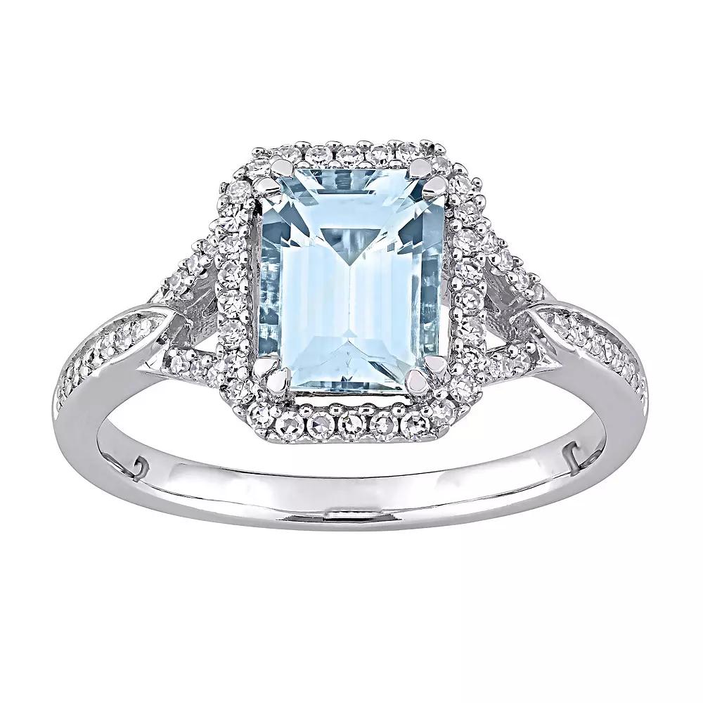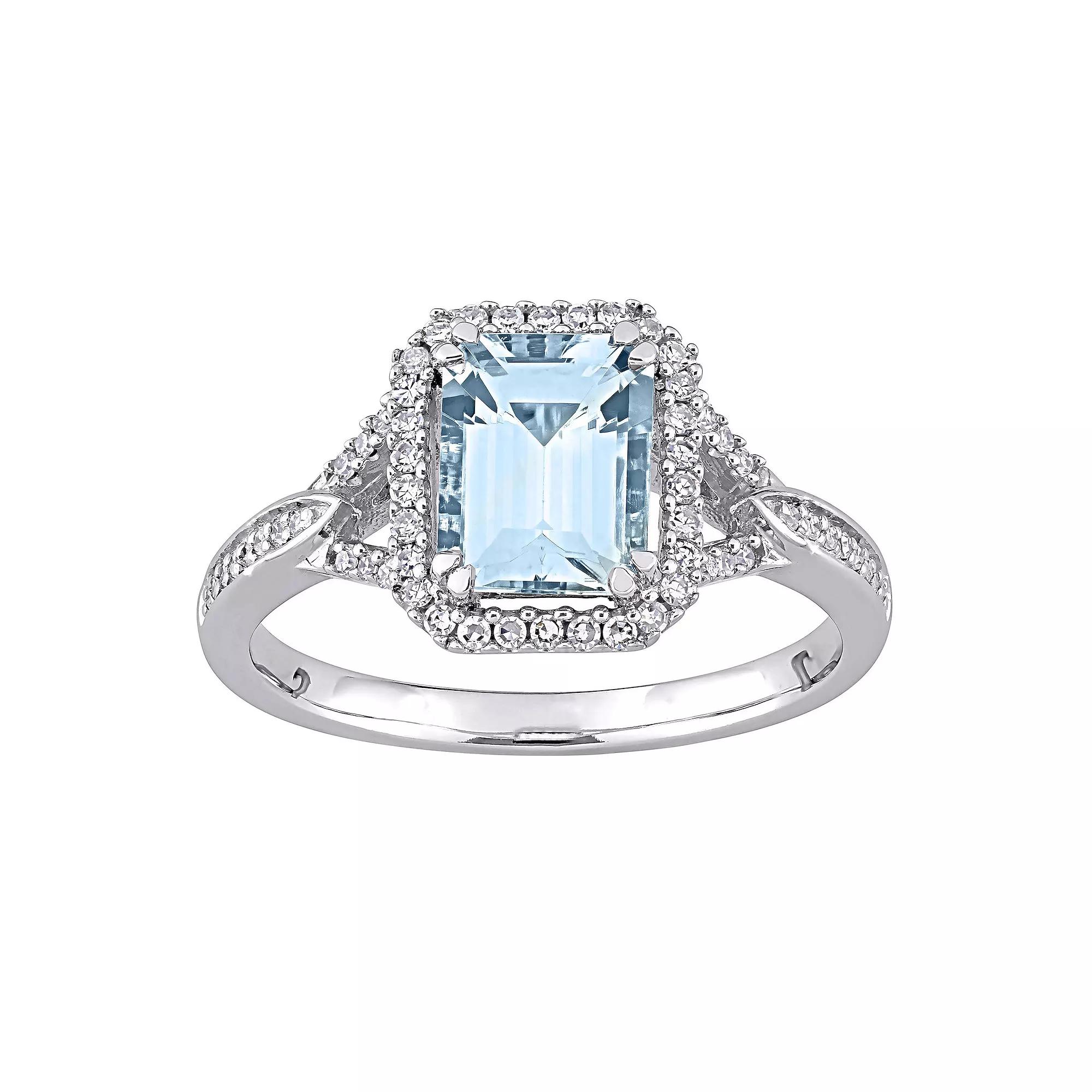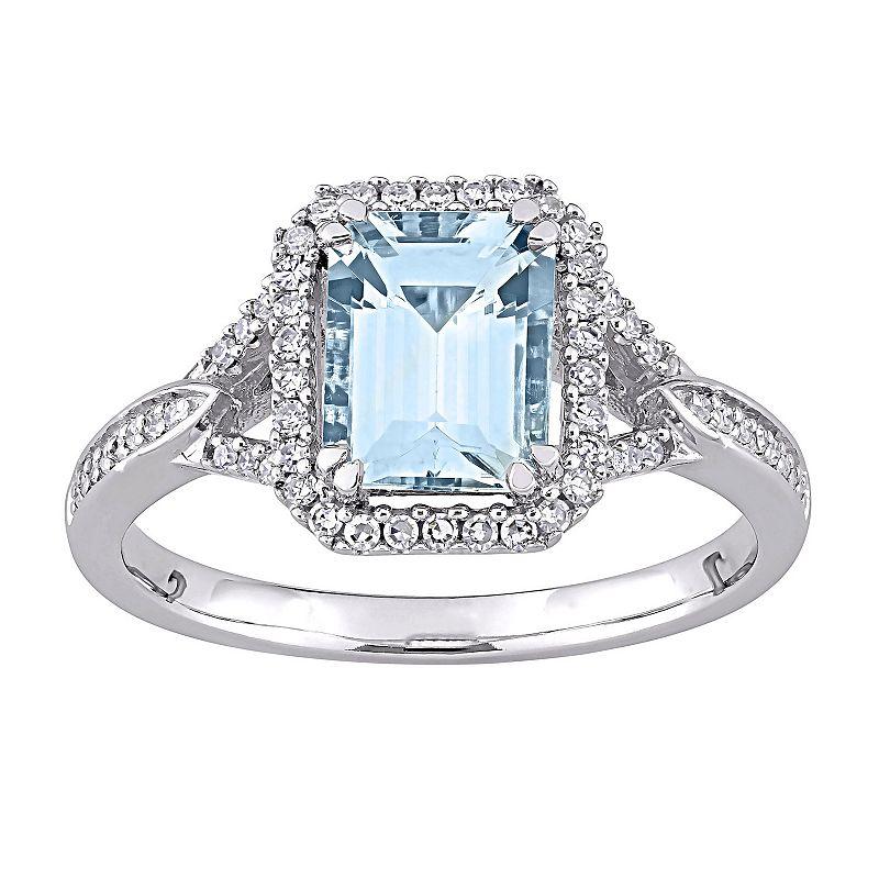 Adorned with an emerald-cut aquamarine and scintillating diamond accents, this gorgeous Stella Grace ring is the perfect way to express your love and dedication. Adorned with an emerald-cut aquamarine and scintillating diamond accents, this gorgeous Stella Grace ring is the perfect way to express your love and dedication. Metal: 14k white gold Packaging: boxed Plating: rhodium Width: 10.7 mm Finish: polishedSTONE DETAILS Stone type: aquamarine Total weight: 1 7/8 ct. Center stone size: 8 mm x 6 mm Shape: emerald cut Setting: prongDIAMOND DETAILS Total weight: 1/5 ct. Shape: round Setting: pave Gemstones may have been treated to enhance their appearance. Special care may be required. Please visit our Gemstone Treatment & Special Care Guide for more information. Image(s) may be enlarged to show detail. Please note, due to the high value of this item, a signature may be required upon delivery. Color: Blue. Gender: female. Age Group: adult.
