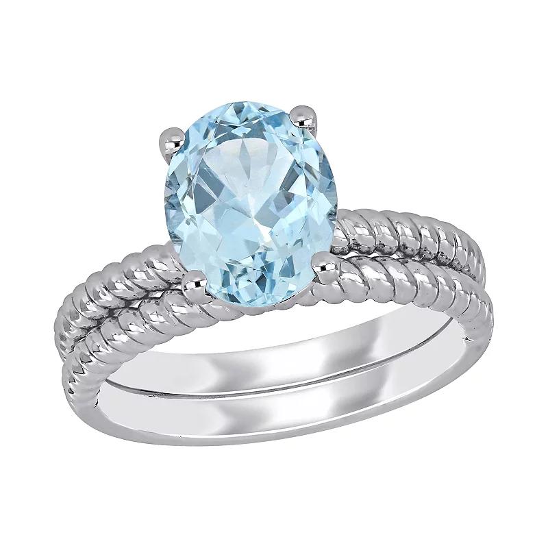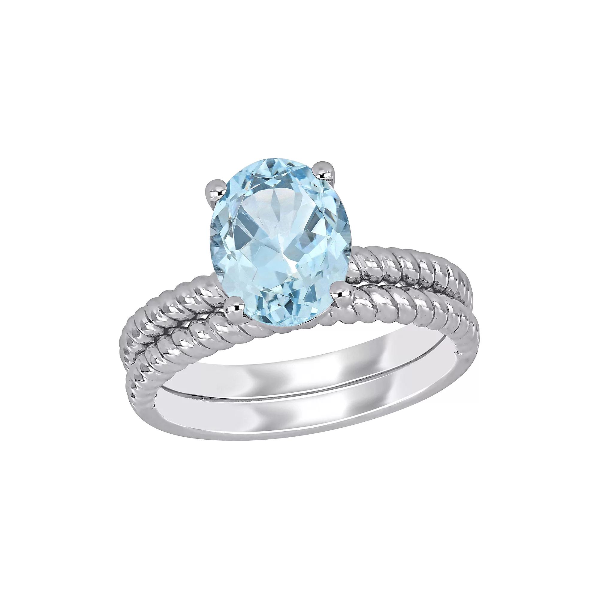 A scintillating aquamarine gemstone makes this 14k white gold bridal ring set one she'll love to wear. A scintillating aquamarine gemstone makes this 14k white gold bridal ring set one she'll love to wear. Includes: engagement ring, wedding band Width: 10 mm Metal: 14k white gold Finish: polished Packaging: boxed STONE DETAILS Stone type: aquamarine Total weight: 2 1/10 ct. Center stone size: 10 mm x 8 mm Shape: oval Setting: prong Please note, due to the high value of this item, a signature may be required upon delivery. Size: 6. Color: Blue. Gender: female. Age Group: adult.
