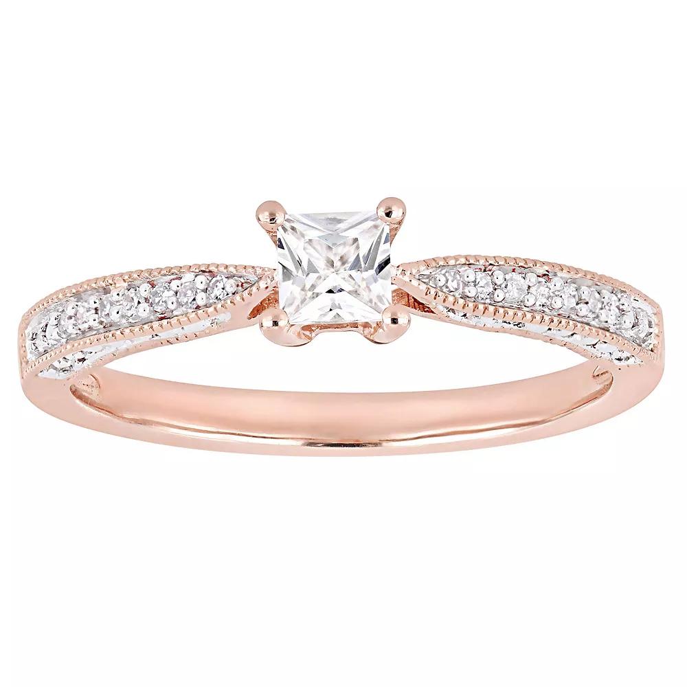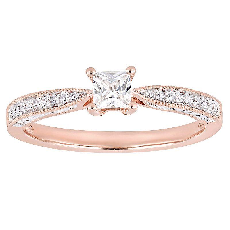 Dazzling with a lab-created white sapphire center stone and shimmering diamond accents, this Stella Grace ring is a beautiful complement to your style. Dazzling with a lab-created white sapphire center stone and shimmering diamond accents, this Stella Grace ring is a beautiful complement to your style. Width: 4.4 mm Metal: sterling silver Plating: 18k rose gold flash plated Finish: polished Packaging: boxedSTONE DETAILS Stone type: lab-created white sapphire Total weight: 1/3 ct. Center stone weight: 1/4 ct. Center stone size: 3.5 mm x 3.5 mm Shape: square Setting: prongDIAMOND DETAILS Total weight: less than 1/10 ct. Shape: round Setting: pave Diamond weights are approximate. Diamond total weights may vary between .01 and .08 ct. Some diamonds have fewer than 17 facets. Gemstones may have been treated to enhance their appearance. Special care may be required. Please visit our Gemstone Treatment & Special Care Guide for more information. Image(s) may be enlarged to show detail. Please note, due to the high value of this item, a signature may be required upon delivery. Gender: female. Age Group: adult. Material: Gold Over Sterling.