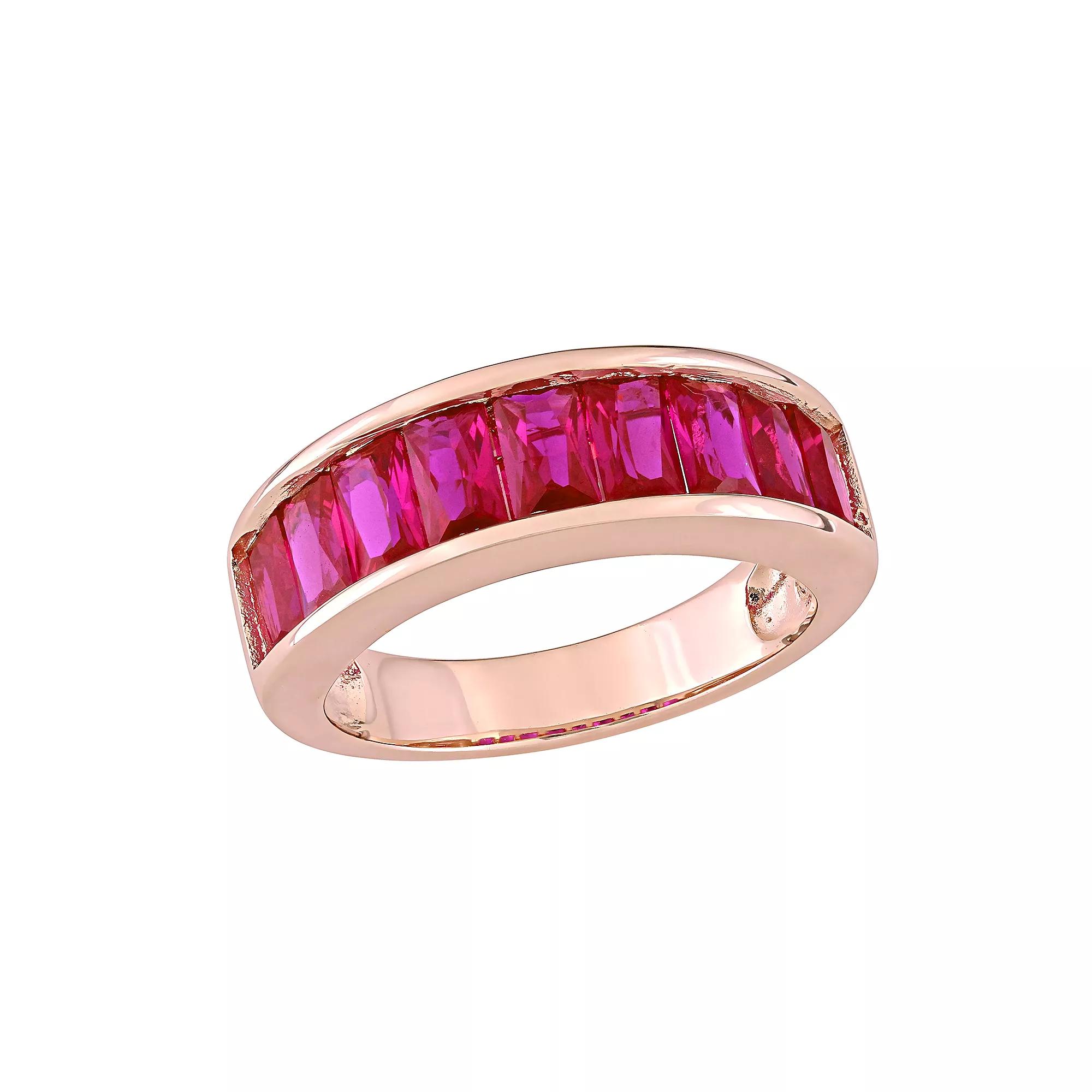 Lab-created ruby gemstones lend a gorgeous glow to this Stella Grace anniversary ring. Lab-created ruby gemstones lend a gorgeous glow to this Stella Grace anniversary ring. Watch the product video here. Width: 6.8 mm Metal: sterling silver Plating: 18k rose gold flash plated Finish: polished Packaging: boxed STONE DETAILS Stone type: lab-created ruby Total weight: 2 3/4 ct. Shape: baguette cut Setting: channel Size: 7. Color: Red. Gender: female. Age Group: adult.