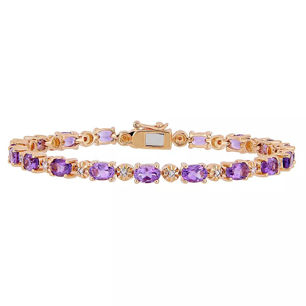 Make a fashion statement when youre wearing this bold amethyst and diamond bracelet from Stella Grace. Make a fashion statement when youre wearing this bold amethyst and diamond bracelet from Stella Grace. BRACELET DETAILS Length: 7.25 in. Clasp: box Metal: sterling silver Plating: rhodium Finish: polished Packaging: boxed GEMSTONE DETAILS Stone type: amethyst Total weight: 7-1/5 ct. Shape: oval Color: purple Setting: prong DIAMOND DETAILS Total weight: less than 1/10 ct. Shape: round Color: white Setting: prong Gemstones may have been treated to enhance their appearance. Special care may be required. Please visit our Gemstone Treatment & Special Care Guide for more information. Image(s) may be enlarged to show detail. Please note, due to the high value of this item, a signature may be required upon delivery. Size: 7.25. Gender: female. Age Group: adult. Material: Gold Over Sterling.