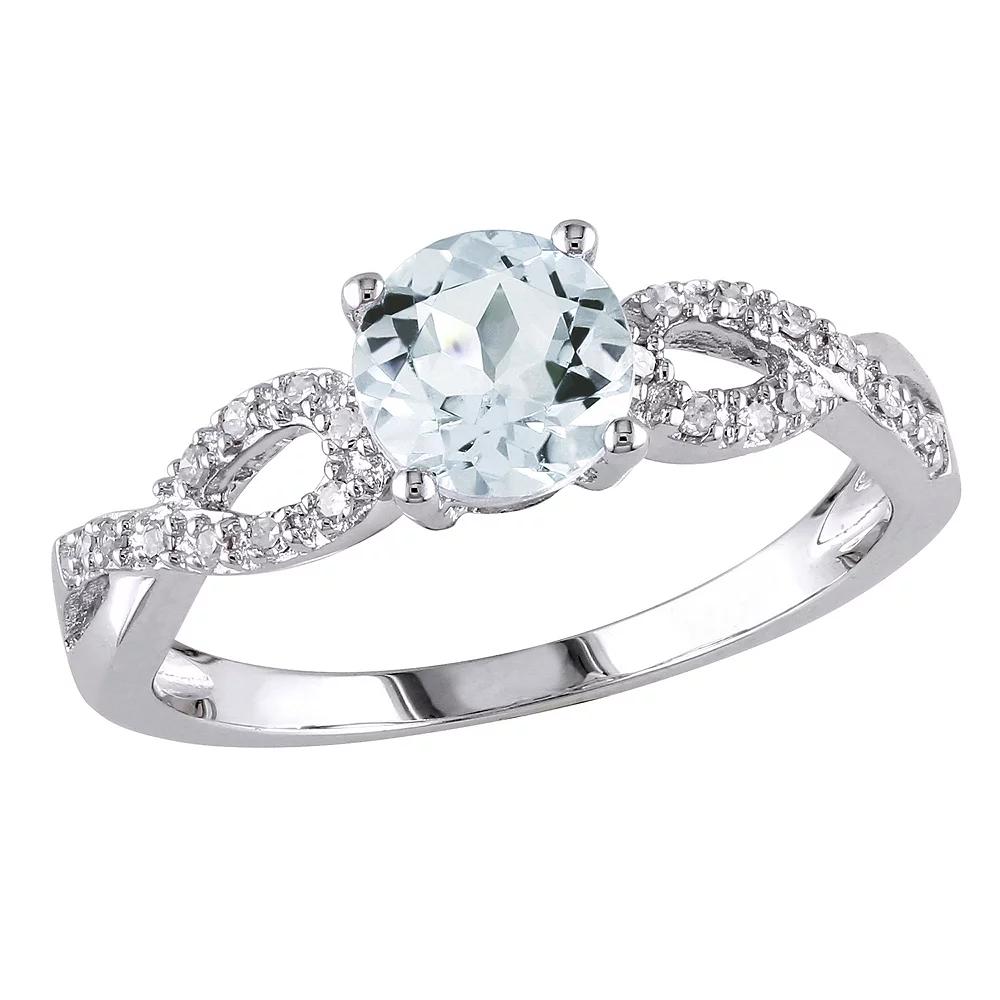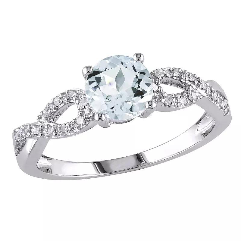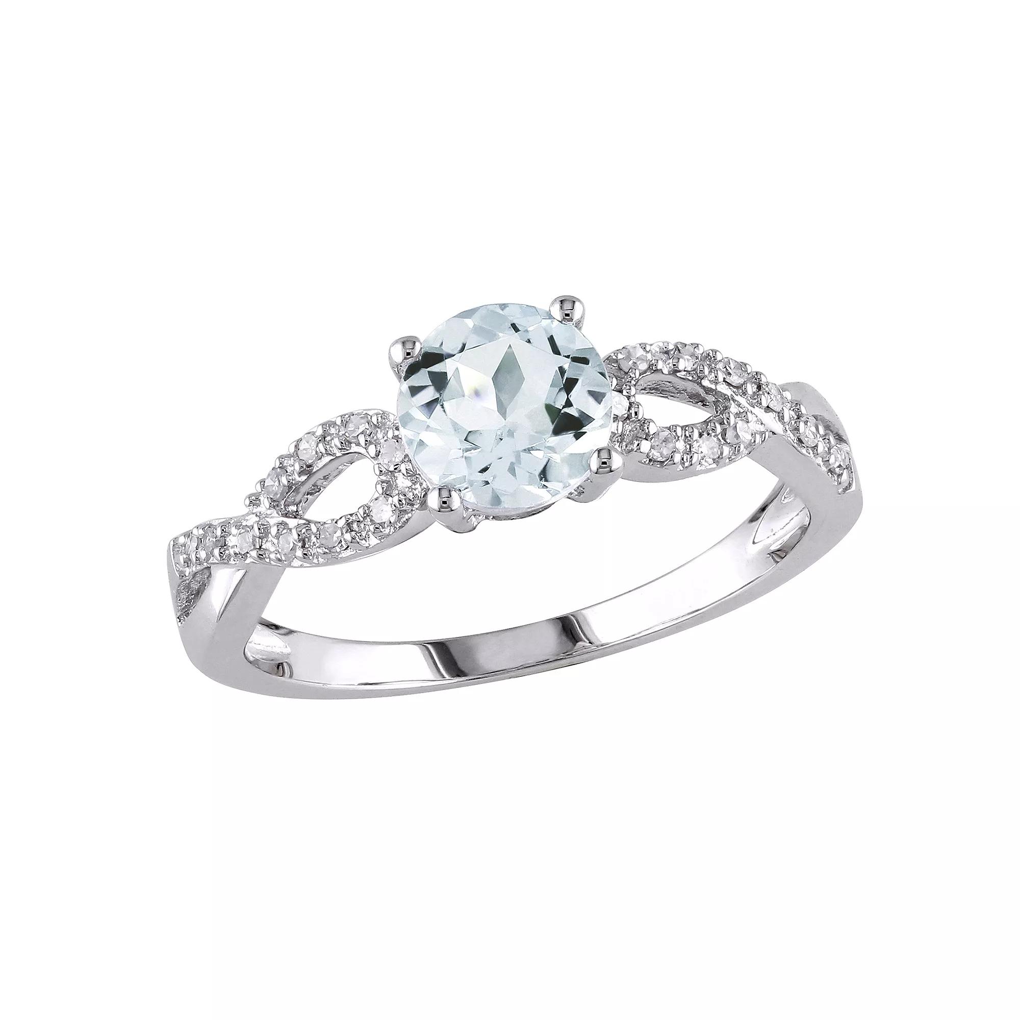 This aquamarine and diamond accent engagement ring offers infinite beauty.Ring Details: Width: 6 mm Metal: 10k white gold Features: infinity design Stone Details: Stone type: genuine aquamarine Total weight: 3/4 ct. Cut: round Setting: prong Diamond Details: Total weight: less than 1/10 ct. Cut: round Setting: shared prong Image(s) may be enlarged to show detail. Diamond weights are approximate. Diamond total weights may vary between .01 and .08 ct. Some diamonds have fewer than 17 facets. Size: 9.50. Color: Blue. Gender: female. Age Group: adult.