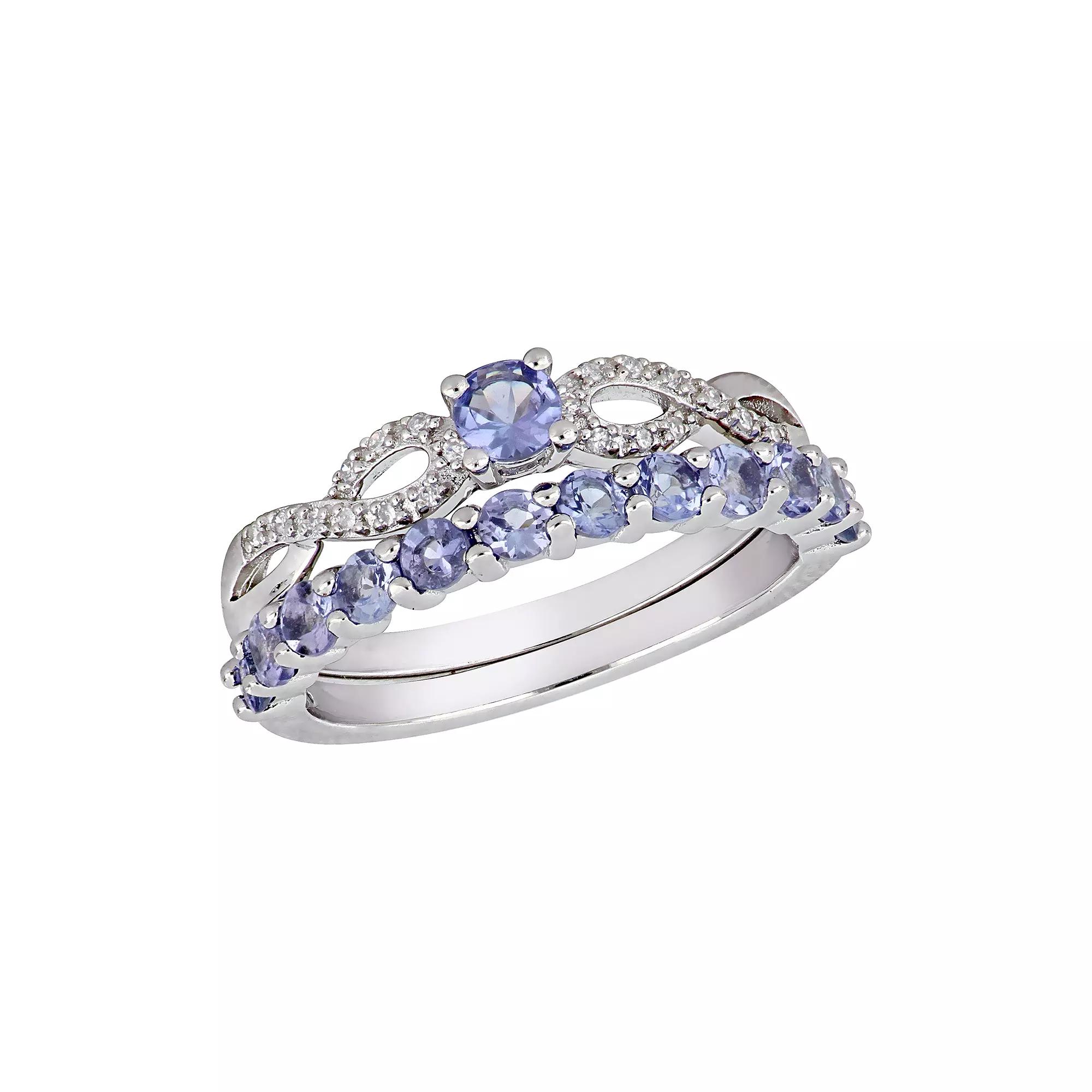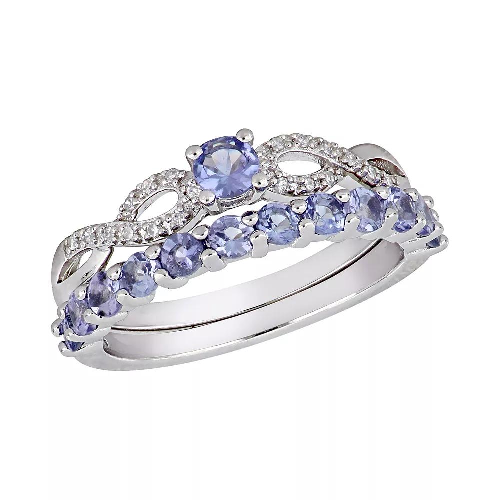 Delightfully designed with a round-cut tanzanite gemstones and radiant diamond details, this sterling silver engagement ring is a beautiful expression of your love. Delightfully designed with a round-cut tanzanite gemstones and radiant diamond details, this sterling silver engagement ring is a beautiful expression of your love. Includes: engagement ring, wedding band Width: 6.5 mm Finish: polished Metal: sterling silver Packaging: boxedSTONE DETAILS Center stone size: 3.5 mm x 3.5 mm Setting: prong Stone type: tanzanite Shape: roundDIAMOND DETAILS Total weight: 1/10 ct. Shape: round Setting: prong Color grade: G-I Clarity: I2-I3 Clarity: I2-I3 Color grade: G-I Gemstones may have been treated to enhance their appearance. Special care may be required. Please visit our Gemstone Treatment & Special Care Guide for more information. Color: Multicolor. Gender: female. Age Group: adult.