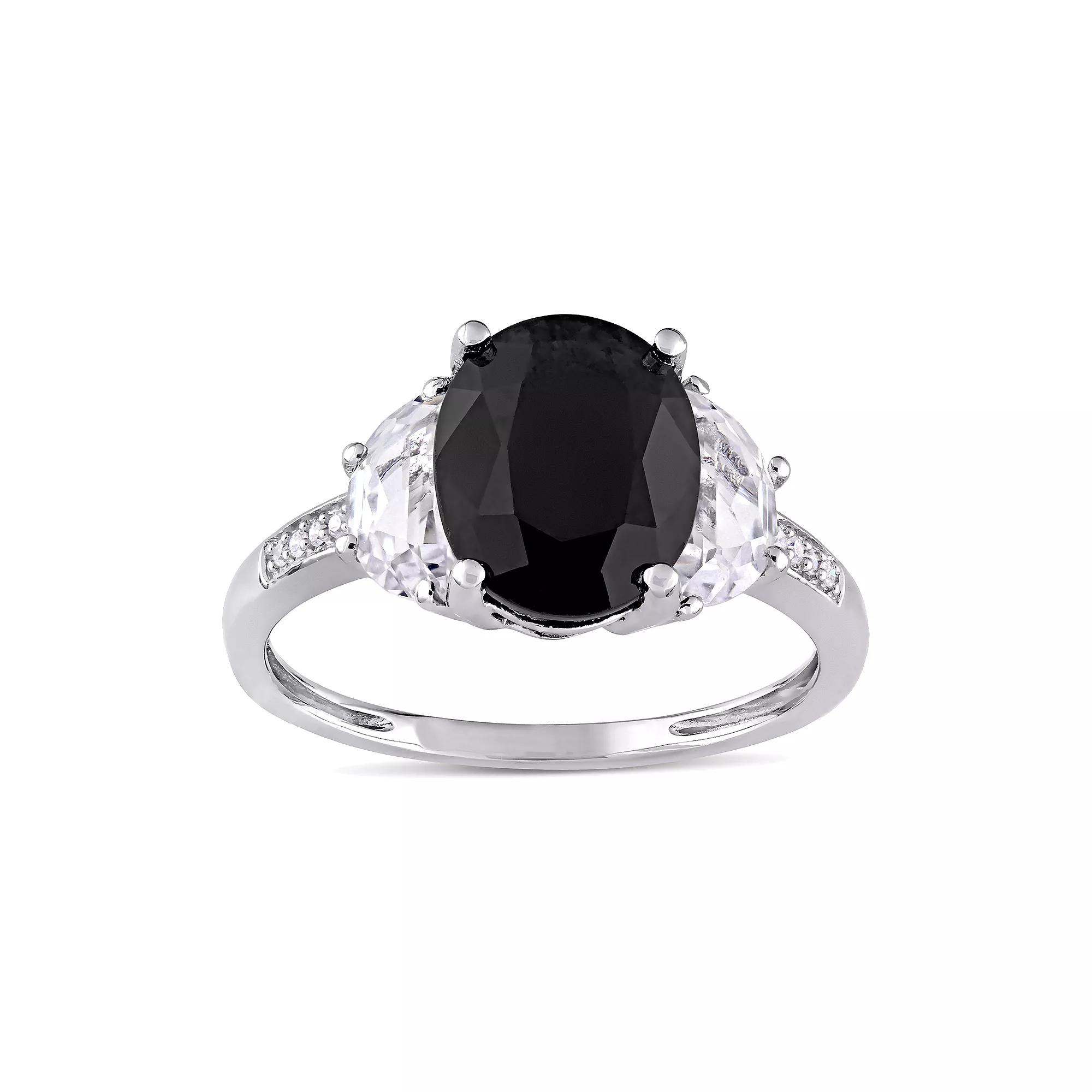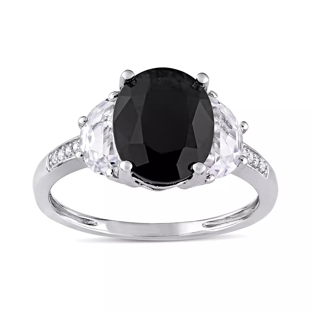 Designed with a genuine black sapphire center stone, and lab-created white sapphire and diamond accents, this ring is simply stunning. RING DETAILS Width: 9.9 mm Metal: sterling silver Plating: rhodium Finish: polished Packaging: boxed STONE DETAILS Stone type: black sapphire, lab-created white sapphire Total weight: 4 3/8 ct. Center stone weight: 3 5/8 ct. Center stone size: 10 mm x 8 mm Shape: oval Setting: prong DIAMOND DETAILSTotal weight: less than 1/10 ct.Shape: roundColor grade: G-IClarity: I2-I3Setting: prongGemstones may have been treated to enhance their appearance. Special care may be required. Please visit our Gemstone Treatment & Special Care Guide for more information. Image(s) may be enlarged to show detail.Diamond weights are approximate. Diamond total weights may vary between .01 and .08 ct. Some diamonds have fewer than 17 facets. Gender: female. Age Group: adult.