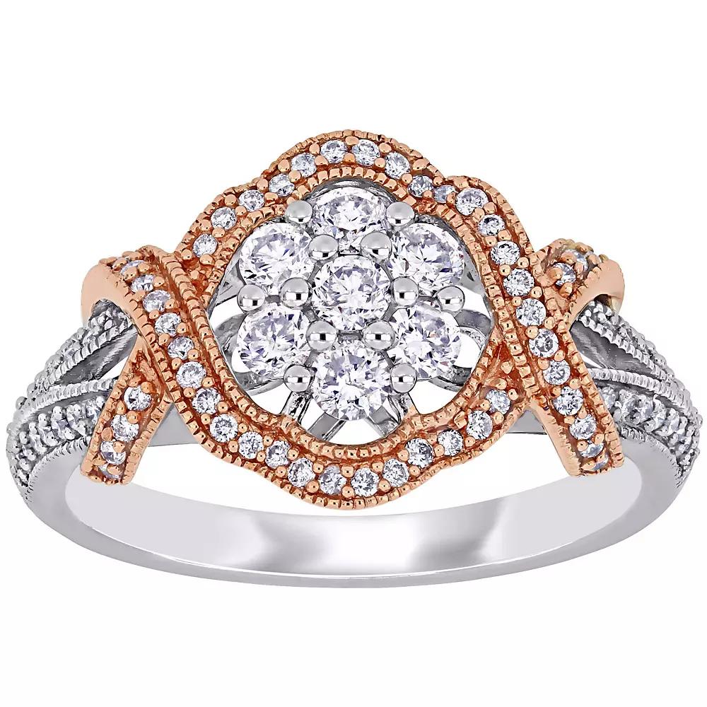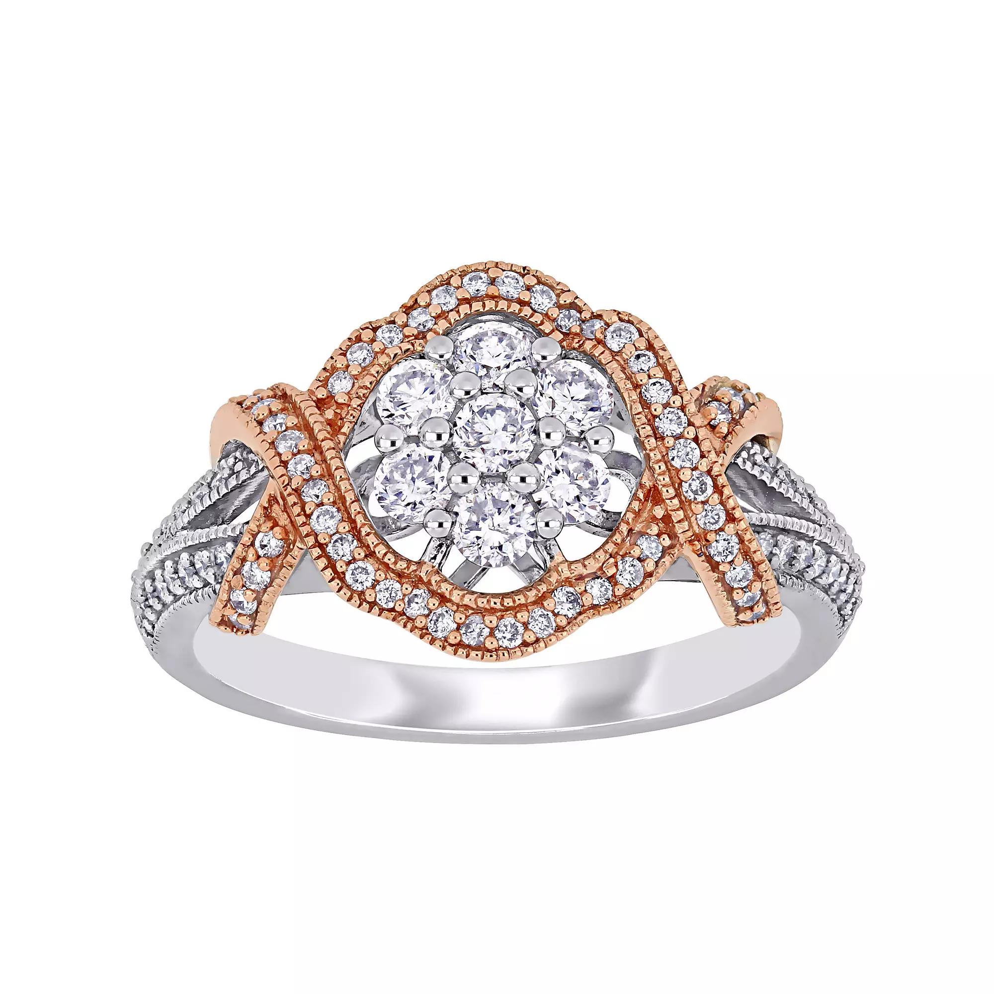 Featuring a beautiful flower motif decorated with scintillating diamonds and lustrous 10k rose gold accents, this 10k white gold Stella Grace engagement ring is one she's sure to cherish. Featuring a beautiful flower motif decorated with scintillating diamonds and lustrous 10k rose gold accents, this 10k white gold Stella Grace engagement ring is one she's sure to cherish. Width: 12 mm Metal: 10k rose gold, 10k white gold Plating: 10k rose gold, rhodium Finish: polished Packaging: boxedDIAMOND DETAILS Total weight: 5/8 ct. Shape: round Setting: pave, prong Gemstones may have been treated to enhance their appearance. Special care may be required. Please visit our Gemstone Treatment & Special Care Guide for more information. Diamond weights are approximate. Diamond total weights may vary between .01 and .08 ct. Some diamonds have fewer than 17 facets. Image(s) may be enlarged to show detail. Please note, due to the high value of this item, a signature may be required upon delivery. Size: 4. Gender: female. Age Group: adult. Pattern: floral.