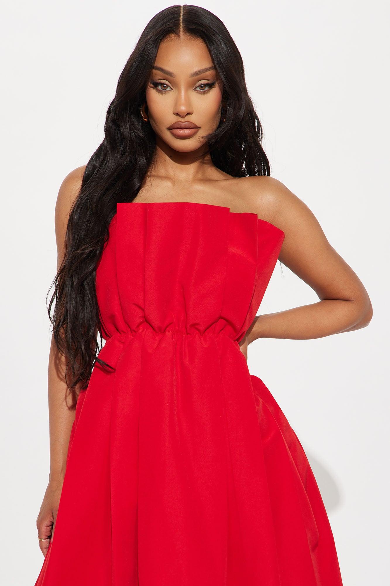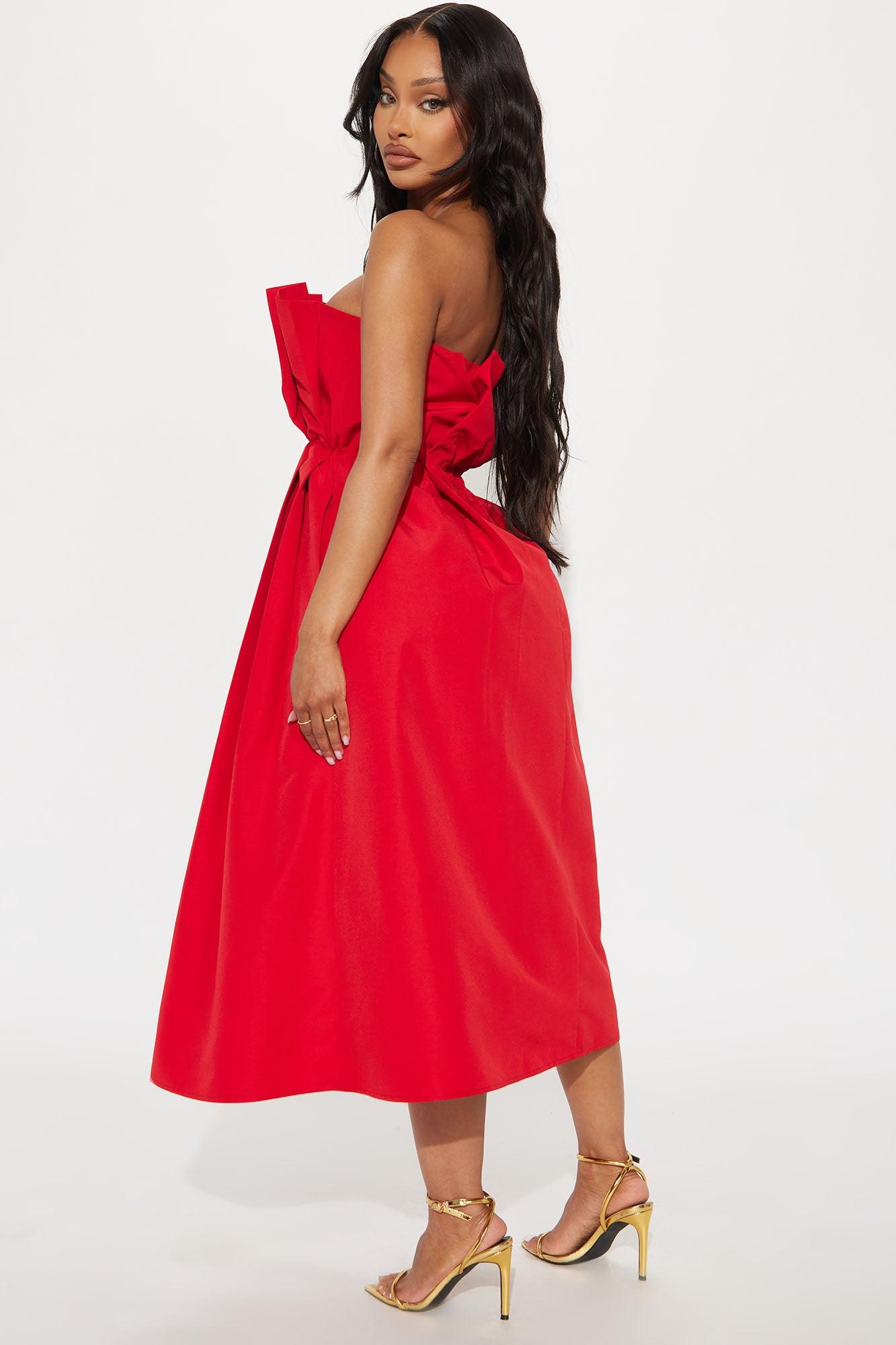 Available In Red. Poplin Midi Dress Straight neckline Strapless Pleated Back zipper Lined Length measured flat = 40" Self : 100% Polyester Contrast 1: 95% Polyester 5% Spandex Contrast 2: 100% Polyester Lining: 97% Polyester 3% Spandex Imported