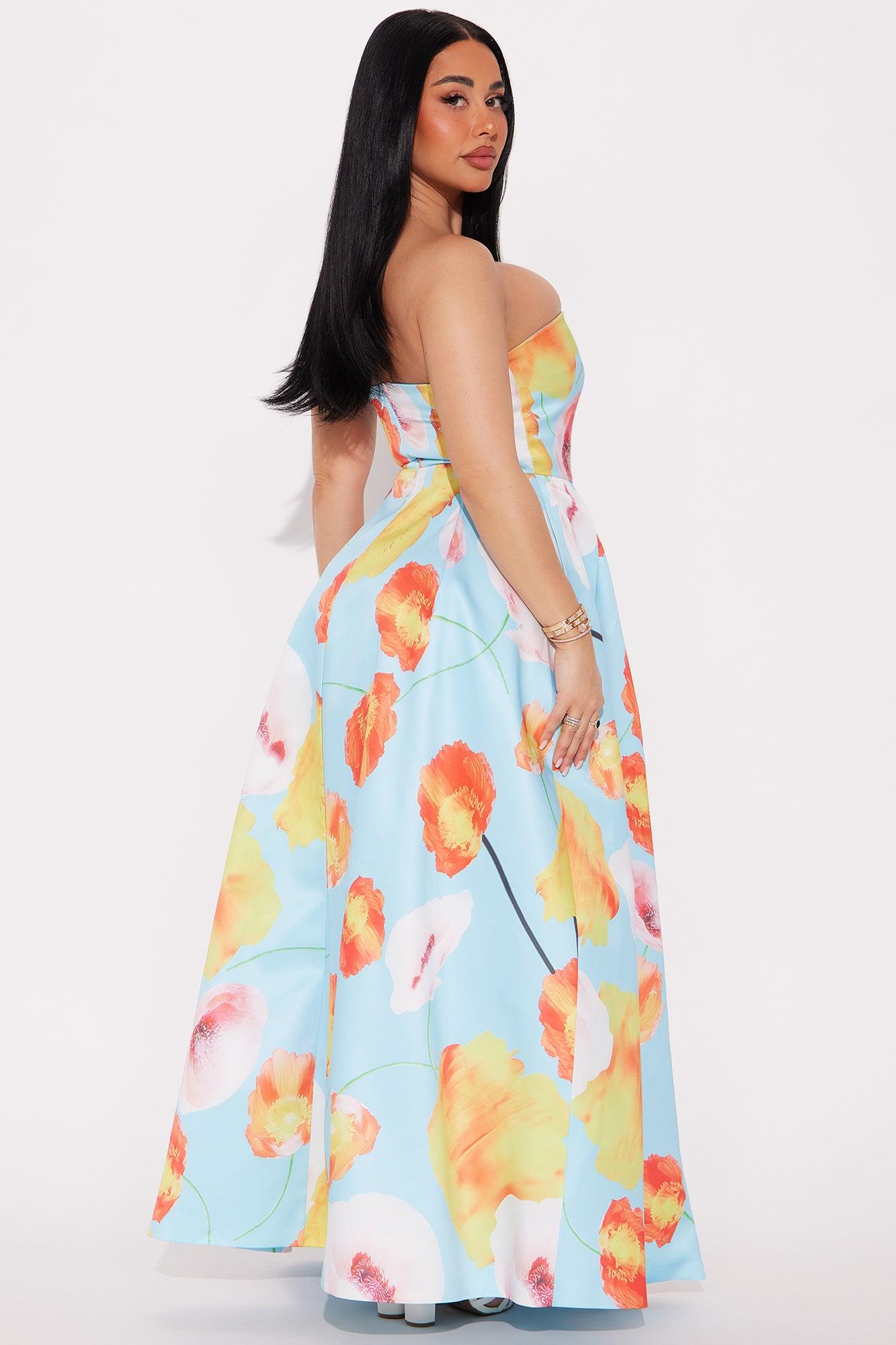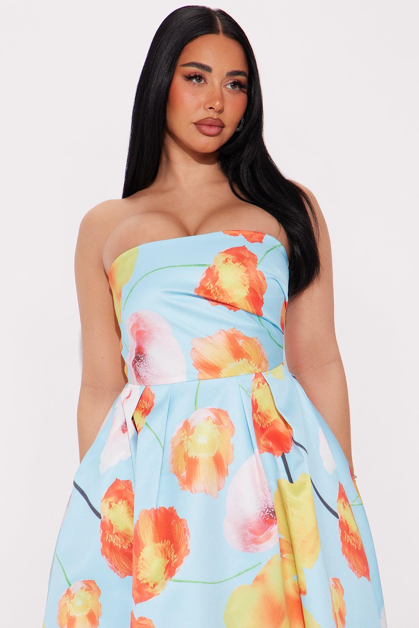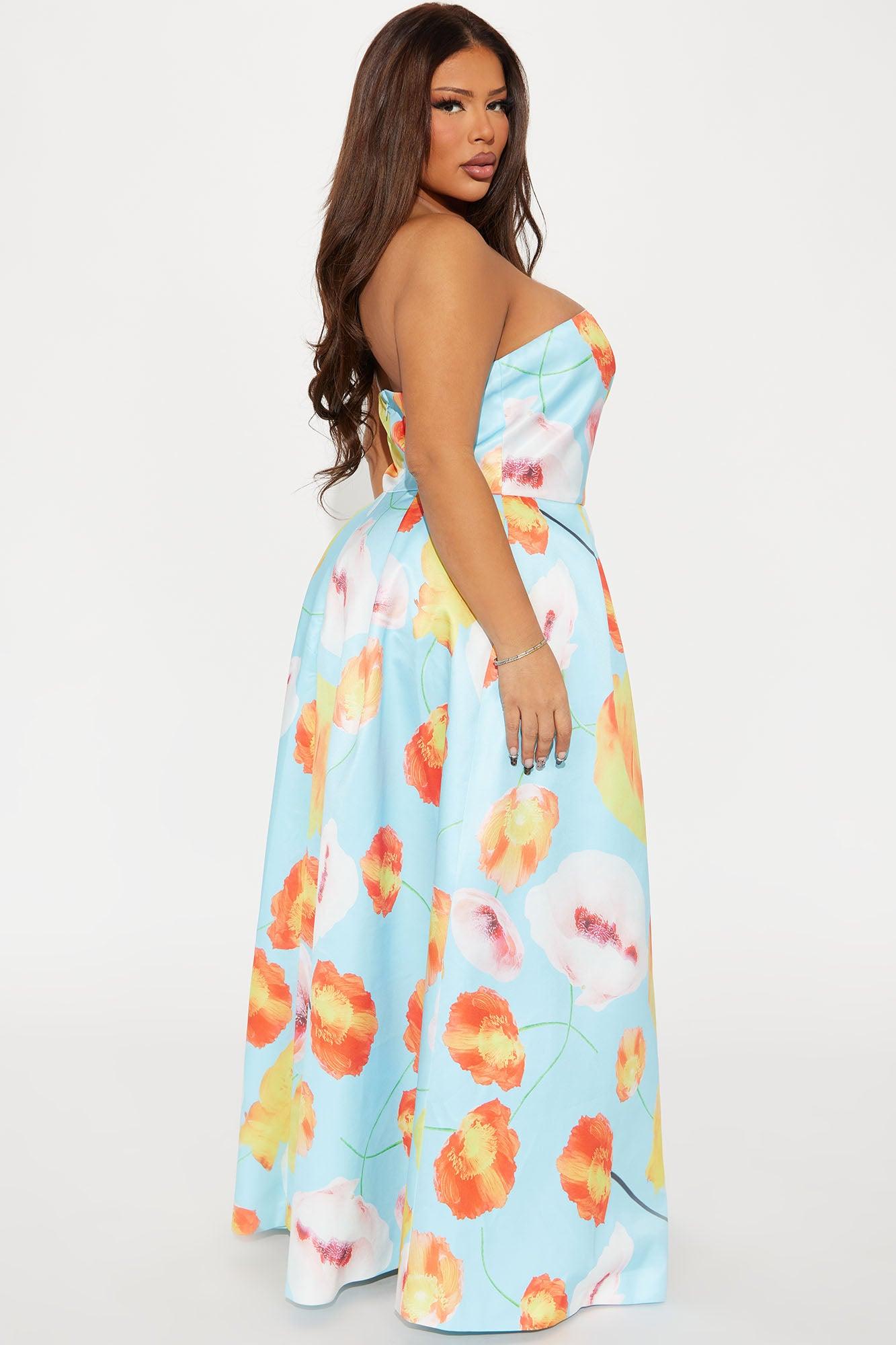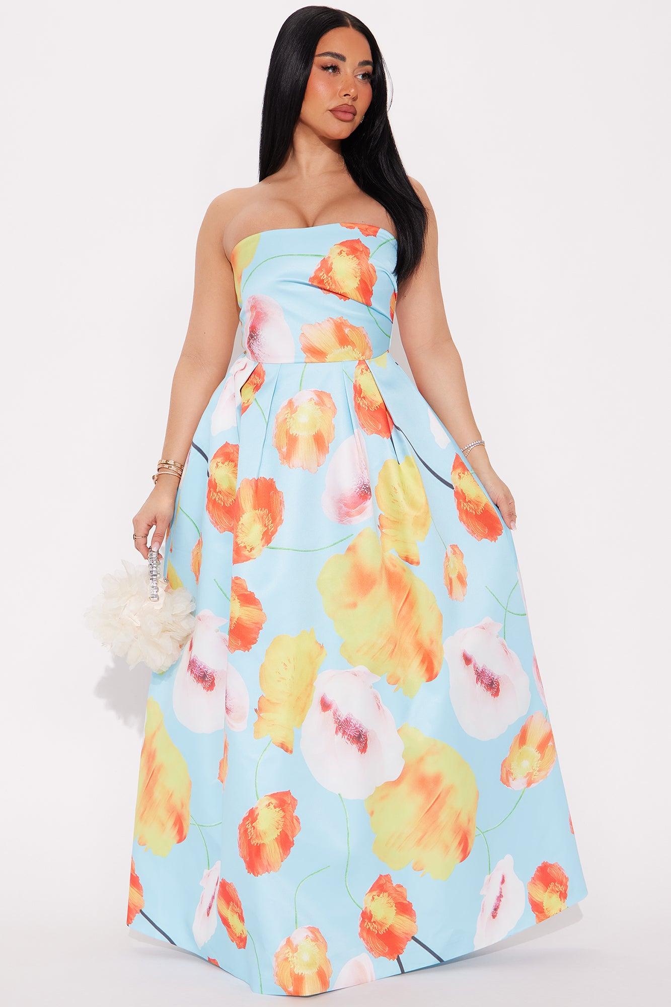 Available In Blue/combo. Floral Maxi Dress Strapless Straight Neckline A Line Silhouette Pleated Skirt Hidden Back Zipper Tulle Underskirt No Stretch Disclaimer: Print Placement Will Vary Shell 95% Polyester 5% Spandex Lining 1&2 100% Polyester Imported