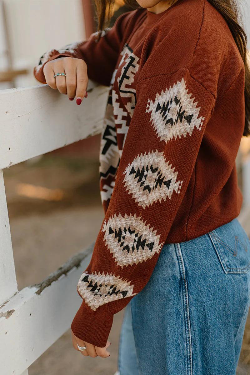 Sterling Kreek Fall Nights Sweater I Gussied Up Online Boutique Stay cozy this season with the Fall Nights Sweater, crafted from high-quality knit for lasting warmth. Its rich rust hue accented with cream, taupe, and black highlights a timeless southwest pattern on both the front and sleeves. Designed to fit true to size, this sweater combines classic style with comfort, making it perfect for chilly autumn evenings. Embrace the season in a piece that feels as good as it looks. Fabric Content: 85% polyester, 10% polyamide, 5% spandex SIZE CHEST LENGTH SLEEVE WIDTH SLEEVE LENGTH XS 21.5" 24.5" 3.5" 20.5" S 22" 25" 3.5" 20.5" M 22.5" 26" 4" 21" L 23" 27" 4" 22" XL 25" 28" 4.5" 22" 2X 26" 29" 4.5" 22" 3X 27.5" 30.5" 5" 23"