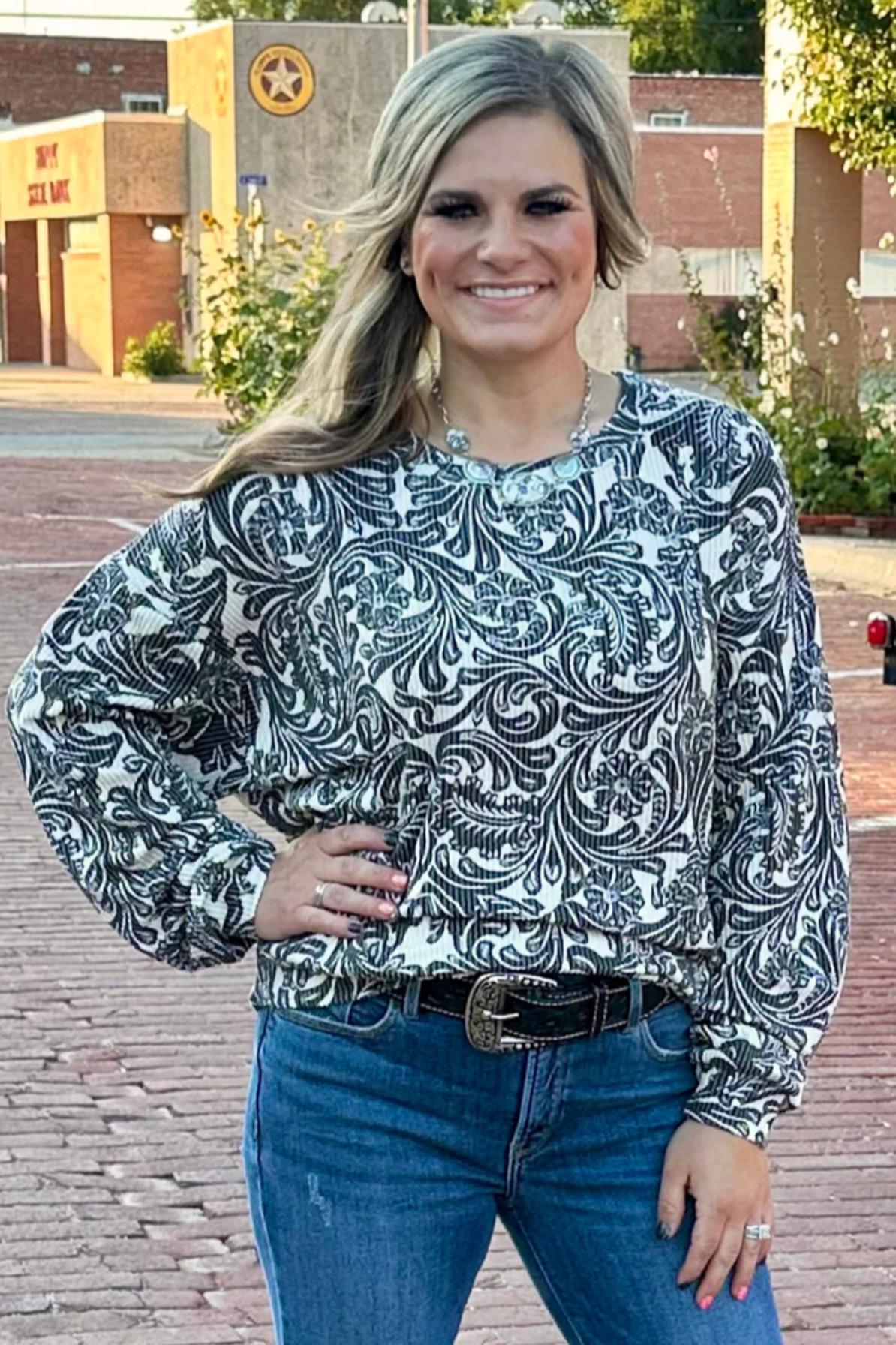 Sterling Kreek Tooled In Love Sweater Top | Gussied Up Online Boutique Wrap yourself in cozy charm with the Tooled In Love Sweater Top. Featuring a soft white ribbed base, this playful piece is accented by a striking black tooled leather print that adds a touch of bold style. Perfect for layering or wearing on its own, it brings a fun twist to your everyday wardrobe. 67% Polyester 25% Rayon 8% Spandex SIZE CHEST LENGTH SLEEVE WIDTH SLEEVE LENGTH XS 23.5" 24" 3.5" 21.5" S 24" 24.5" 3.5" 21.5" M 25" 25" 4" 21.5" L 27" 25" 4.5" 22" XL 28" 26" 4.5" 22" 2X 29" 26" 5" 22" 3X 31" 27" 5" 22.5"