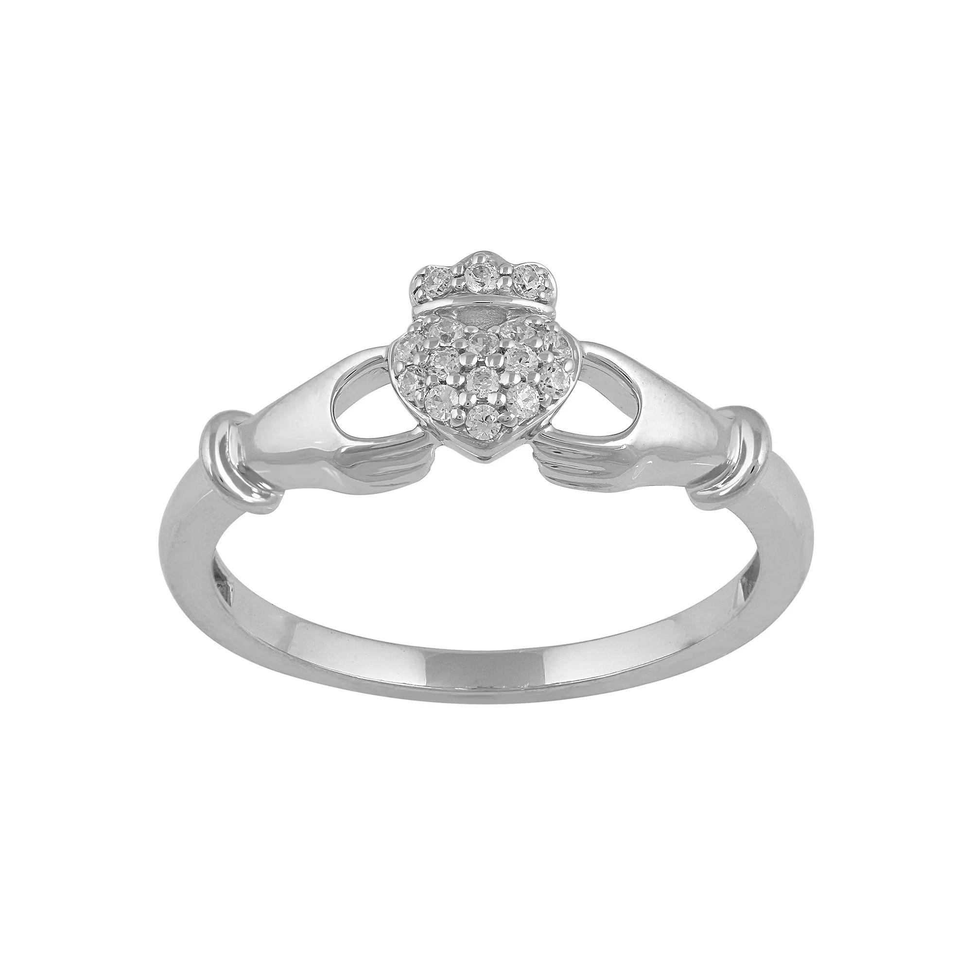 This dazzling sterling silver claddagh ring is the perfect expression of love and loyalty. This dazzling sterling silver claddagh ring is the perfect expression of love and loyalty. Width: 21.6 mm Metal: sterling silver Finish: polished Packaging: boxedDIAMOND DETAILS Total weight: 1/10 ct. Color grade: I-J Clarity: I2-I3 Shape: round brilliant Setting: micro prong Diamond weights are approximate. Diamond total weights may vary between .01 and .08 ct. Some diamonds have fewer than 17 facets. Gemstones may have been treated to enhance their appearance. Special care may be required. Please visit our Gemstone Treatment & Special Care Guide for more information. Image(s) may be enlarged to show detail. Please note, due to the high value of this item, a signature may be required upon delivery. Size: 9. Color: White. Gender: female. Age Group: adult.