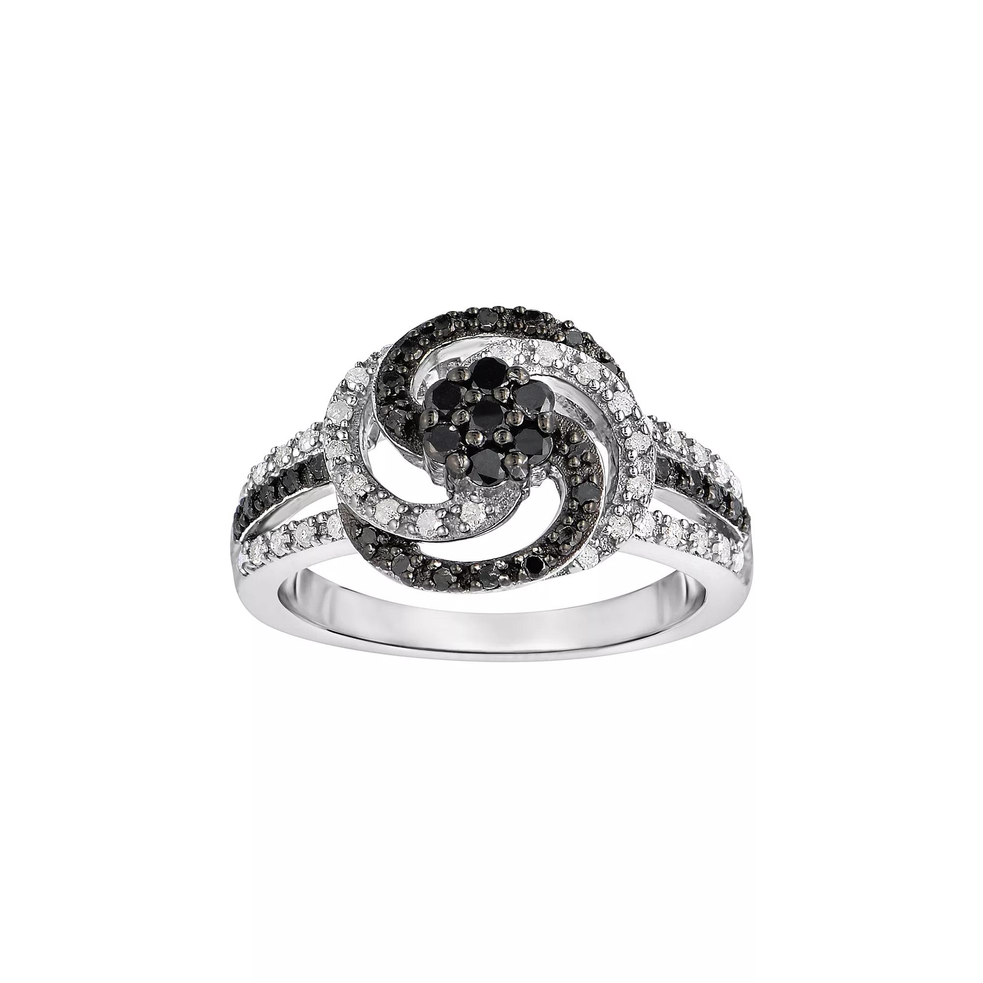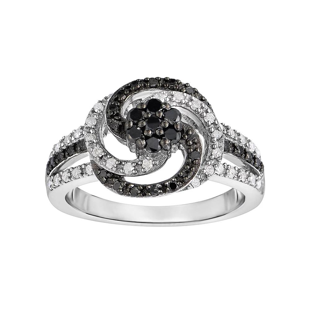 Featuring a floral and swirled motif emphasized with round-cut black and white diamonds, this ring enhances your ensemble with elegant beauty. RING DETAILS Width: .5 in. Metal: sterling silver Plating: black & white rhodium Packaging: boxed DIAMOND...