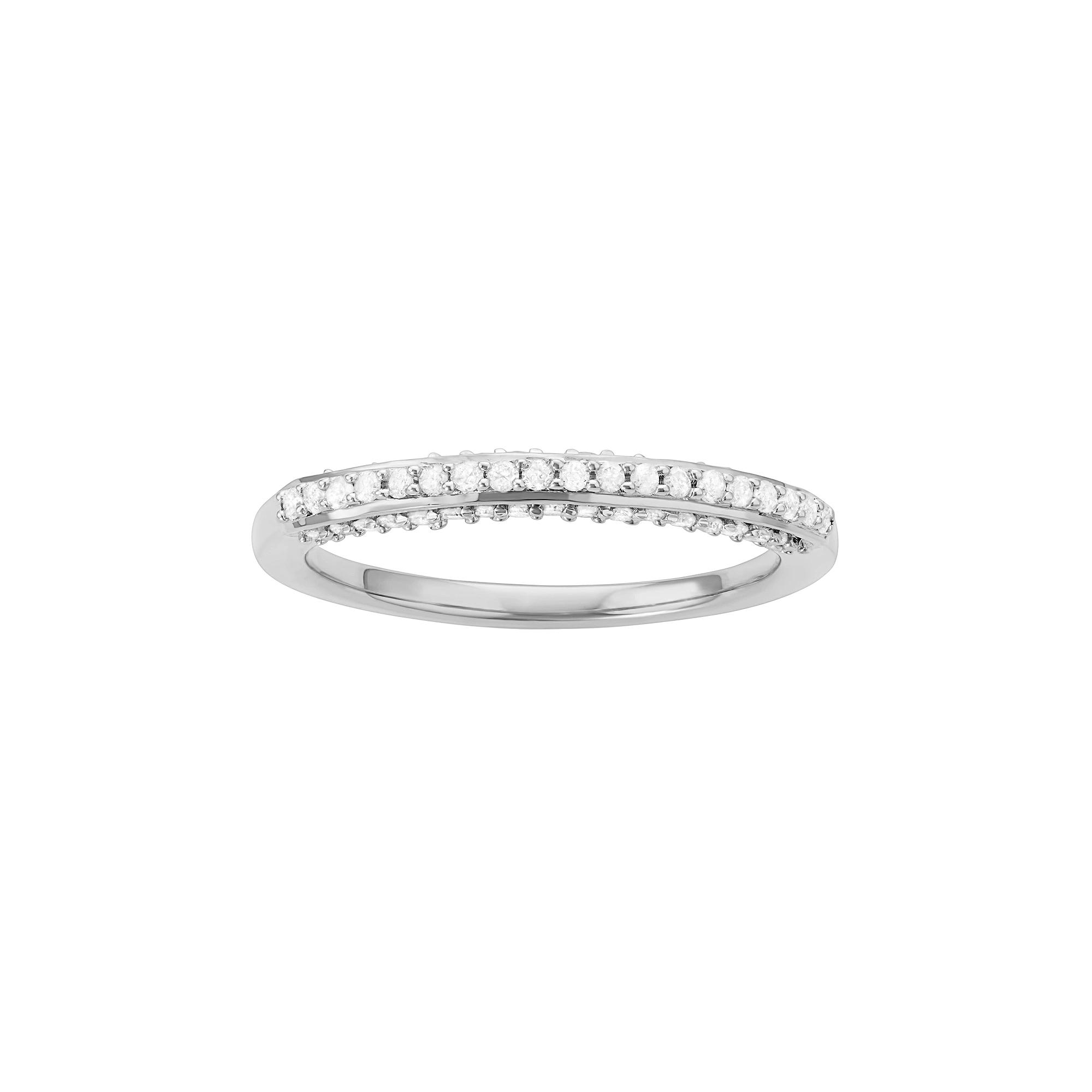 Accentuated with diamonds, this wedding ring beautifully celebrates your everlasting love. RING DETAILS Width: 2.5 mm Metal: sterling silver Plating: rhodium DIAMOND DETAILS Total weight: 1/3 ct. Shape: single cut Color grade: H-I Clarity: I1-I2 Setting: prong Gemstones may have been treated to enhance their appearance. Special care may be required. Please visit our Gemstone Treatment & Special Care Guide for more information. Image(s) may be enlarged to show detail.Diamond weights are approximate. Diamond total weights may vary between .01 and .08 ct. Some diamonds have fewer than 17 facets. Color: White. Gender: female. Age Group: adult. Material: Sterling Silver|Rhodium.