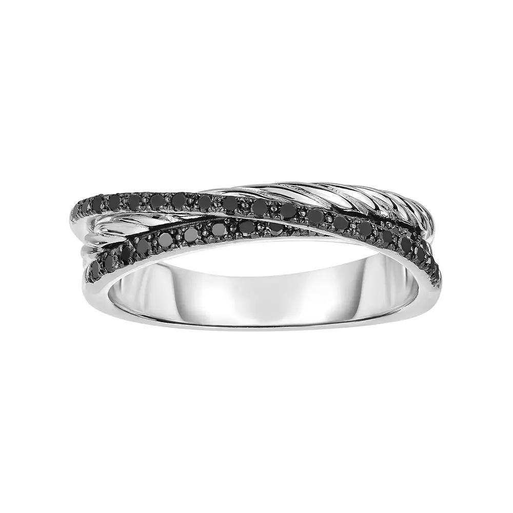 Adorned with bold black diamonds and a modern crisscross design, this sterling silver ring offers stunning style.RING DETAILS Width: 5.4 mm Metal: sterling silver Plating: black & white rhodium Packaging: boxed DIAMOND DETAILS Total weight: 1/4 ct. Shape: round Color: black Setting: pave Gemstones may have been treated to enhance their appearance. Special care may be required. Please visit our Gemstone Treatment & Special Care Guide for more information. Image(s) may be enlarged to show detail. Diamond weights are approximate. Diamond total weights may vary between .01 and .08 ct. Some diamonds have fewer than 17 facets. Size: 6. Gender: female. Age Group: adult.