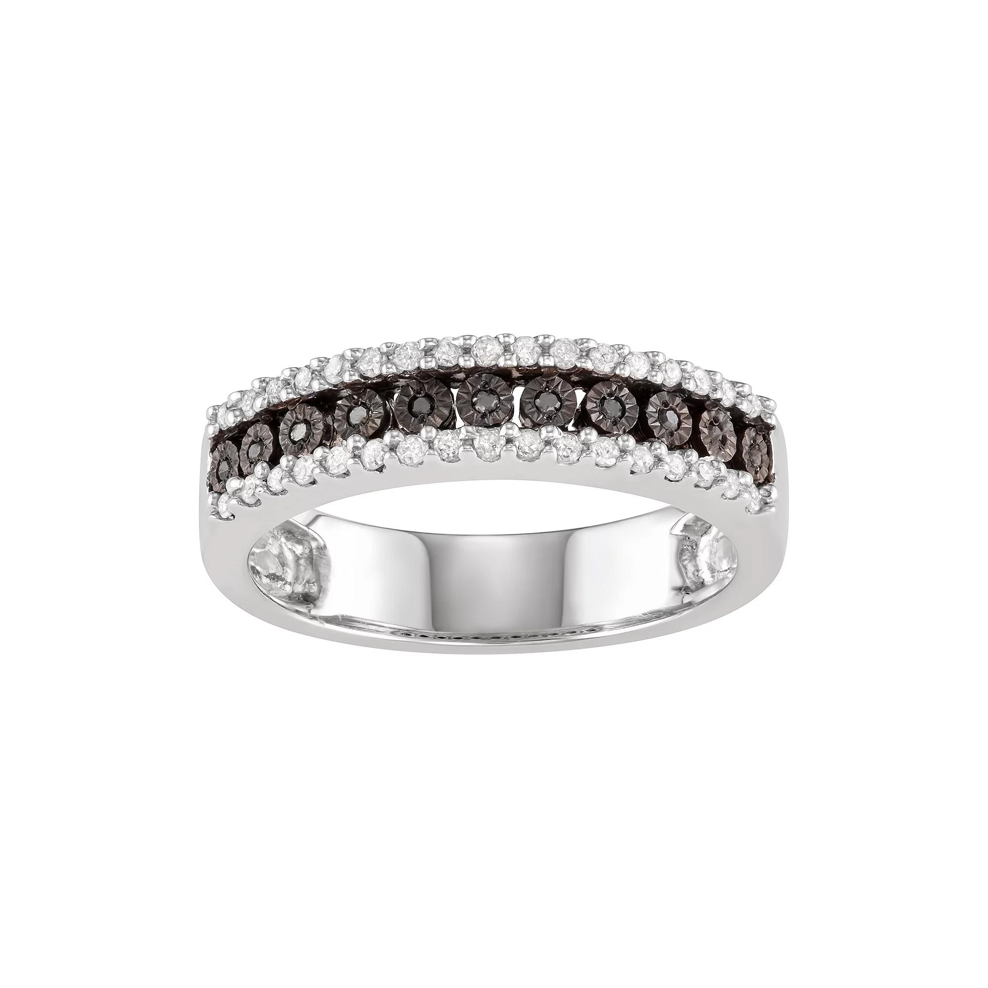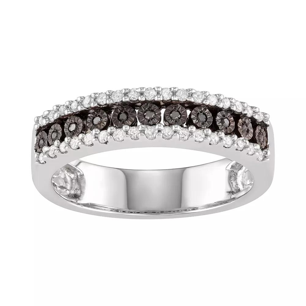 Shimmering black and white diamonds give this ring sensational style. RING DETAILSWidth: 0.19 in. Metal: sterling silverPlating: rhodiumPackaging: boxedDIAMOND DETAILSTotal weight: 1/4 ct.Shape: roundColor: white, blackColor grade: H-IClarity: I1-I2Setting: prongGemstones may have been treated to enhance their appearance. Special care may be required. Please visit our Gemstone Treatment & Special Care Guide for more information.Image(s) may be enlarged to show detail.Diamond weights are approximate. Diamond total weights may vary between .01 and .08 ct. Some diamonds have fewer than 17 facets. Size: 5. Color: Multicolor. Gender: female. Age Group: adult.