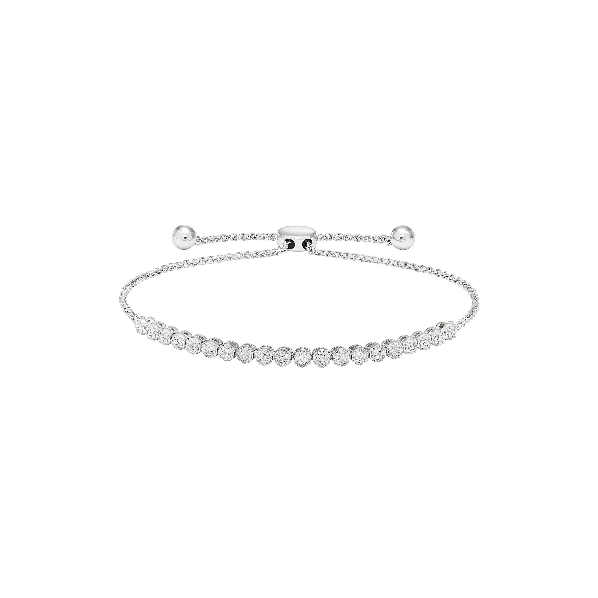 Decorated with clusters of diamond accents, this sterling silver adjustable bolo bracelet gives your outfit scintillating style. BRACELET DETAILS Length: adjusts to 8 in. Metal: sterling silver Plating: rhodium DIAMOND DETAILS Total weight: 1/4 ct. Shape: single cut Color grade: H-I Clarity: I1 Setting: prong Gemstones may have been treated to enhance their appearance. Special care may be required. Please visit our Gemstone Treatment & Special Care Guide for more information.Image(s) may be enlarged to show detail.Diamond weights are approximate. Diamond total weights may vary between .01 and .08 ct. Some diamonds have fewer than 17 facets. Size: 8". Color: White. Gender: female. Age Group: adult. Material: Sterling Silver Rhodium.
