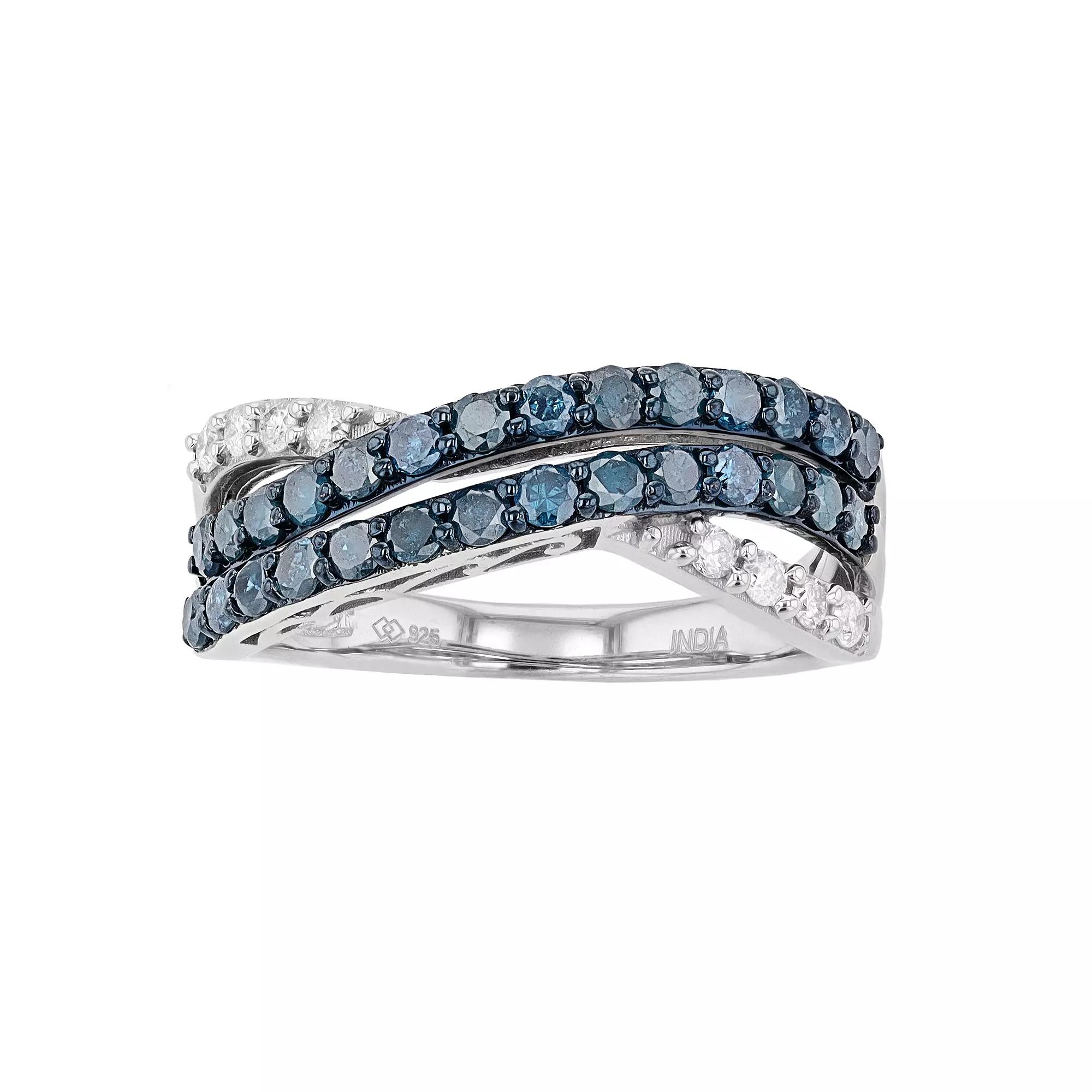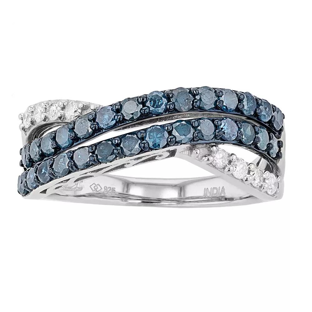 Created with shimmering blue and white diamonds, this sterling silver swirl ring offers a luxurious look. Created with shimmering blue and white diamonds, this sterling silver swirl ring offers a luxurious look. Metal: sterling silver Plating: rhodium Finish: polished Packaging: boxedDIAMOND DETAILS Total weight: 1 ct. Color: blue, white Color grade: I-J Clarity: I2-I3 Shape: round Setting: prong Gemstones may have been treated to enhance their appearance. Special care may be required. Please visit our Gemstone Treatment & Special Care Guide for more information. Diamond weights are approximate. Diamond total weights may vary between .01 and .08 ct. Some diamonds have fewer than 17 facets. Image(s) may be enlarged to show detail. Please note, due to the high value of this item, a signature may be required upon delivery. Size: 9. Gender: female. Age Group: adult.