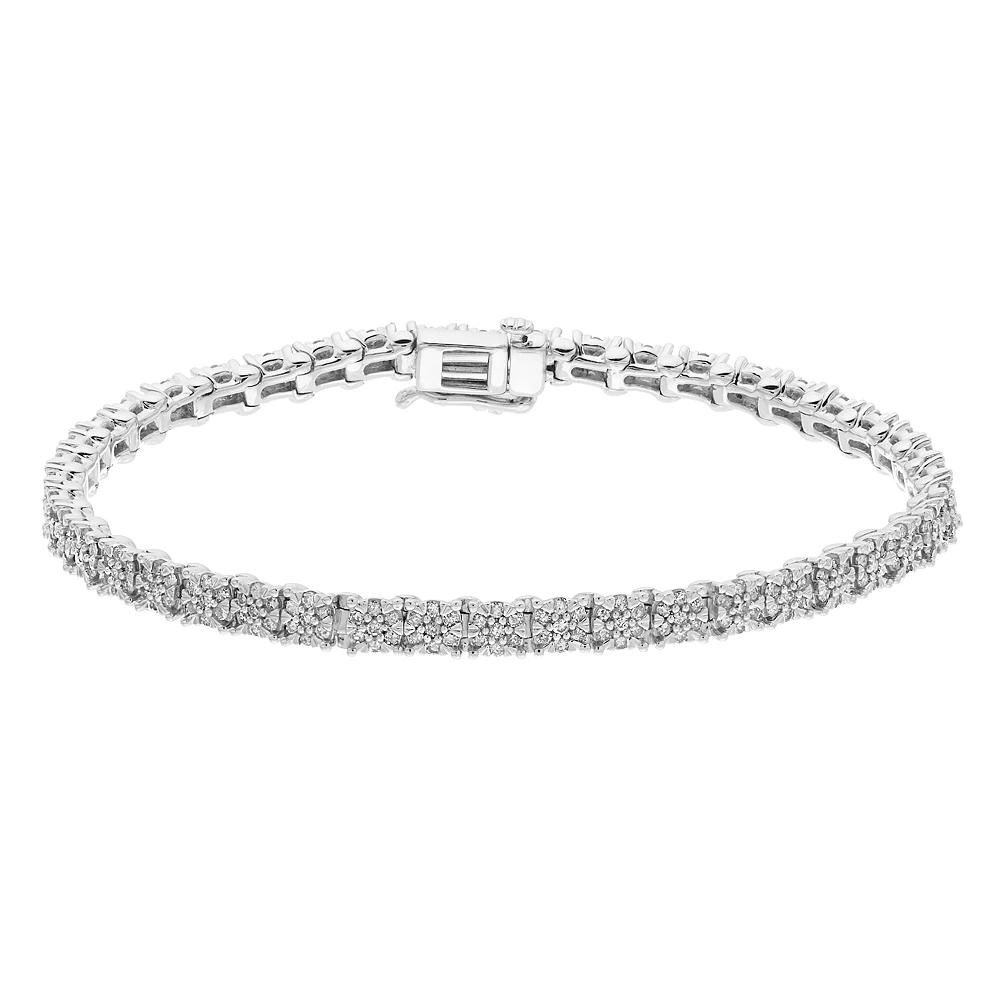 Featuring an elegant diamond cluster design, this sterling silver tennis bracelet radiates sophistication and beauty.BRACELET DETAILS Length: 7-in. Closure: box Metal: sterling silver Plating: rhodium Packaging: boxed DIAMOND DETAILS Total weight: 2 ct. Color: white Color grade: I Clarity: I3 Cut: single Setting: prong Gemstones may have been treated to enhance their appearance. Special care may be required. Please visit our Gemstone Treatment & Special Care Guide for more information.Image(s) may be enlarged to show detail.Diamond weights are approximate. Diamond total weights may vary between .01 and .08 ct. Some diamonds have fewer than 17 facets.Please note, due to the high value of this item, a signature may be required upon delivery. Size: One Size. Gender: female. Age Group: adult.