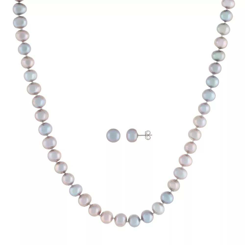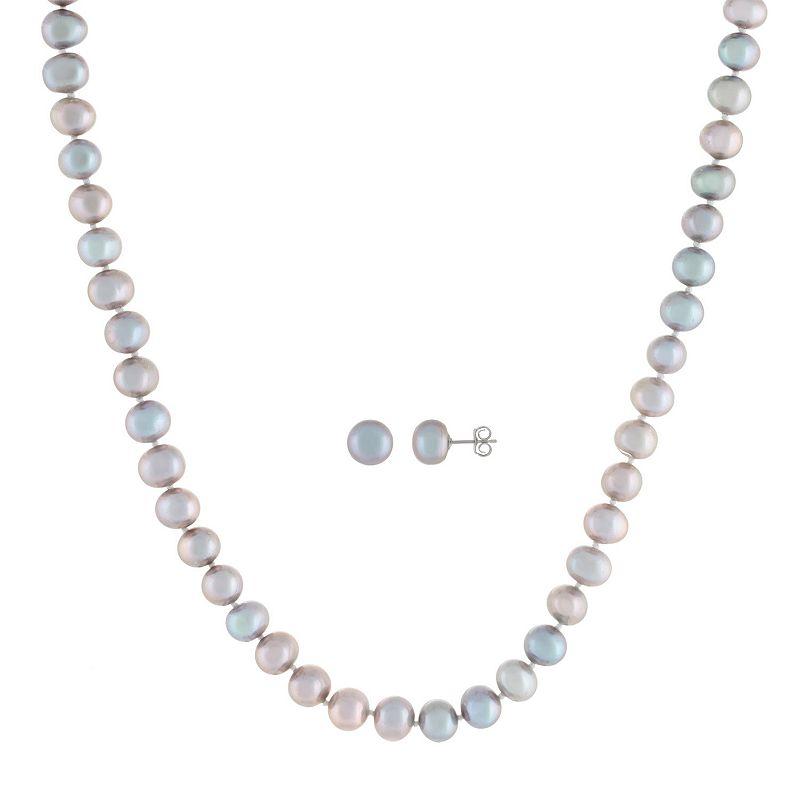 Complete your elegant look with this captivating cultured pearl necklace and stud earring set. Complete your elegant look with this captivating cultured pearl necklace and stud earring set. Chain length: 18 in. Earring backings: post Metal: sterling silver Plating: rhodium Finish: polished Packaging: boxed Includes: necklace & stud earrings Additional features: double security filigree claspCULTURED PEARL DETAILS Type: freshwater Size: 7 mm - 8 mm Shape: button, near round Color: dyed gray Gemstones may have been treated to enhance their appearance. Special care may be required. Please visit our Gemstone Treatment & Special Care Guide for more information. Please note, due to the high value of this item, a signature may be required upon delivery. Size: 18. Color: Grey. Gender: female. Age Group: adult.