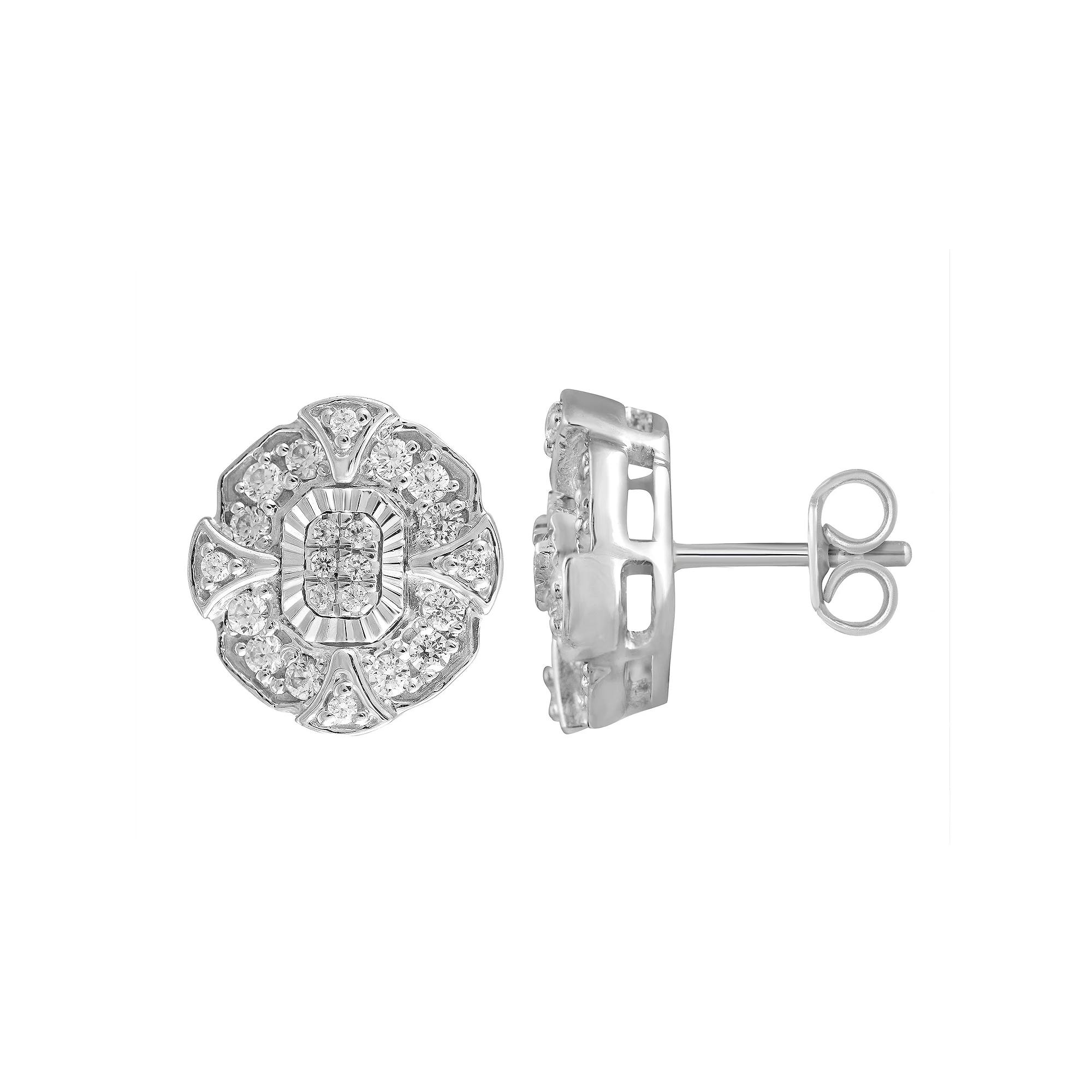 These gorgeous sterling silver diamond cluster stud earrings are the perfect way to finish any outfit. These gorgeous sterling silver diamond cluster stud earrings are the perfect way to finish any outfit. Length: 11.2 mm Backings: push-on screw-off Metal: sterling silver Finish: polished Packaging: boxedDIAMOND DETAILS Total weight: 3/8 ct. Shape: round brilliant Setting: prong Diamond weights are approximate. Diamond total weights may vary between .01 and .08 ct. Some diamonds have fewer than 17 facets. Gemstones may have been treated to enhance their appearance. Special care may be required. Please visit our Gemstone Treatment & Special Care Guide for more information. Image(s) may be enlarged to show detail. Please note, due to the high value of this item, a signature may be required upon delivery. Size: One Size. Color: White. Gender: female. Age Group: adult.